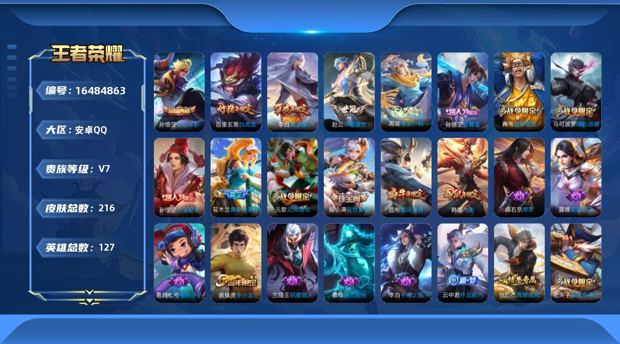 [16484863]保证金商家 安全第一 找回包赔 安卓Q-V7-至尊星耀IV段位-127英雄-213皮肤-1典藏皮肤-3传说-49史诗【荣耀典藏】:孙悟空全息碎影【传说皮肤】:赵云淬星耀世,百里玄策白虎志,李白凤求凰【限定皮肤】:白起狰,狄仁杰阴阳师,虞姬凯尔特女王,赵云皇家上将,墨子神迹守卫,嬴政白昼王子,鲁班七号狮舞东方,高渐离死亡摇滚,阿轲迷踪丽影,芈月重明,吕布猎兽之王,吕布御风骁将,周瑜赤莲之焰,元歌云间偶戏,夏侯惇朔风刀,甄姬游园惊梦,曹操烛龙,典韦穷奇,典韦蓝屏警告,马可波罗暗影游猎,狄仁杰魔术师,狄仁杰万华元夜,达摩星际陆战队,项羽海滩派对,老夫子醍醐杖,老夫子航海奇遇记,程咬金演武夺筹,刘邦夺宝奇兵,韩信飞衡,兰陵王驯魔猎人,花木兰青春决赛季,亚瑟潮玩骑士王,孙悟空至尊宝,孙悟空大圣娶亲,牛魔御旌,李元芳银河之约,李元芳云中旅人,钟馗神迹守卫,钟馗驱傩正仪,杨玉环遇见飞天,女娲朔望之晖,雅典娜单词大作战,蔡文姬繁星吟游,太乙真人饕餮,鬼谷子原初探秘者,百里玄策白虎志,弈星混沌棋,沈梦溪星空之诺,明世隐疑决卦,裴擒虎李小龙,狂铁御狮,米莱狄御霄,米莱狄胡桃异想国,云中君纤云弄巧,盾山御銮,猪八戒西部大镖客,上官婉儿梁祝,蒙犽狂想玩偶喵,姬小满妄想食味,沈梦溪龙舞盛年【年限皮肤】:百里玄策白虎志,李白凤求凰,吕布御风骁将,韩信飞衡【赛季限定】:白起狰,芈月重明,夏侯惇朔风刀,曹操烛龙,典韦穷奇,狄仁杰万华元夜,老夫子醍醐杖,程咬金演武夺筹,牛魔御旌,李元芳云中旅人,虞姬凯尔特女王,钟馗驱傩正仪,太乙真人饕餮,鬼谷子原初探秘者,弈星混沌棋,明世隐疑决卦,狂铁御狮,米莱狄御霄,盾山御銮【战令限定】:墨子神迹守卫,嬴政白昼王子,鲁班七号狮舞东方,阿轲迷踪丽影,吕布猎兽之王,周瑜赤莲之焰,元歌云间偶戏,典韦蓝屏警告,马可波罗暗影游猎,达摩星际陆战队,老夫子航海奇遇记,刘邦夺宝奇兵,兰陵王驯魔猎人,亚瑟潮玩骑士王,李元芳银河之约,钟馗神迹守卫,女娲朔望之晖,雅典娜单词大作战,沈梦溪星空之诺,米莱狄胡桃异想国,猪八戒西部大镖客,蒙犽狂想玩偶喵 【史诗皮肤】:鲁班七号电玩小子,项羽苍穹之光,露娜紫霞仙子,赵云皇家上将,貂蝉圣诞恋歌,王昭君偶像歌手,狄仁杰魔术师,廉颇地狱岩魂,孙尚香水果甜心,妲己魅力维加斯,墨子金属风暴,曹操幽灵船长,李白千年之狐,张飞乱世虎臣,孙悟空至尊宝,刘邦德