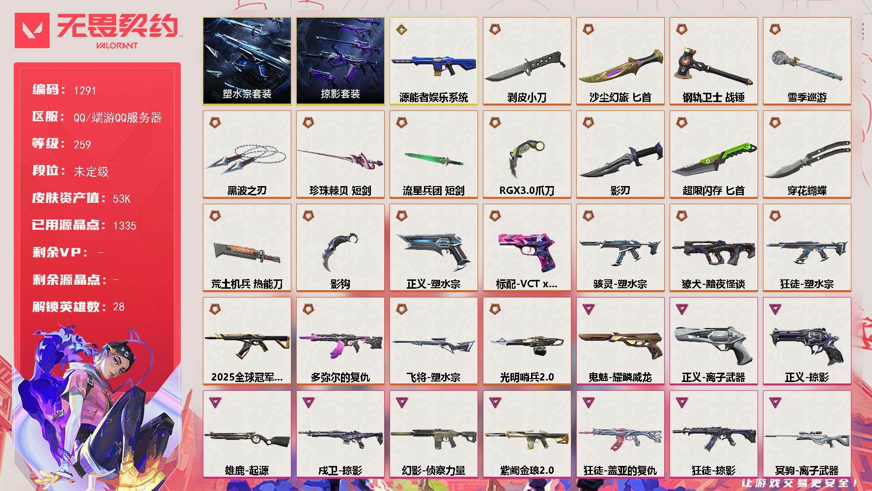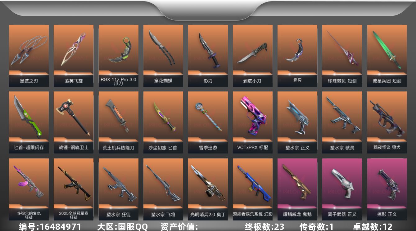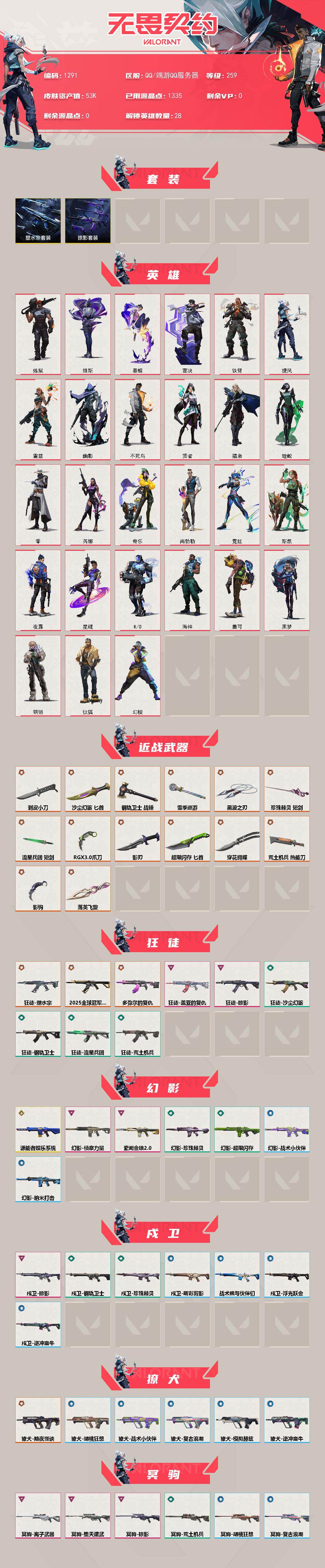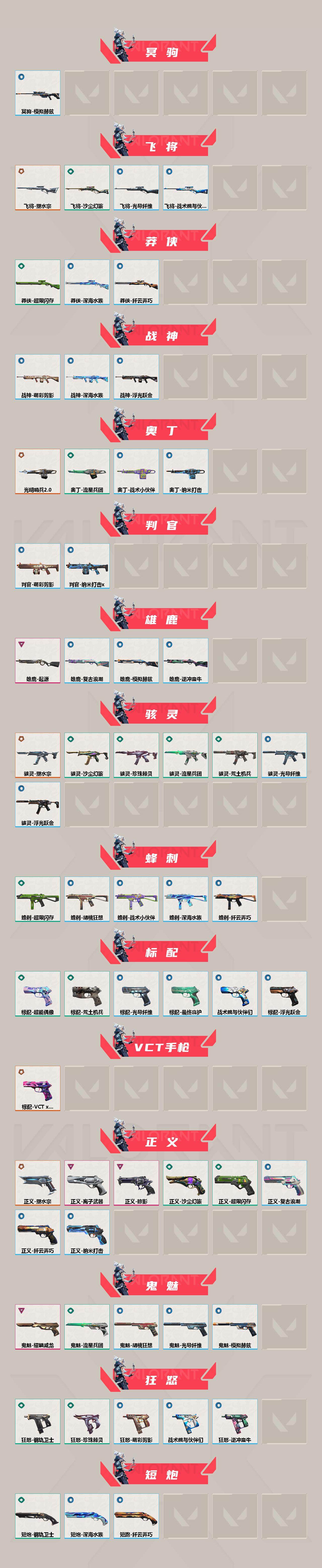 [16484971]【套装】:塑水宗套装,掠影套装 【英雄】:幻棱,炼狱,维斯,暮蝶,钛狐,壹决,铁臂,捷风,雷兹,幽影,不死鸟,贤者,猎枭,蝰蛇,零,芮娜,奇乐,尚勃勒,霓虹,斯凯,夜露,星礈,K/O,海神,盖可,黑梦,钢锁 【近战武器】:近战武器-影钩,近战武器-穿花蝴蝶,近战武器-剥皮小刀,近战武器-RGX 11z Pro//3.0 爪刀,近战武器-黑波之刃,近战武器-落英飞旋,近战武器-珍珠棘贝 短剑,近战武器-流星兵团 短剑,近战武器-超限闪存 匕首,近战武器-钢轨卫士 战锤,近战武器-荒土机兵 热能刀,近战武器-沙尘幻旅 匕首,近战武器-雪季巡游,近战武器-影刃 【狂徒】:狂徒-2025全球冠军赛,狂徒-塑水宗,狂徒-多弥尔的复仇,狂徒-掠影,狂徒-盖亚的复仇,狂徒-钢轨卫士,狂徒-荒土机兵,狂徒-流星兵团,狂徒-沙尘幻旅 【幻影】:幻影-源能者娱乐系统,幻影-侦察力量,幻影-紫阙金琅//2.0,幻影-超限闪存,幻影-珍珠棘贝,幻影-纳米打击,幻影-战术小伙伴 【戍卫】:戍卫-掠影,戍卫-钢轨卫士,戍卫-珍珠棘贝,戍卫-浮光跃金,戍卫-萌彩剪影,戍卫-逆冲蛮牛,戍卫-战术熊与伙伴们 【獠犬】:獠犬-黯夜怪谈,獠犬-复古浪潮,獠犬-胡桃狂想,獠犬-模拟赫兹,獠犬-逆冲蛮牛,獠犬-战术小伙伴 【冥驹】:冥驹-堕天遗武,冥驹-掠影,冥驹-离子武器,冥驹-荒土机兵,冥驹-复古浪潮,冥驹-胡桃狂想,冥驹-模拟赫兹 【飞将】:飞将-塑水宗,飞将-沙尘幻旅,飞将-光导纤维,飞将-战术熊与伙伴们 【莽侠】:莽侠-超限闪存,莽侠-深海水族,莽侠-纤云弄巧 【战神】:战神-浮光跃金,战神-萌彩剪影,战神-深海水族 【奥丁】:奥丁-光明哨兵//2.0,奥丁-流星兵团,奥丁-纳米打击,奥丁-战术小伙伴 【判官】:判官-萌彩剪影,判官-纳米打击x 【雄鹿】:雄鹿-起源,雄鹿-复古浪潮,雄鹿-模拟赫兹,雄鹿-逆冲蛮牛 【骇灵】:骇灵-塑水宗,骇灵-荒土机兵,骇灵-流星兵团,骇灵-沙尘幻旅,骇灵-珍珠棘贝,骇灵-浮光跃金,骇灵-光导纤维 【蜂刺】:蜂刺-超限闪存,蜂刺-胡桃狂想,蜂刺-深海水族,蜂刺-纤云弄巧,蜂刺-战术小伙伴 【标配】:标配-超能偶像,标配-荒土机兵,标配-浮光跃金,标配-光导纤维,标配-战术熊与伙伴们,标配-最终庇护 【VCT手枪】:标配-VCT x PRX 【正义】:正义-塑水宗
