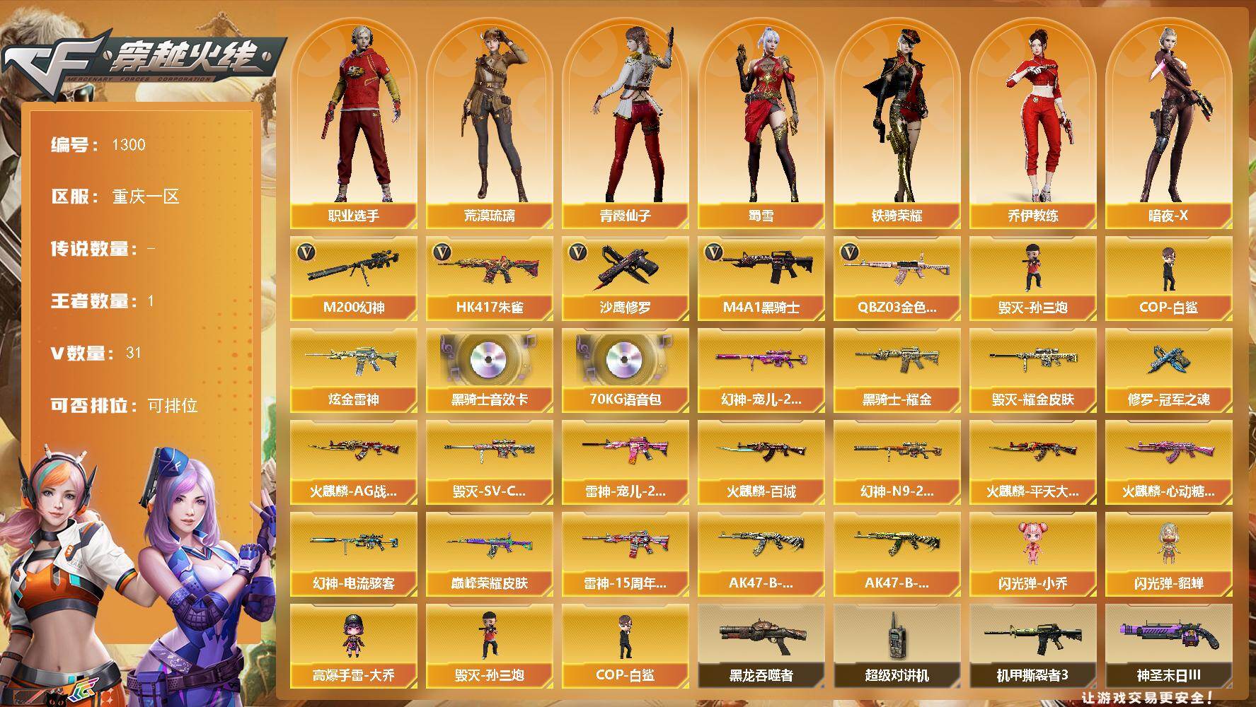 [16487269]重庆一区-31V-1王者-1炫金 【热门武器】:QBZ03-金色蔷薇,HK417-朱雀,M200-幻神,M4A1-黑骑士*2,毁灭-孙三炮,COP-白鲨,沙鹰-修罗*2 【王者炫金武器】:炫金雷神 【音效卡】:M4A1-黑骑士音效卡,70KG语音包 【皮肤】:幻神-宠儿-2021MVP,M200-幻神-N9-2022MVP,幻神-电流骇客 皮肤,QBZ03-巅峰荣耀皮肤,雷神-宠儿-2019MVP,雷神-15周年嘉年华 皮肤,火麒麟-AG战队皮肤,火麒麟-平天大圣,火麒麟-百城,火麒麟-心动糖果,毁灭耀金皮肤,毁灭-SV-CFPLS16冠军,黑骑士耀金皮肤,AK47-B-常胜将军-刘备,AK47-B-常胜将军-孙权,修罗-冠军之魂 【角色】:荒漠琉璃,乔伊教练,暗夜-X,初恋灵狐,风暴女,虎妞,嘉年华灵狐,灵狐者-X,灵狐者-七夕宝贝,龙儿-小淘气,潘多拉-X,潘多拉-甜心教官,青霞仙子,斯沃特-X,蜀雪,铁骑荣耀,新娜塔莎,雪莉杨-摸金校尉,影武者-X,职业选手 【人偶武器】:COP-白鲨,毁灭-孙三炮,闪光弹-小乔,闪光弹-貂蝉,高爆手雷-大乔 【暴走生化】:黑龙吞噬者,超级对讲机 【挑战大师】:AK47-冰龙粉碎者,冰龙粉碎者-白马银枪*2,机甲撕裂者III,试炼破坏者III,神圣爆裂者-末日III*2 【英雄级武器】:M4A1-千变,AK47-火麒麟*2,M4A1-雷神,M4A1-黑骑士*2,AK47-黑武士,HK417-朱雀,QBZ03-金色蔷薇,王者之势-觉醒版,AK-47-猩红传说,黑骑士-海王,AK47-B-常胜将军,AWM-天龙,Barrett-毁灭,M200-幻神,沙鹰-修罗*2,天神-动感闪耀,屠龙*2,麒麟刺,幻灵之锋,高爆手雷-幻灵*2,手雷-动感闪耀,闪光弹-幻灵*2,烟雾弹-幻灵 【道具】:炫彩背包,超级背包,生化弹匣,夺命之镰,防化服,金色流光-枪王排位*2,星辰流光-枪王排位,枪王排位28赛季金色流光,防弹头盔*4,防弹衣*6,C4工具钳*5,手雷包*4 【特殊枪械】:2黑骑士