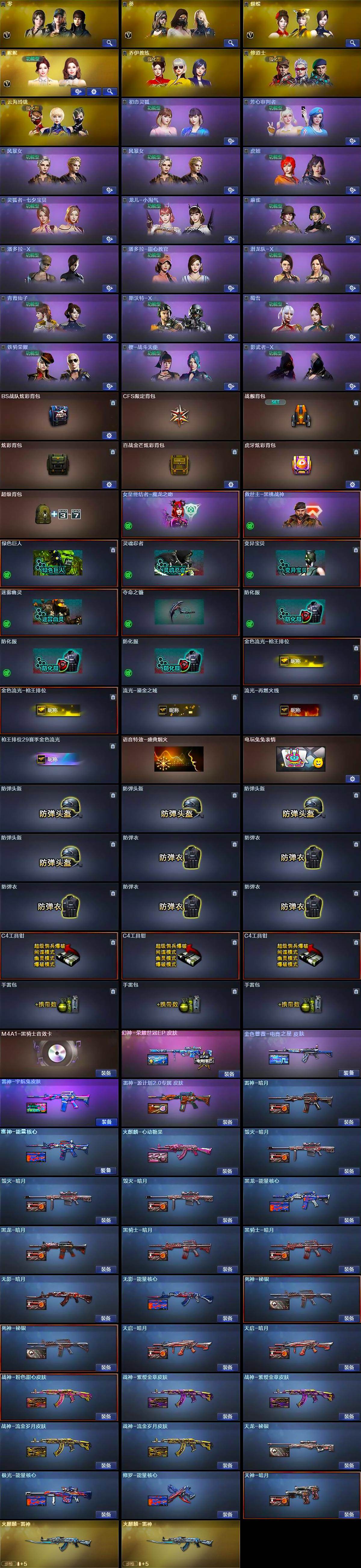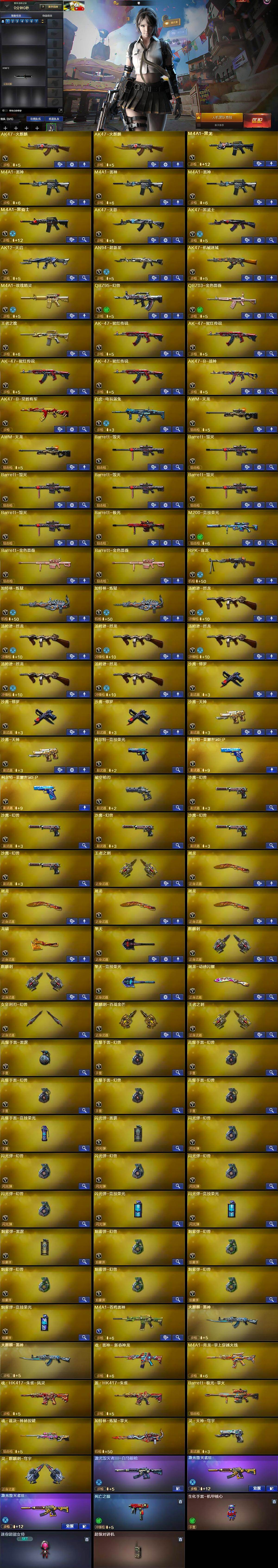 【英雄级武器】:AK47-火麒麟*2,M4A1-黑龙,M4A1-雷神*3,M4A1-黑骑士,AK47-无影,AK47-黑武士,AK12-天启,AN94-超新星,AK47-机械迷城,M4A1-玫瑰精灵,QBZ95-幻兽,QBZ03-金色蔷薇,王者之魄-觉醒版,AK-47-猩红传说*4,AK47-B-战神,AK47-B-常胜将军,白虎-电玩蓝兔,AWM-天龙*2,Barrett-毁灭*6,Barrett-极光,M200-竞技荣光,Barrett-金色蔷薇*2,RPK-盘龙,加特林-炼狱*2,汤姆逊-烈龙*6,沙鹰-修罗*3,沙鹰-天神*2,柯尔特-竞技荣光,柯尔特-荣耀世冠EP*2,破空枪刃,沙鹰-幻兽*5,屠龙*4,龙啸,擎天,麒麟刺*2,擎天-竞技荣光,屠龙-动感闪耀,女皇利刃-幻兽,麒麟刺-百战金芒,王者之刺-觉醒版,高爆手雷-雷霆,高爆手雷-幻兽*5,高爆手雷-竞技荣光,闪光弹-雷霆,闪