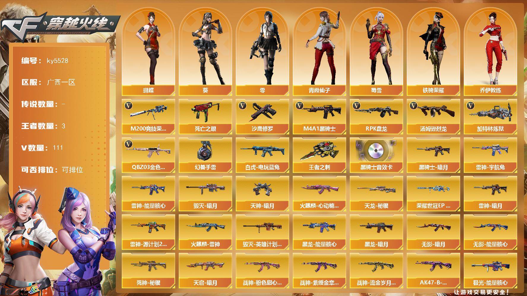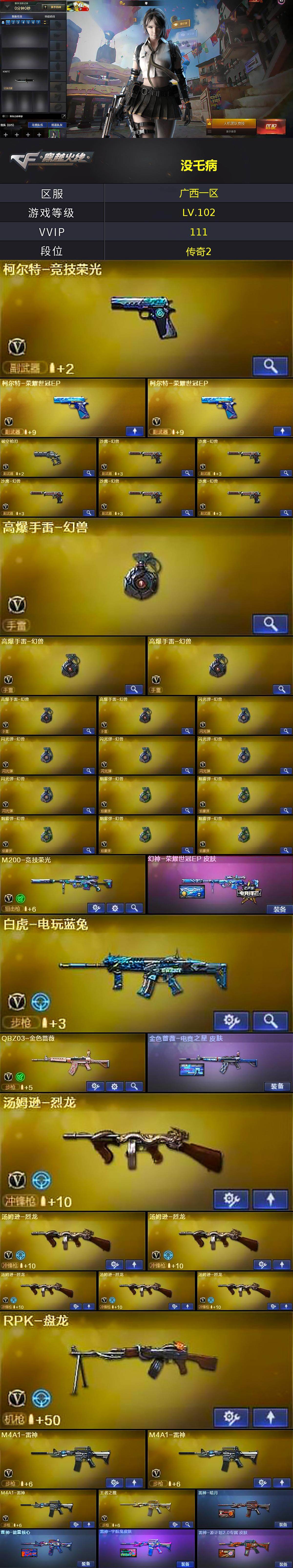 [16488198]广西一区-113V-3王者武器数-0炫金武器数 【热门武器】:QBZ03-金色蔷薇,M200-竞技荣光,死亡之眼,白虎-电玩蓝兔,M4A1-黑骑士,汤姆逊-烈龙*6,RPK-盘龙,加特林-炼狱*2,沙鹰-修罗*3,高爆手雷-幻兽*5 【王者炫金武器】:王者之刺 【音效卡】:M4A1-黑骑士音效卡 【皮肤】:幻神-荣耀世冠EP 皮肤,金色蔷薇-电竞之星 皮肤,雷神-暗月,雷神-能量核心,雷神-宇航兔皮肤,雷神-源计划2.0专属 皮肤,火麒麟-雷神*2,火麒麟-心动糖果,毁灭-暗月*3,毁灭-英雄计划 皮肤,黑龙-能量核心,黑龙-暗月,黑骑士-暗月*2,无影-暗月,无影-能量核心,死神-秘银*2,天启-暗月*2,战神-粉色甜心皮肤,战神-紫绶金章皮肤*2,战神-流金岁月皮肤*2,AK47-B-常胜将军-曹操*2,天龙-秘银,极光-能量核心,修罗-能量核心,天神-暗月,轻型军用手斧-再燃火线 【角色】:零,葵,蝴蝶,妮妮,乔伊教练,修道士,云海玲珑,初恋灵狐,芳心审判者,风暴女*2,虎妞,灵狐者-七夕宝贝,龙儿-小淘气,麻雀,潘多拉-X,潘多拉-甜心教官,潜龙队-X,青霞仙子,斯沃特-X,蜀雪,铁骑荣耀,兔囡囡,樱-战斗天使,影武者-X 【人偶武器】:生化手雷-机甲核心,迷你超能女侍 【暴走生化】:死亡之眼,超级对讲机 【挑战大师】:激光毁灭者III-白马银枪,激光毁灭者III*2 【英雄级武器】:AK47-火麒麟*2,M4A1-黑龙,M4A1-雷神*3,M4A1-黑骑士,AK47-无影,AK47-黑武士,AK12-天启,AN94-超新星,AK47-机械迷城,M4A1-玫瑰精灵,QBZ95-幻兽,QBZ03-金色蔷薇,王者之魄-觉醒版,AK-47-猩红传说*4,AK47-B-战神,AK47-B-常胜将军,白虎-电玩蓝兔,AWM-天龙*2,Barrett-毁灭*6,Barrett-极光,M200-竞技荣光,Barrett-金色蔷薇*2,RPK-盘龙,加特林-炼狱*2,汤姆逊-烈龙*6,沙鹰-修罗*3,沙鹰-天神*2,柯尔特-竞技荣光,柯尔特-荣耀世冠EP*2,破空枪刃,沙鹰-幻兽*5,屠龙*4,龙啸,擎天,麒麟刺*2,擎天-竞技荣光,屠龙-动感闪耀,女皇利刃-幻兽,麒麟刺-百战金芒,王者之刺-觉醒版,高爆手雷-雷霆,高爆手雷-幻兽*5,高爆手雷-竞技荣光,闪光弹-雷霆,闪