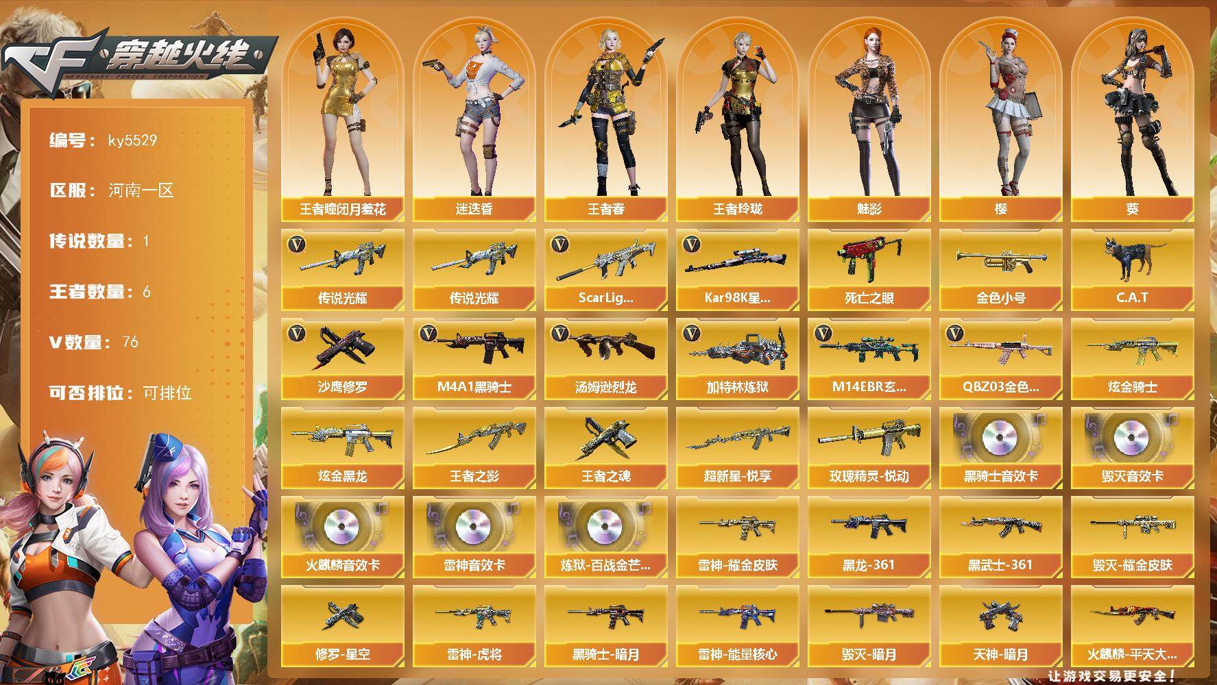 [16489465]河南一区-79V-6王者武器数-2炫金武器数 【传说武器】:传说光耀 【热门武器】:传说光耀,QBZ03-金色蔷薇,M14EBR-玄武,Scar Light-白虎,死亡之眼*2,Kar98K-星神,金色小号,C.A.T,M4A1-黑骑士*5,汤姆逊-烈龙*3,加特林-炼狱*2,沙鹰-修罗*4 【王者炫金武器】:超新星-悦享,玫瑰精灵-悦动,王者之影,王者之魂,炫金骑士,炫金黑龙 【音效卡】:AK47-火麒麟音效卡,M4A1-雷神音效卡,M4A1-黑骑士音效卡,Barrett-毁灭音效卡,炼狱-百战金芒-庆典舞曲音效卡 【皮肤】:雷神-暗月,雷神-能量核心*3,雷神-虎将,雷神-耀金皮肤,M4A1-再燃火线,火麒麟-平天大圣,火麒麟-心动糖果,毁灭-暗月,毁灭耀金皮肤,黑龙-能量核心*2,黑龙-暗月,M4A1-黑龙-361,黑骑士-暗月,黑骑士-电玩青兔皮肤,黑骑士-破界 皮肤,无影-能量核心*2,死神-秘银*2,AK47-黑武士-361,玄武-幻灵装甲 皮肤,天龙-秘银,天龙-能量核心,极光-能量核心*2,修罗-能量核心*3,修罗-星空,天神-暗月,轻型军用手斧-再燃火线,龙啸-幻灵之哮 皮肤 【角色】:葵,樱,魅影,迷迭香,王者-瞳-闭月羞花,王者春,王者玲珑,乔伊教练,云海玲珑,飞虎队-X,风暴女,嘉年华灵狐,葵-赛博朋克,零-水下丽影,灵狐者-X,麻雀,青霞仙子,斯沃特-X,铁骑荣耀,兔囡囡,雪莉杨,影武者-X,游珑儿,雅典娜 【人偶武器】:AWM-灵狐-15周年嘉年华,M37-葵,COP-旗袍,C.A.T,迷你裂空之翼*3,迷你牛魔王,迷你波特博士*4,迷你曼提柯尔,迷你牛牛,迷你火种*3,深渊终结者手雷 【暴走生化】:死亡之眼*2 【挑战大师】:神圣爆裂者III*4,冰龙粉碎者-白马银枪,激光毁灭者III-白马银枪,VEPR-12-金魔*2,激光毁灭者III*2,机甲撕裂者III,神圣爆裂者-末日III,阐释者III*3 【英雄级武器】:M4A1-千变,AK47-火麒麟*2,M4A1-黑龙,M4A1-雷神,M4A1-黑骑士*5,M4A1-死神,AK47-黑武士,AK12-天启,AK47-机械迷城,M4A1-龙血,Scar Light-白虎,M14EBR-玄武,无影-神兵利器,黑武士-锦绣游龙,QBZ03-金色蔷薇,M4A1-猎神,烈火-动感闪耀,王者之心
