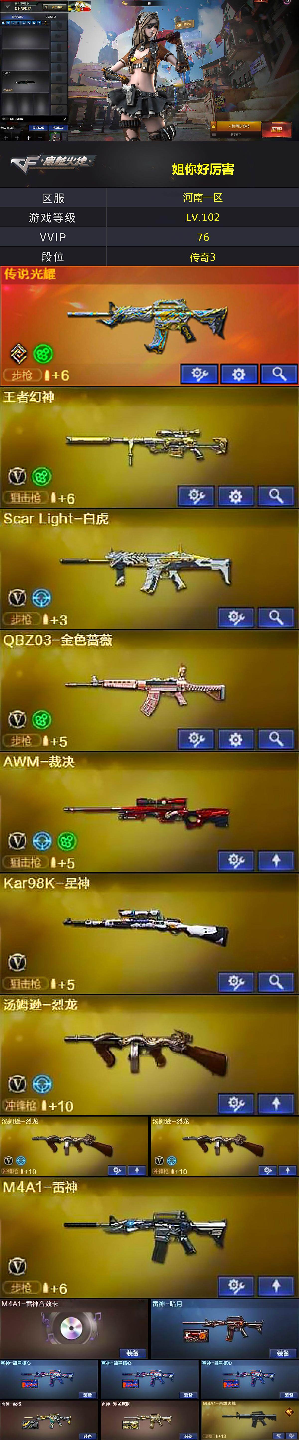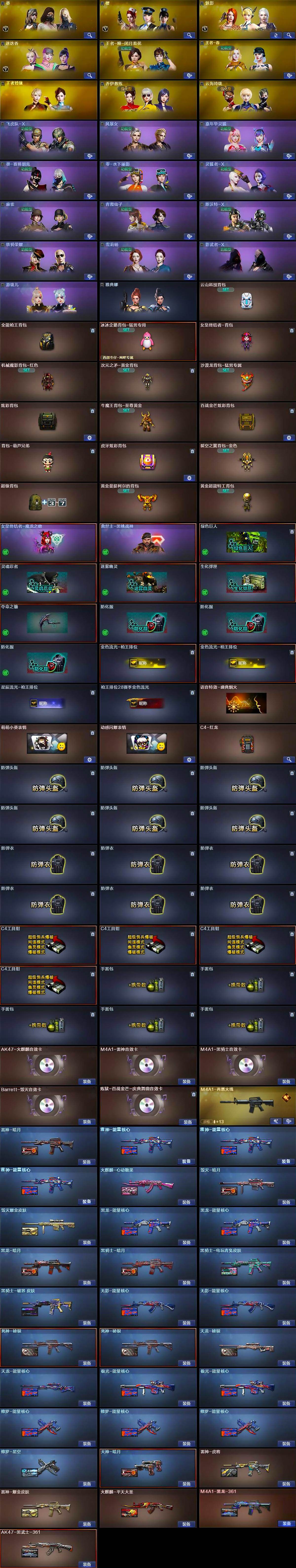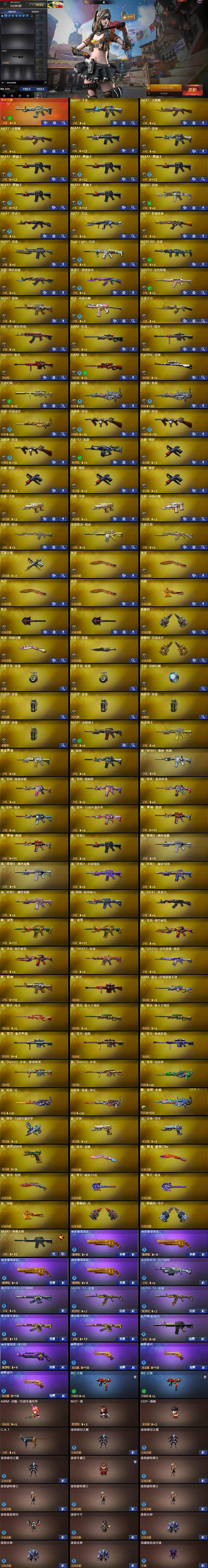 【英雄级武器】:M4A1-千变,AK47-火麒麟*2,M4A1-黑龙,M4A1-雷神,M4A1-黑骑士*5,M4A1-死神,AK47-黑武士,AK12-天启,AK47-机械迷城,M4A1-龙血,Scar Light-白虎,M14EBR-玄武,无影-神兵利器,黑武士-锦绣游龙,QBZ03-金色蔷薇,M4A1-猎神,烈火-动感闪耀,王者之心