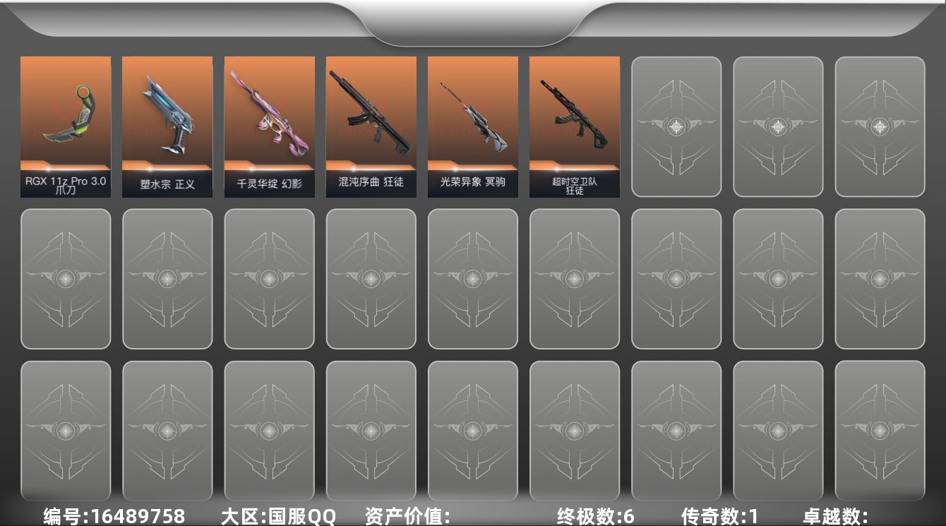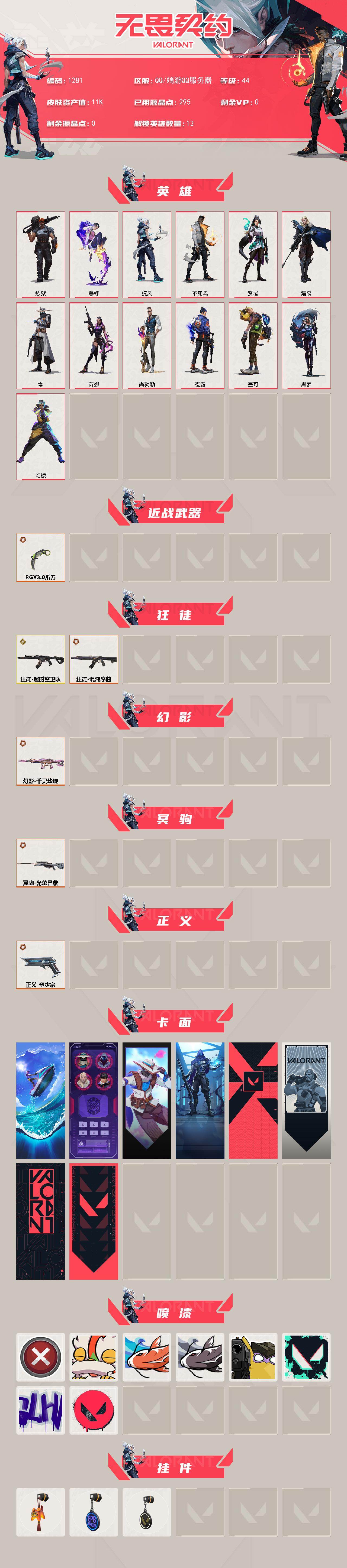 [16489758]【英雄】:幻棱,炼狱,暮蝶,捷风,不死鸟,贤者,猎枭,零,芮娜,尚勃勒,夜露,盖可,黑梦 【近战武器】:近战武器-RGX 11z Pro//3.0 爪刀 【狂徒】:狂徒-超时空卫队,狂徒-混沌序曲 【幻影】:幻影-千灵华绽 【冥驹】:冥驹-光荣异象 【正义】:正义-塑水宗 【卡面】:复古浪潮 卡面,清除名单 卡面,无畏契约GO!第一卷:零 卡面,暗枪 卡面,代号红色 卡面,新兵报到 卡面,V契约 卡面,无畏契约 卡面 【喷漆】:买装还是存钱 喷漆,醒狮贺春 喷漆,红鳞 喷漆,松叶 喷漆,放下武器 喷漆,胜利属于无畏契约 喷漆,GLHF 喷漆,无畏契约 喷漆 【挂饰】:好运福爪 挂饰,第八季//第一幕 纪念币 挂饰,无畏契约 纪念币 挂饰