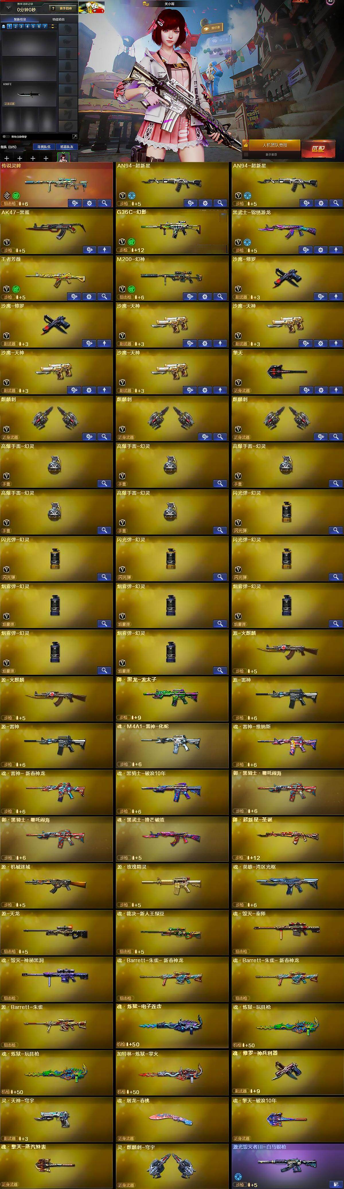 【英雄级武器】:AN94-超新星*2,AK47-黑鲨,G36C-幻影,黑武士-锦绣游龙,王者芳薇-觉醒版,M200-幻神,沙鹰-修罗*2,沙鹰-天神*4,擎天,麒麟刺*3,高爆手雷-幻灵*5,闪光弹-幻灵*4,烟雾弹-幻灵*5
