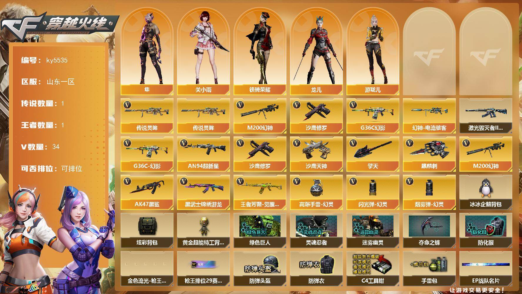 [16490004]山东一区-35V-1王者武器数-0炫金武器数 【传说武器】:传说灵眸 【热门武器】:传说灵眸,G36C-幻影,M200-幻神,沙鹰-修罗*2 【皮肤】:幻神-电流骇客 皮肤 【角色】:关小雨,隼,龙儿,铁骑荣耀,游珑儿 【挑战大师】:激光毁灭者III-白马银枪 【英雄级武器】:AN94-超新星*2,AK47-黑鲨,G36C-幻影,黑武士-锦绣游龙,王者芳薇-觉醒版,M200-幻神,沙鹰-修罗*2,沙鹰-天神*4,擎天,麒麟刺*3,高爆手雷-幻灵*5,闪光弹-幻灵*4,烟雾弹-幻灵*5 【道具】:冰冰企鹅背包,炫彩背包,黄金超能特工背包,绿色巨人,灵魂忍者,迷雾幽灵,夺命之镰,防化服*3,金色流光-枪王排位,星辰流光-枪王排位,枪王排位28赛季金色流光,枪王排位29赛季金色流光,EP战队名片,EP战队喷图,防弹头盔*4,防弹衣*4,C4工具钳*4,手雷包*4 【特殊枪械】: