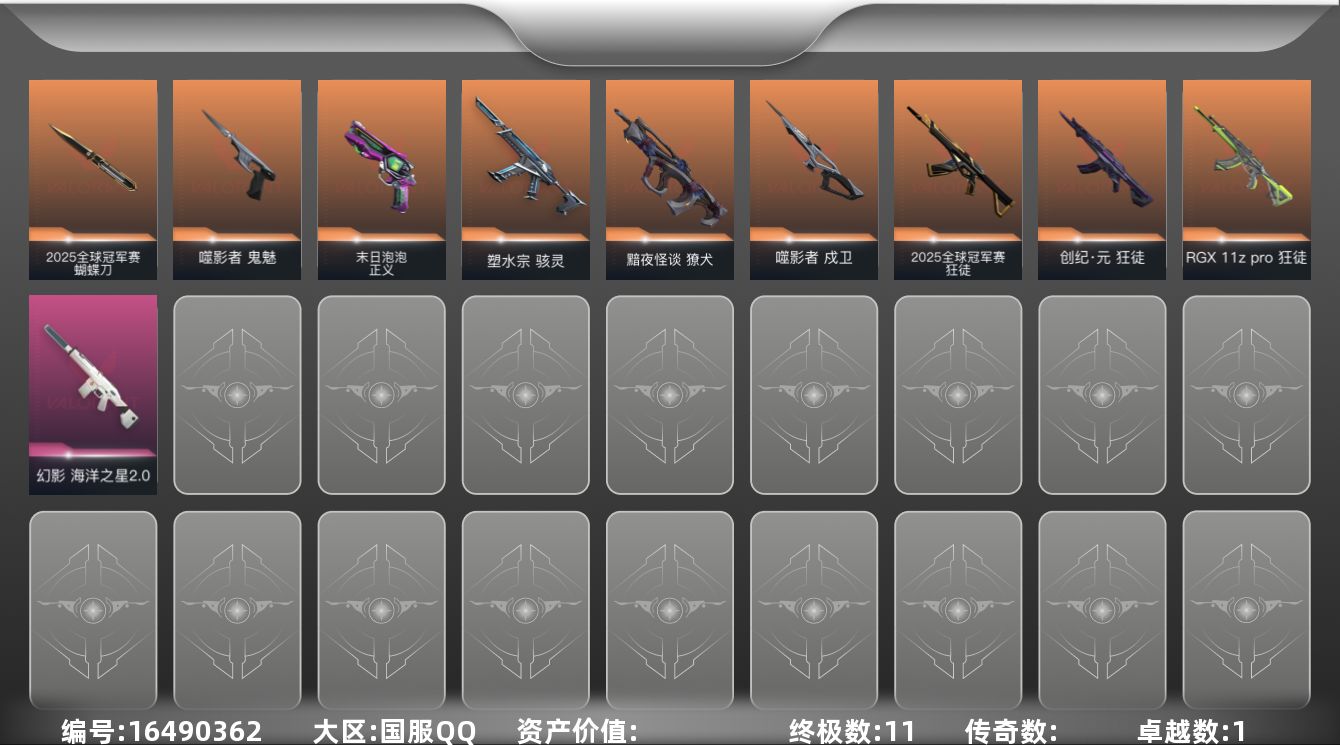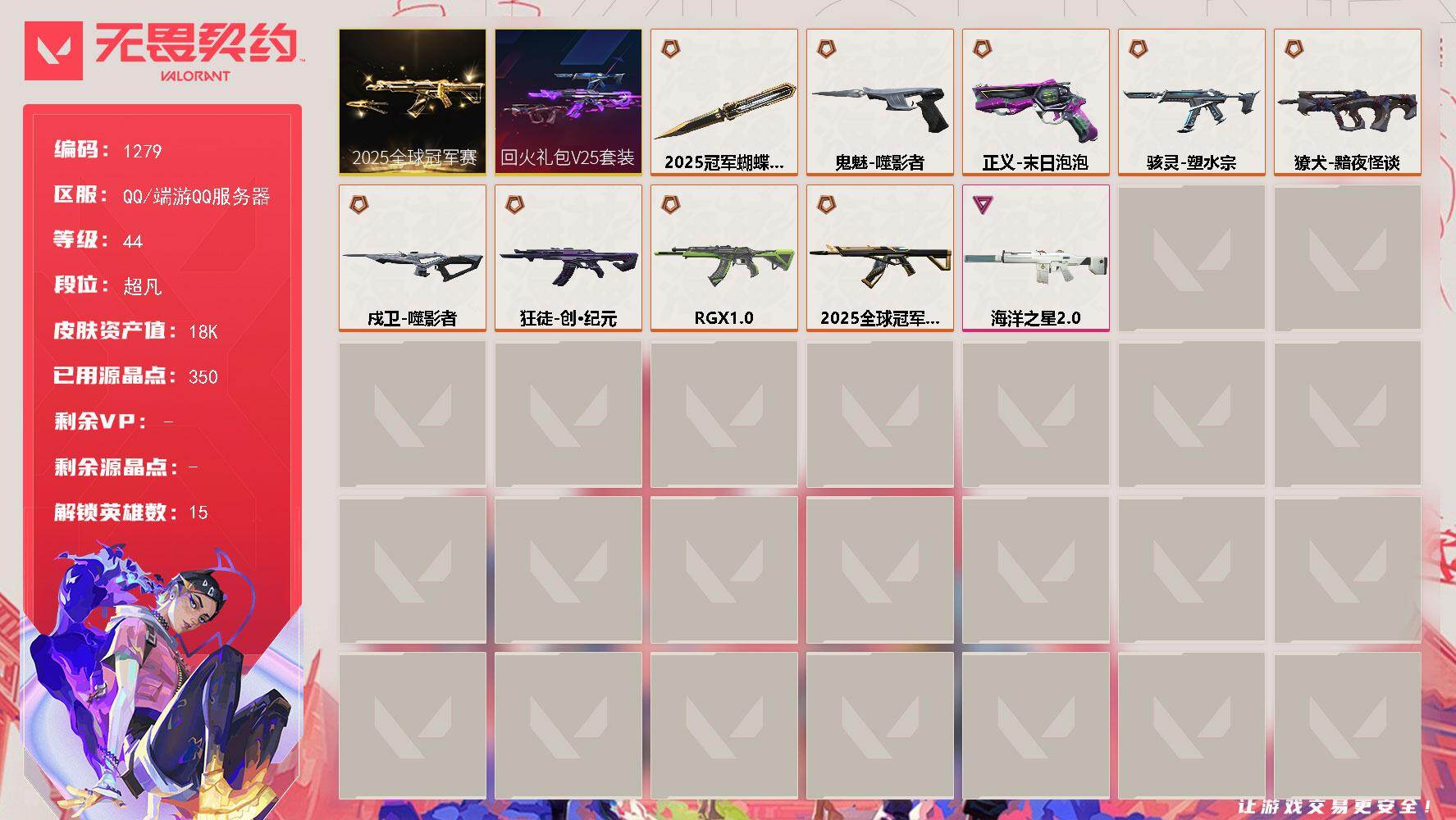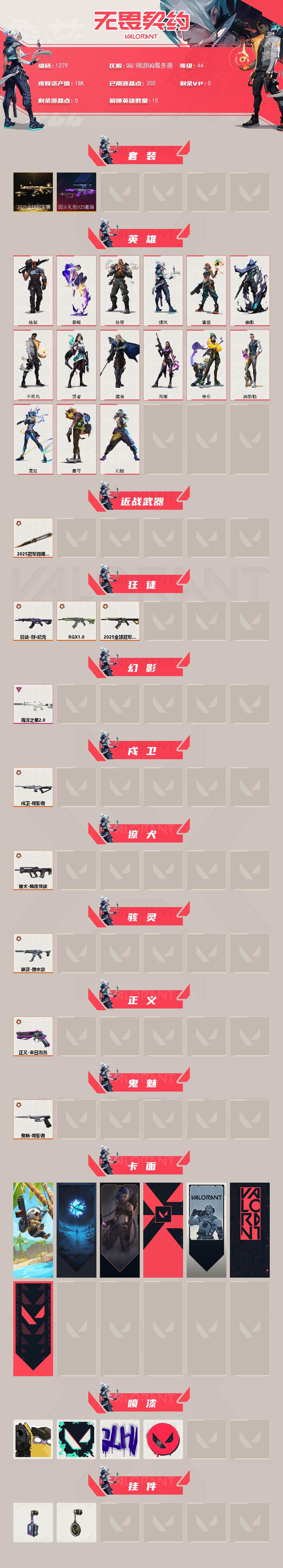 [16490362]【套装】:2025全球冠军赛套装,回火礼包// V25套装 【英雄】:幻棱,炼狱,暮蝶,铁臂,捷风,雷兹,幽影,不死鸟,贤者,猎枭,芮娜,奇乐,尚勃勒,霓虹,盖可 【近战武器】:近战武器-2025全球冠军赛 蝴蝶刀 【狂徒】:狂徒-2025全球冠军赛,狂徒-创·纪元,狂徒-RGX 11z Pro 【幻影】:幻影-海洋之星//2.0 【戍卫】:戍卫-噬影者 【獠犬】:獠犬-黯夜怪谈 【骇灵】:骇灵-塑水宗 【正义】:正义-末日泡泡 【鬼魅】:鬼魅-噬影者 【卡面】:树懒大作战 卡面,无垠星环 卡面,《双城之战》金克丝 卡面,代号红色 卡面,新兵报到 卡面,V契约 卡面,无畏契约 卡面 【喷漆】:放下武器 喷漆,胜利属于无畏契约 喷漆,GLHF 喷漆,无畏契约 喷漆 【挂饰】:动力机箱 挂饰,无畏契约 纪念币 挂饰