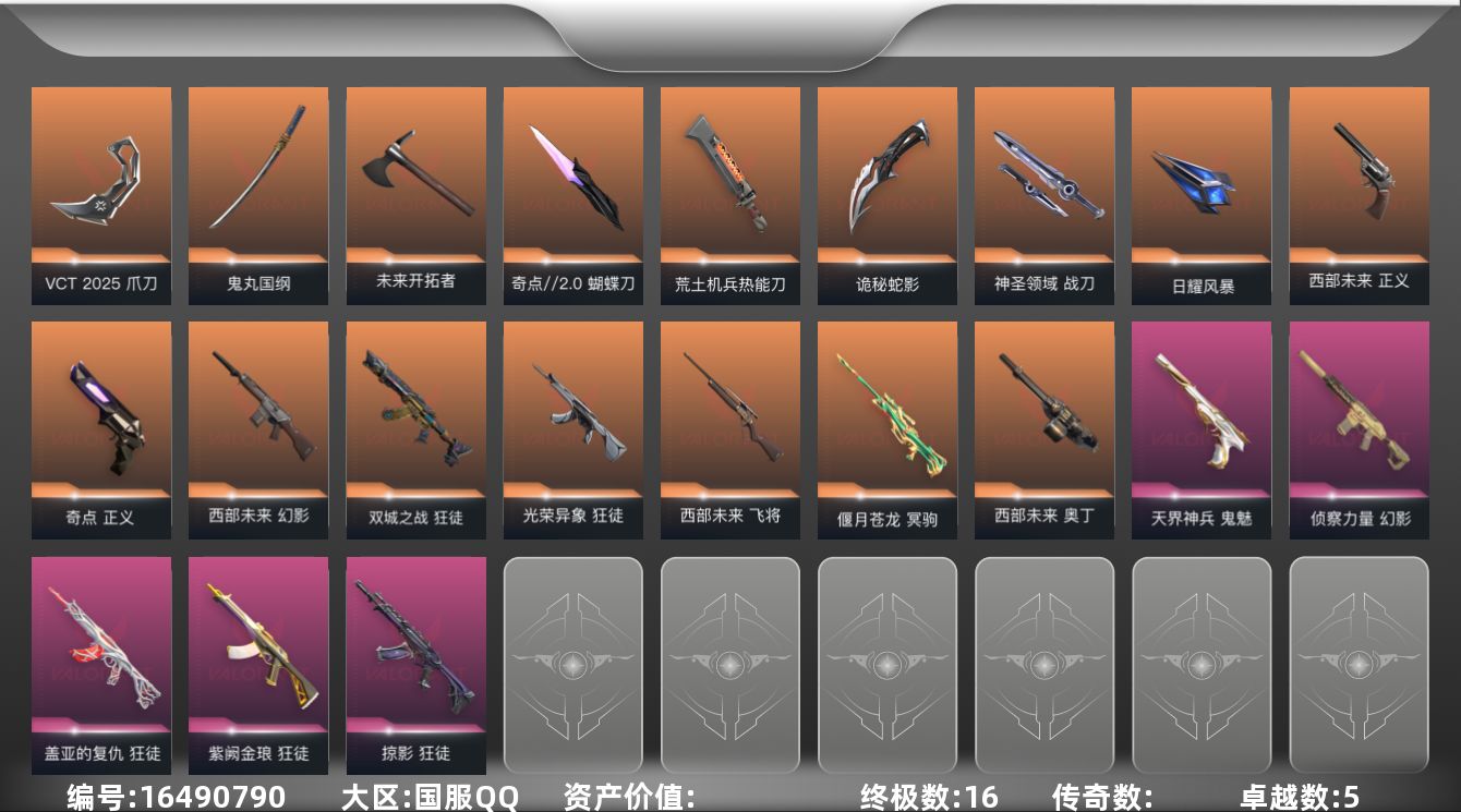 [16490790]【套装】:VCT 2025 赛季套装,西部未来套装 【英雄】:幻棱,炼狱,维斯,暮蝶,钛狐,壹决,铁臂,捷风,雷兹,幽影,不死鸟,贤者,猎枭,蝰蛇,零,芮娜,奇乐,尚勃勒,霓虹,斯凯,夜露,星礈,K/O,海神,盖可,黑梦,钢锁 【近战武器】:近战武器-奇点//2.0 蝴蝶刀,近战武器-VCT 2025 爪刀,近战武器-鬼丸国纲,近战武器-未来开拓者,近战武器-荒土机兵 热能刀,近战武器-诡秘蛇影 军刀,近战武器-神圣领域 战刀,近战武器-日耀风暴 遗器 【狂徒】:狂徒-双城之战,狂徒-光荣异象,狂徒-掠影,狂徒-盖亚的复仇,狂徒-紫阙金琅,狂徒-荒土机兵,狂徒-诡秘蛇影 【幻影】:幻影-西部未来,幻影-侦察力量,幻影-神圣领域,幻影-纳米打击,幻影-末日之翼,幻影-西部未来 【戍卫】:戍卫-逆冲蛮牛,戍卫-月球哨兵,戍卫-折光棱晶 【獠犬】:獠犬-神圣领域,獠犬-逆冲蛮牛 【冥驹】:冥驹-偃月苍龙,冥驹-荒土机兵,冥驹-星云暗涌 【飞将】:飞将-西部未来,飞将-末日之翼 【莽侠】:莽侠-诡秘蛇影,莽侠-月球哨兵 【战神】:战神-神圣领域 【奥丁】:奥丁-西部未来,奥丁-纳米打击,奥丁-末日之翼 【判官】:判官-诡秘蛇影,判官-纳米打击x 【雄鹿】:雄鹿-逆冲蛮牛,雄鹿-月球哨兵 【骇灵】:骇灵-荒土机兵,骇灵-星云暗涌 【蜂刺】:蜂刺-星云暗涌,蜂刺-折光棱晶 【标配】:标配-荒土机兵,标配-折光棱晶 【正义】:正义-奇点,正义-西部未来,正义-纳米打击,正义-月球哨兵 【鬼魅】:鬼魅-天界神兵,鬼魅-诡秘蛇影,鬼魅-星云暗涌 【狂怒】:狂怒-神圣领域,狂怒-逆冲蛮牛 【短炮】:短炮-末日之翼 【卡面】:终章:激斗汉堡 卡面,进入射程 卡面,分崩离析 卡面,纳米打击 卡面,抑制技术 卡面,激斗汉堡 卡面,瓦娃脸雪糕 P2 卡面,从黄昏到黎明 卡面,荒土机兵 卡面,银弹猎手 卡面,逆冲蛮牛 卡面,《双城之战》拥抱 卡面,精灵大战 卡面,欢迎来到底城 卡面,南瓜盛典 卡面,VCT CN首冠 卡面,修车达人 卡面,热舞环节 卡面,正义的化身 卡面,时间到 卡面,最高舞台 卡面,声感陷阱设计图 卡面,梦幻奶茶 卡面,战术熊与伙伴们 卡面,无畏契约GO!第一卷:芮娜 卡面,无畏契约GO!第一卷:零 卡面,比比看谁快? 卡面,《双城之战》金克丝 卡面,势不可挡//盖可 卡面,