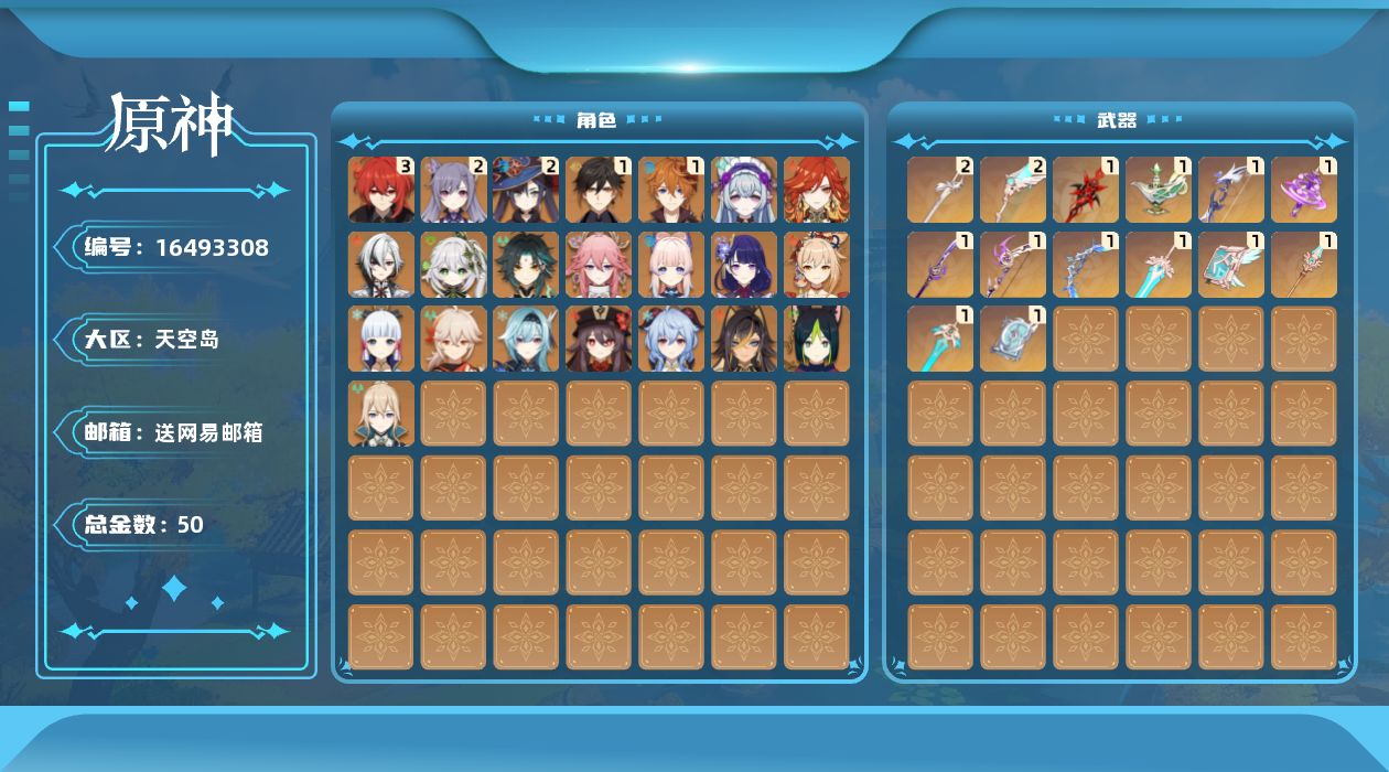 0命阿蕾奇诺,0命迪希雅,0命纳西妲,0命提纳里,0命八重神子,0命优菈,0命雷电将军,0命枫原万叶,0命神里绫华,1命钟离,0命胡桃,0命甘雨,0命魈,0命宵宫,1命达达利亚,0命珊瑚宫心海,2命刻晴,0命琴,2命莫娜,3命迪卢克,0命玛薇卡,0命梦见月瑞希,0命杜林,精1赤月之形,精1千夜浮梦,精1若水,精1神乐之真意,精1冬极白星,精1薙草之稻光,精1飞雷之弦振,精1四风原典,精1天空之脊,精2天空之翼,精1天空之刃,精1天空之卷,精2风鹰剑,精1天空之傲
