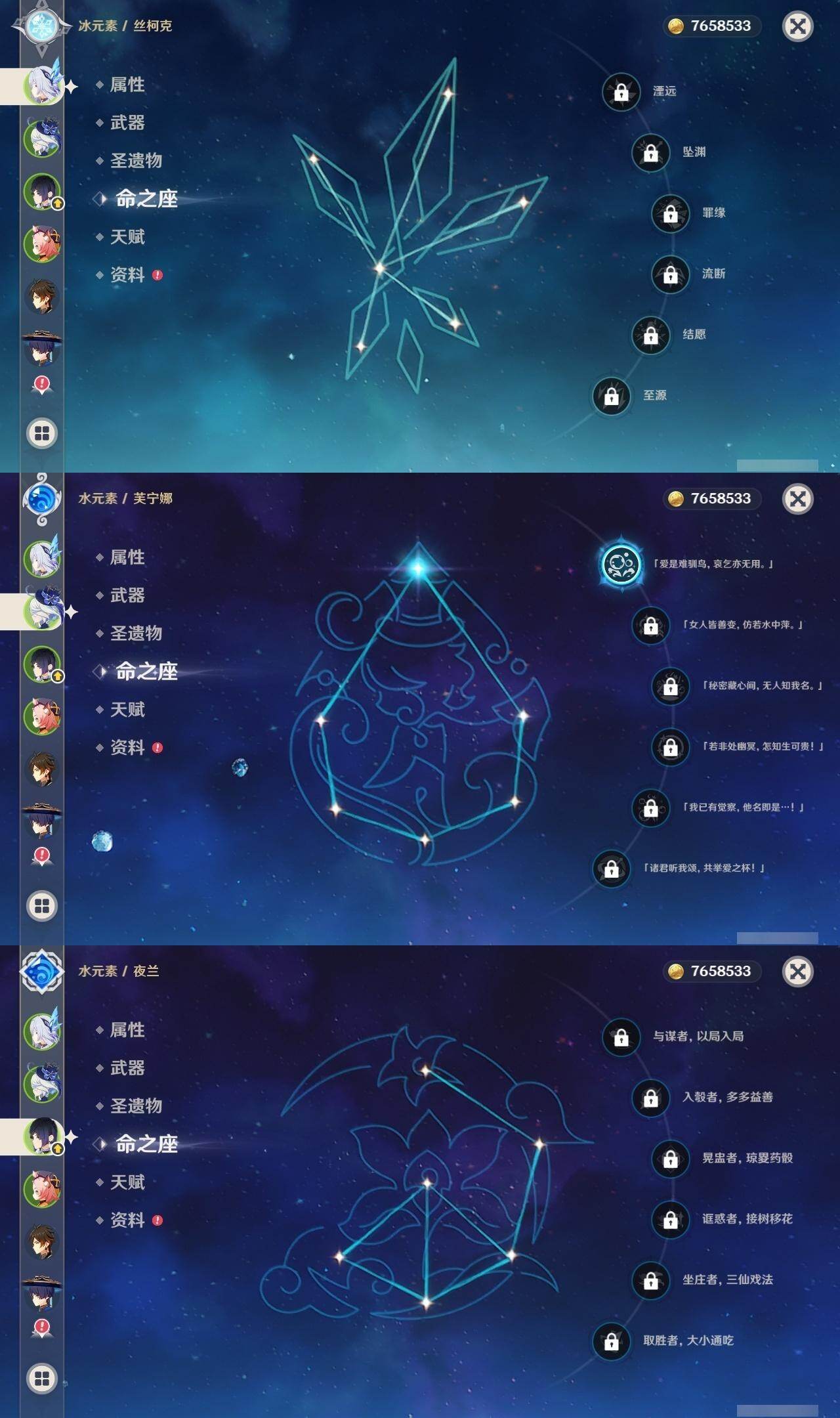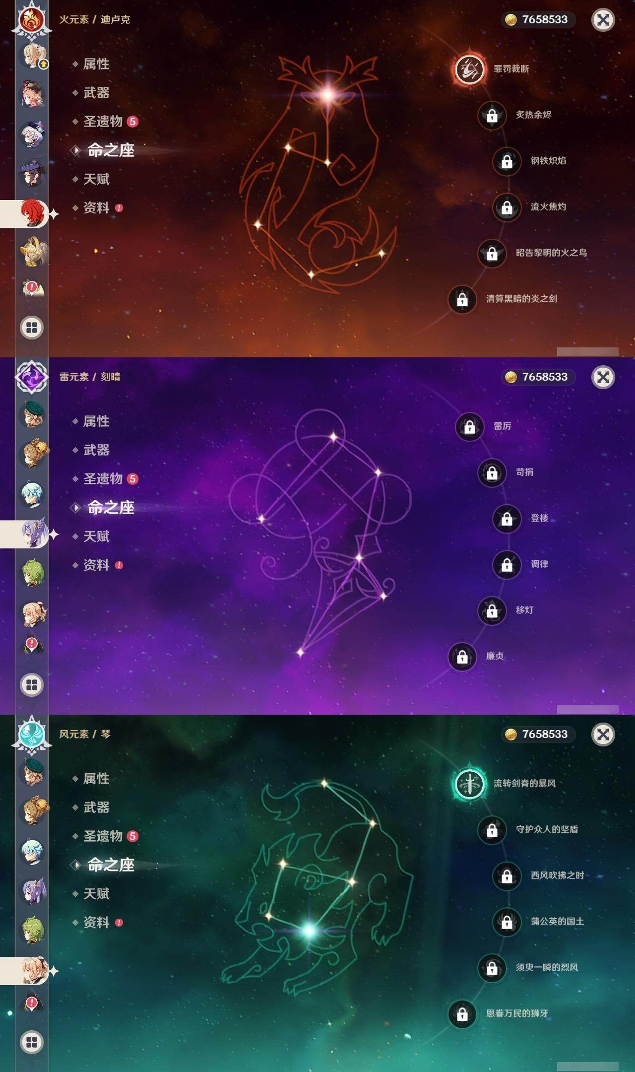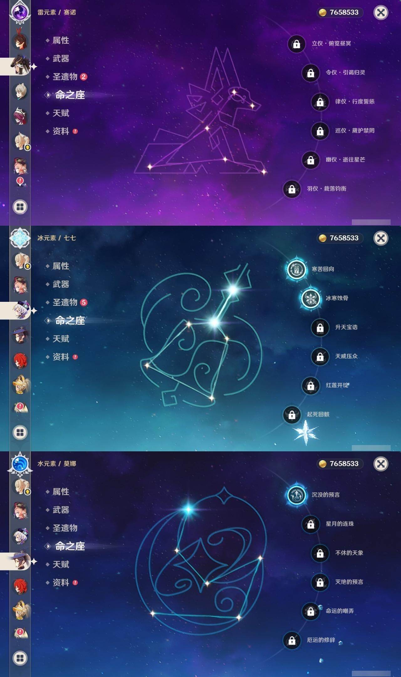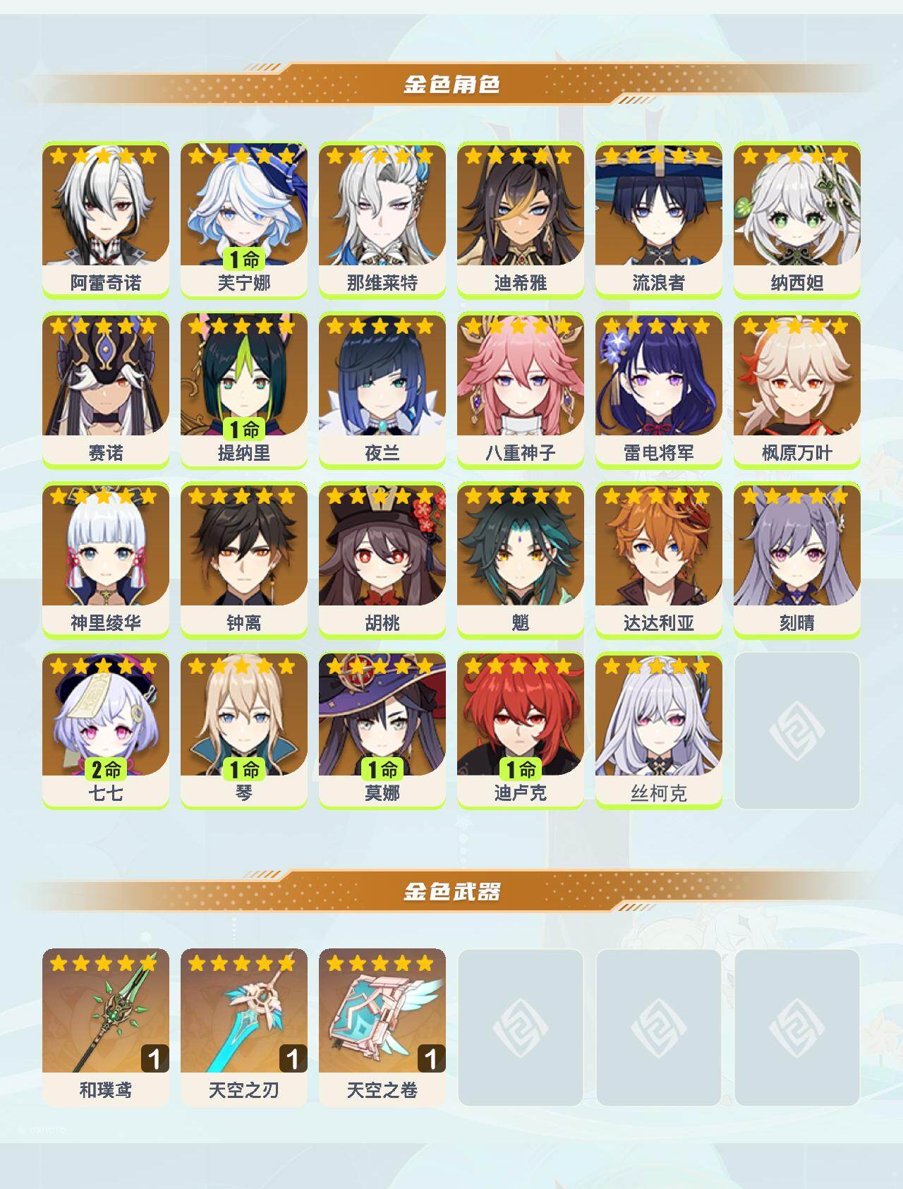 0命阿蕾奇诺,1命芙宁娜,0命那维莱特,0命迪希雅,0命流浪者,0命纳西妲,0命赛诺,1命提纳里,0命夜兰,0命八重神子,0命雷电将军,0命枫原万叶,0命神里绫华,0命钟离,0命胡桃,0命魈,0命达达利亚,0命刻晴,2命七七,1命琴,1命莫娜,1命迪卢克,0命丝柯克,精1和璞鸢,精1天空之刃,精1天空之卷
