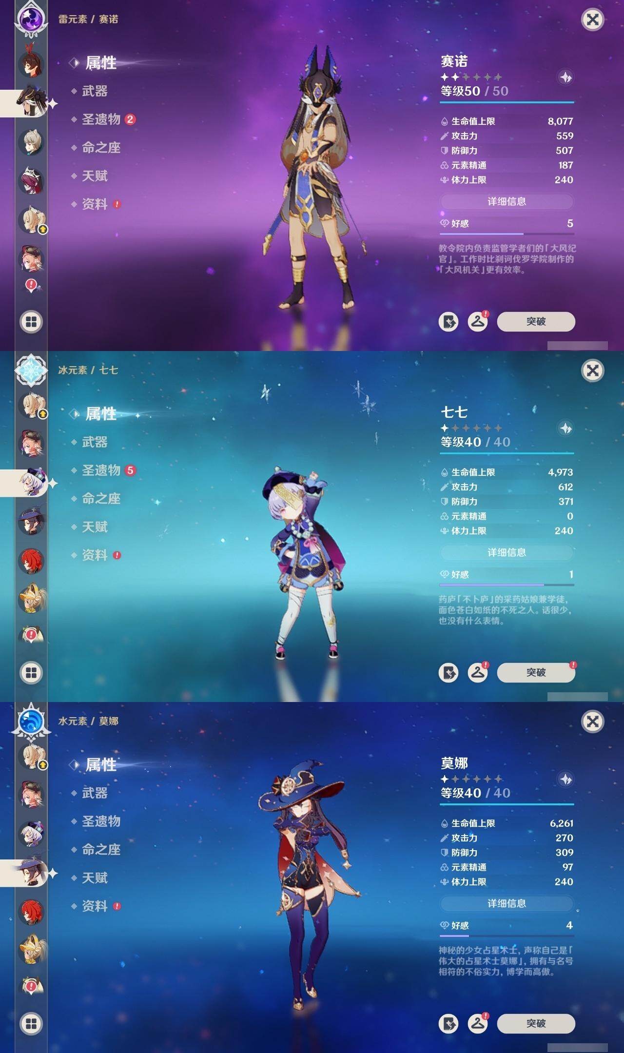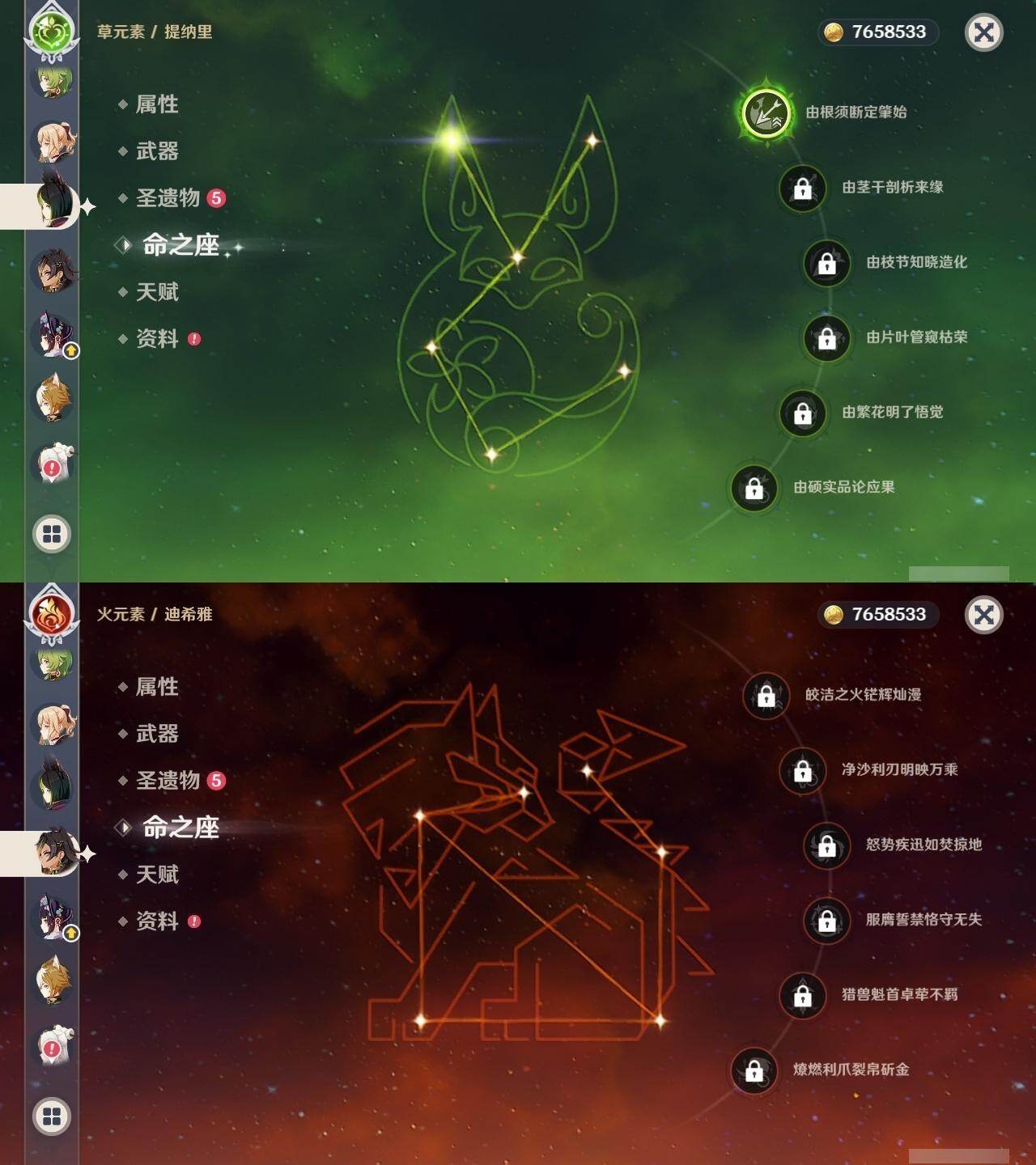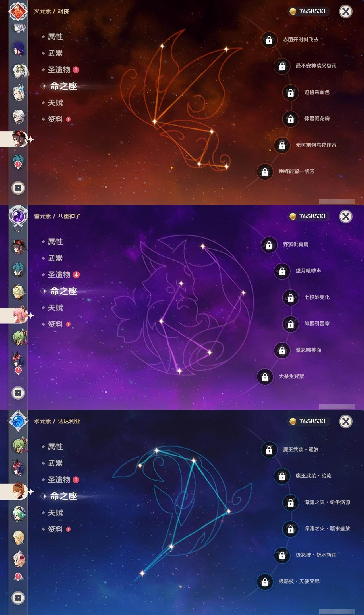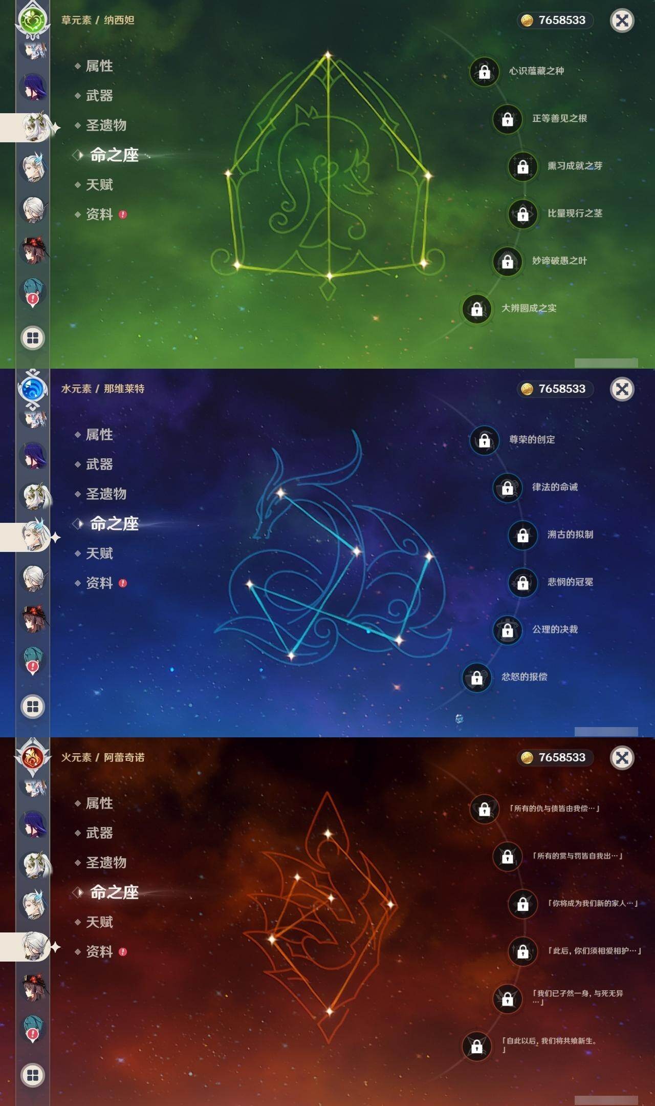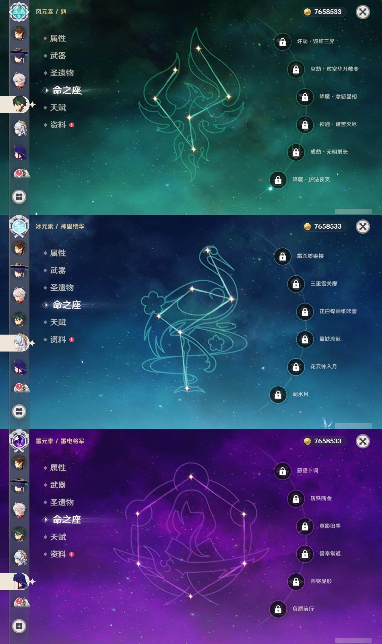 0命阿蕾奇诺,1命芙宁娜,0命那维莱特,0命迪希雅,0命流浪者,0命纳西妲,0命赛诺,1命提纳里,0命夜兰,0命八重神子,0命雷电将军,0命枫原万叶,0命神里绫华,0命钟离,0命胡桃,0命魈,0命达达利亚,0命刻晴,2命七七,1命琴,1命莫娜,1命迪卢克,0命丝柯克,精1和璞鸢,精1天空之刃,精1天空之卷