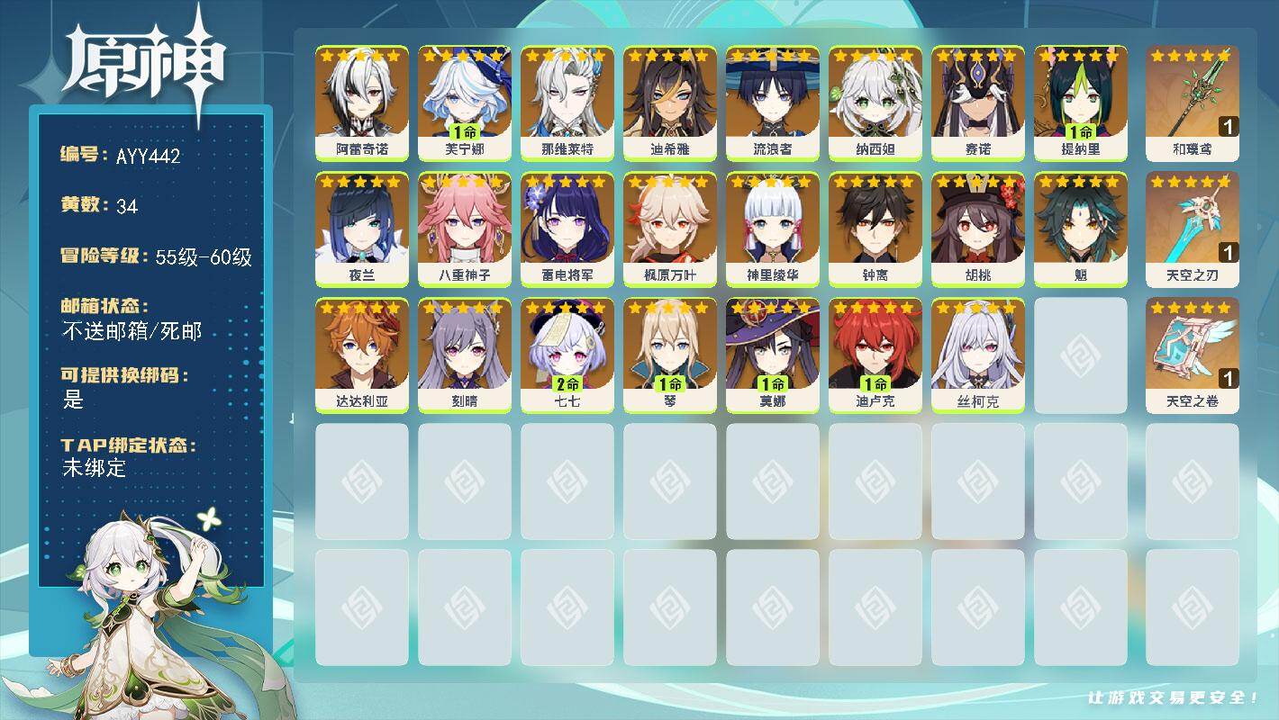 [16493414]59级/34黄/女主/23个五星角色/4个五星武器 0命阿蕾奇诺,1命芙宁娜,0命那维莱特,0命迪希雅,0命流浪者,0命纳西妲,0命赛诺,1命提纳里,0命夜兰,0命八重神子,0命雷电将军,0命枫原万叶,0命神里绫华,0命钟离,0命胡桃,0命魈,0命达达利亚,0命刻晴,2命七七,1命琴,1命莫娜,1命迪卢克,0命丝柯克,精1和璞鸢,精1天空之刃,精1天空之卷