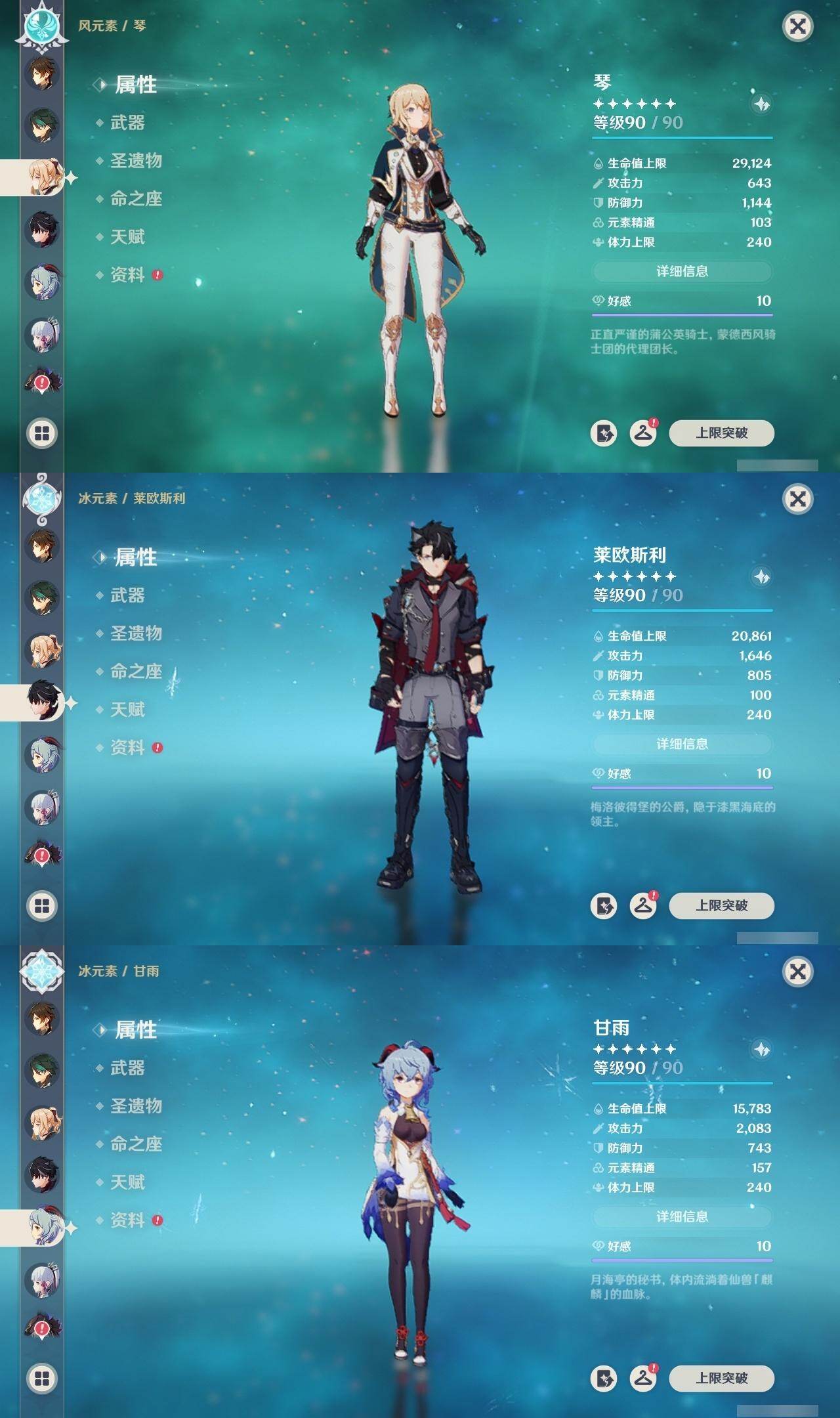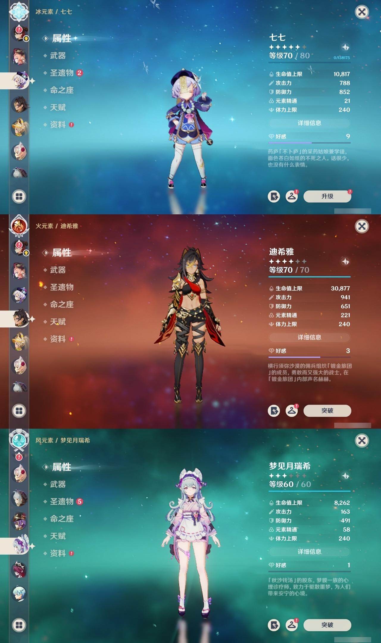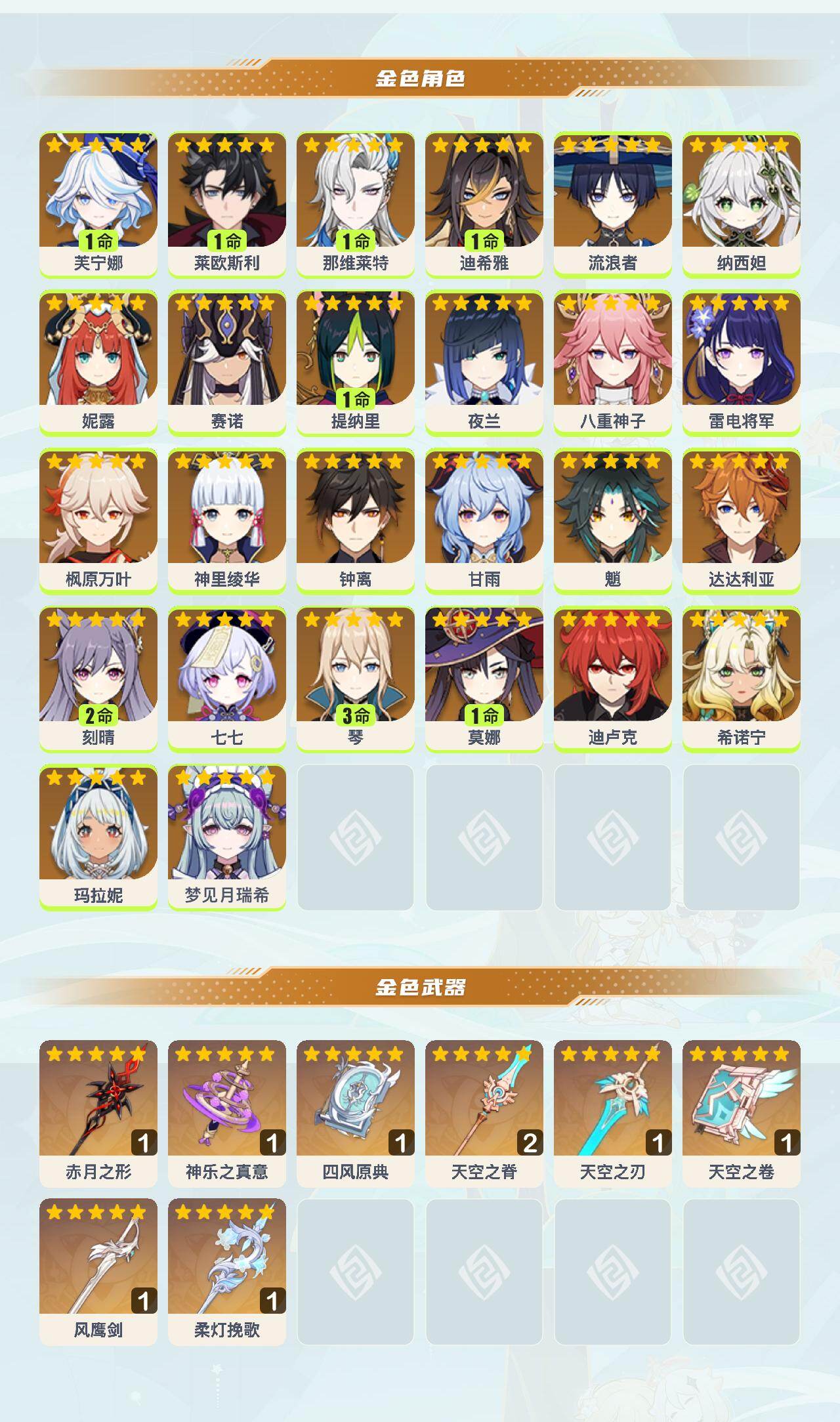 1命芙宁娜,1命莱欧斯利,1命那维莱特,1命迪希雅,0命流浪者,0命纳西妲,0命妮露,0命赛诺,1命提纳里,0命夜兰,0命八重神子,0命雷电将军,0命枫原万叶,0命神里绫华,0命钟离,0命甘雨,0命魈,0命达达利亚,2命刻晴,0命七七,3命琴,1命莫娜,0命迪卢克,0命希诺宁,0命玛拉妮,0命梦见月瑞希,精1赤月之形,精1神乐之真意,精1四风原典,精2天空之脊,精1天空之刃,精1天空之卷,精1风鹰剑,精1柔灯挽歌