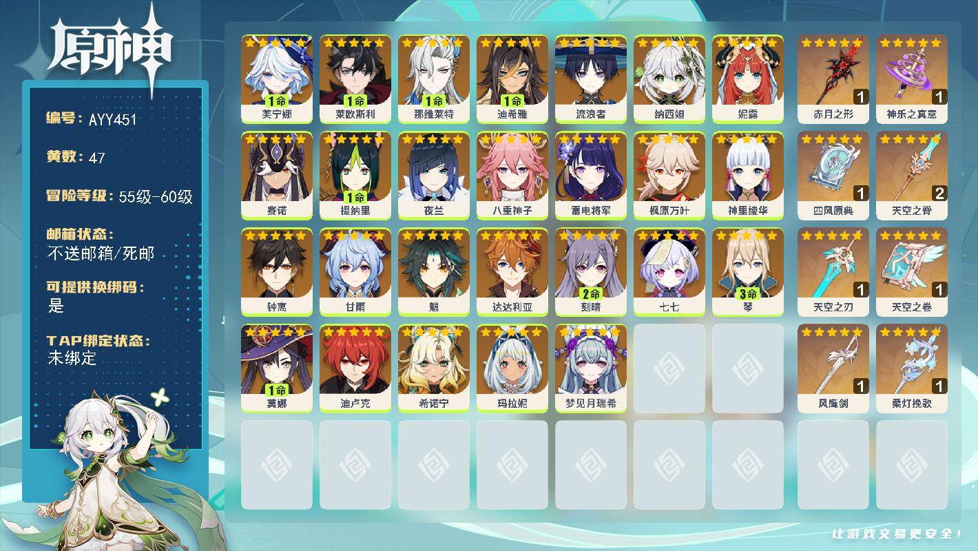 [16493426]60级/47黄/男主/26个五星角色/9个五星武器 1命芙宁娜,1命莱欧斯利,1命那维莱特,1命迪希雅,0命流浪者,0命纳西妲,0命妮露,0命赛诺,1命提纳里,0命夜兰,0命八重神子,0命雷电将军,0命枫原万叶,0命神里绫华,0命钟离,0命甘雨,0命魈,0命达达利亚,2命刻晴,0命七七,3命琴,1命莫娜,0命迪卢克,0命希诺宁,0命玛拉妮,0命梦见月瑞希,精1赤月之形,精1神乐之真意,精1四风原典,精2天空之脊,精1天空之刃,精1天空之卷,精1风鹰剑,精1柔灯挽歌