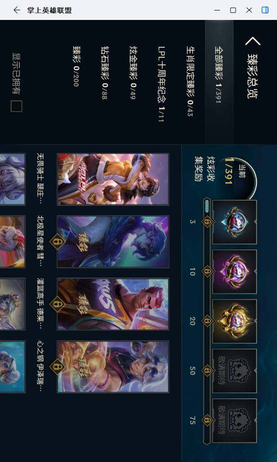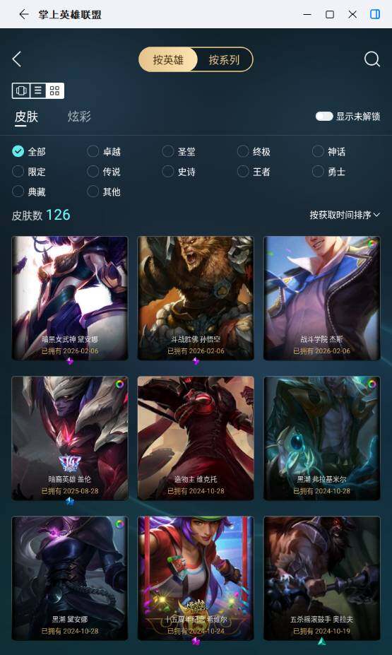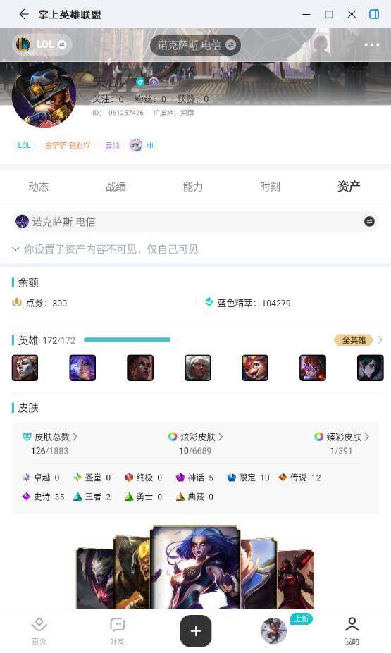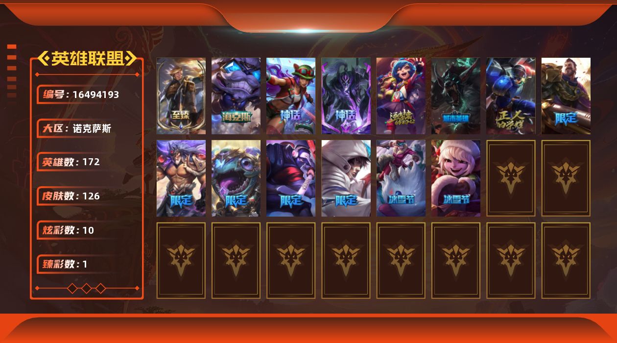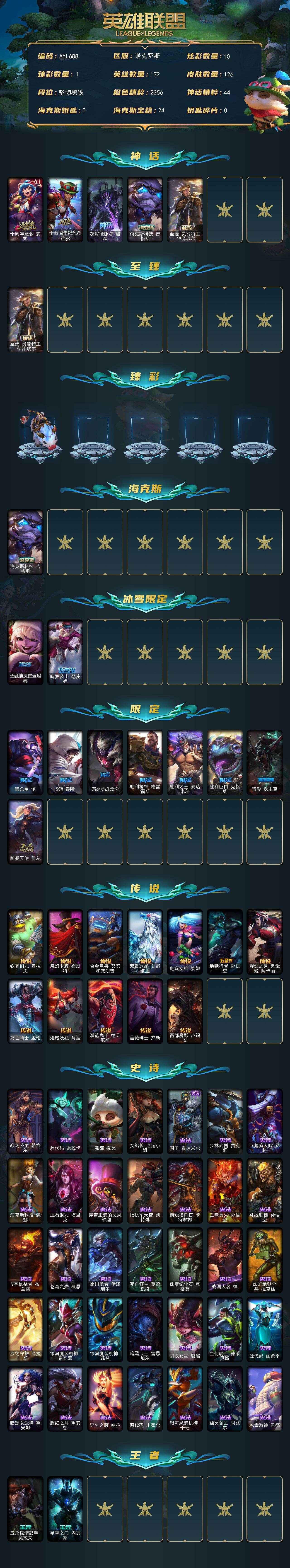 未定级段位-172英雄-126皮肤-10炫彩-0终极-5神话-10限定-12传说-35史诗