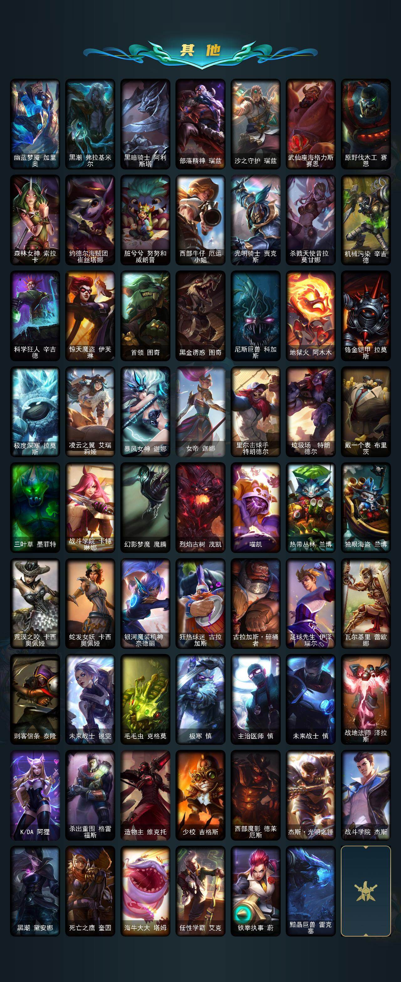 【其他皮肤1】:幽蓝梦魇加里奥,黑潮弗拉基米尔,黑暗骑士阿利斯塔,部落精神瑞兹,沙之守护瑞兹,武仙座海格力斯赛恩,原野伐木工赛恩,森林女神索拉卡,约德尔海贼团崔丝塔娜,脏兮兮努努和威朗普,西部牛仔厄运小姐,光明骑士贾克斯,杀戮天使昔拉莫甘娜,机械污染辛吉德,科学狂人辛吉德,惊天魔盗伊芙琳,首领图奇,黑金诱惑图奇,尼斯巨兽科加斯,地狱火阿木木,铬金铠甲拉莫斯,极度深寒拉莫斯,凌云之翼艾瑞莉娅,暴风女神迦娜,女帝迦娜,里尔击球手特朗德尔,垃圾场特朗德尔,戴一个表布里茨,三叶草墨菲特,战斗学院卡特琳娜,幻影梦魔魔腾,烈焰古树茂凯,喵凯,热带丛林兰博,独眼海盗兰博,荒漠之咬卡西奥佩娅,蛇发女妖卡西奥佩娅,银河魔装机神奈德丽,狂热球迷古拉加斯