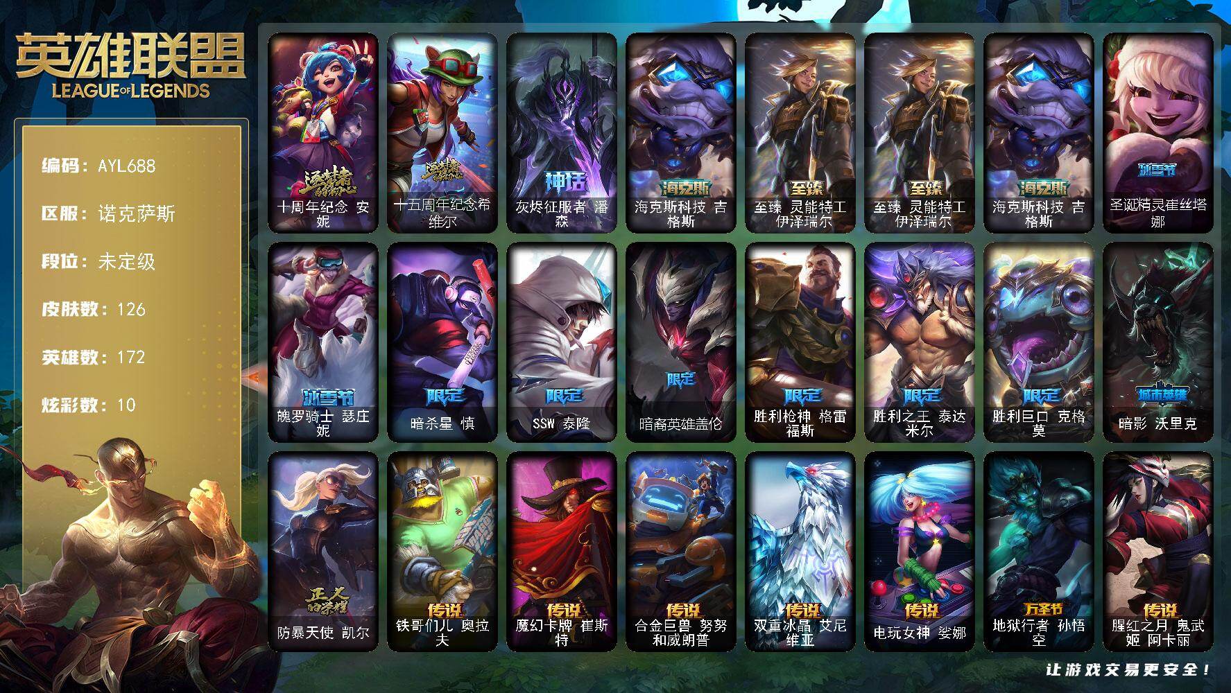[16494193]【特价出售/店主推荐】 未定级段位-172英雄-126皮肤-10炫彩-0终极-5神话-10限定-12传说-35史诗 【神话皮肤】:十周年纪念安妮,十五周年纪念希维尔,灰烬征服者潘森,海克斯科技吉格斯,至臻灵能特工伊泽瑞尔 【至臻皮肤】:至臻灵能特工伊泽瑞尔 【臻彩皮肤】:无畏骑士瑟庄妮赤子初心 【海克斯皮肤】:海克斯科技吉格斯 【冰雪限定】:圣诞精灵崔丝塔娜,魄罗骑士瑟庄妮 【限定皮肤】:暗杀星慎,SSW泰隆,暗裔英雄盖伦,胜利枪神格雷福斯,胜利之王泰达米尔,胜利巨口克格莫,暗影沃里克,防暴天使凯尔 【传说皮肤】:铁哥们儿奥拉夫,魔幻卡牌崔斯特,合金巨兽努努和威朗普,双重冰晶艾尼维亚,电玩女神娑娜,地狱行者孙悟空,腥红之月鬼武姬阿卡丽,死亡骑士盖伦,焰尾妖狐阿狸,灌篮高手德莱厄斯,蔷薇绅士杰斯,西部魔影卢锡安 【史诗皮肤】:战场公主希维尔,源代码索拉卡,熊猫提莫,女船长厄运小姐,国王泰达米尔,少林武僧贾克斯,飞越疯人院萨科,海克斯科技迦娜,血石诅咒塔里克,穿着正装的恶魔维迦,抵抗军天使凯特琳,前线指挥官卡特琳娜,三昧真火孙悟空,斗战胜佛孙悟空,V字仇杀者布兰德,苍穹之光薇恩,冰川勇者伊泽瑞尔,死亡领主莫德凯撒,侏罗纪化石克格莫,战国大名慎,ODST地狱伞兵拉克丝,沙之守护泽拉斯,银河魔装机神希瓦娜,银河魔装机神菲兹,暗黑武士雷恩加尔,驯龙女巫璐璐,生化骑士德莱厄斯,源代码丽桑卓,暗黑女武神黛安娜,腥红之月黛安娜,野火之藤婕拉,源代码卡蜜尔,银河魔装机神千珏,幽冥领主阿兹尔,冰雪游神巴德 【王者皮肤】:五杀摇滚鼓手奥拉夫,星空之门内瑟斯 【其他皮肤1】:幽蓝梦魇加里奥,黑潮弗拉基米尔,黑暗骑士阿利斯塔,部落精神瑞兹,沙之守护瑞兹,武仙座海格力斯赛恩,原野伐木工赛恩,森林女神索拉卡,约德尔海贼团崔丝塔娜,脏兮兮努努和威朗普,西部牛仔厄运小姐,光明骑士贾克斯,杀戮天使昔拉莫甘娜,机械污染辛吉德,科学狂人辛吉德,惊天魔盗伊芙琳,首领图奇,黑金诱惑图奇,尼斯巨兽科加斯,地狱火阿木木,铬金铠甲拉莫斯,极度深寒拉莫斯,凌云之翼艾瑞莉娅,暴风女神迦娜,女帝迦娜,里尔击球手特朗德尔,垃圾场特朗德尔,戴一个表布里茨,三叶草墨菲特,战斗学院卡特琳娜,幻影梦魔魔腾,烈焰古树茂凯,喵凯,热带丛林兰博,独眼海盗兰博,荒漠之咬卡西奥佩娅,蛇发女妖卡西奥佩娅,银河魔装机神奈德丽,狂热球迷古拉加斯