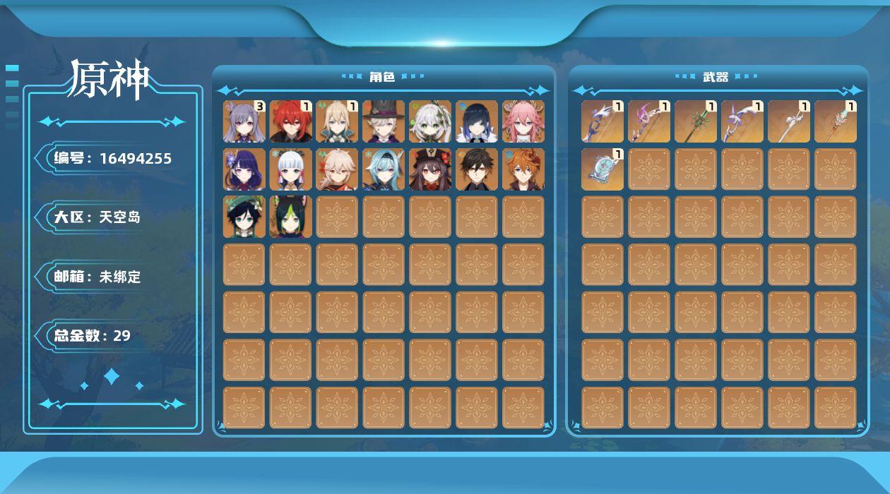 0命林尼,0命纳西妲,0命提纳里,0命夜兰,0命八重神子,0命优菈,0命雷电将军,0命枫原万叶,0命神里绫华,0命钟离,0命胡桃,0命温迪,0命达达利亚,3命刻晴,1命琴,1命迪卢克,精1若水,精1飞雷之弦振,精1四风原典,精1和璞鸢,精1天空之脊,精1阿莫斯之弓,精1风鹰剑