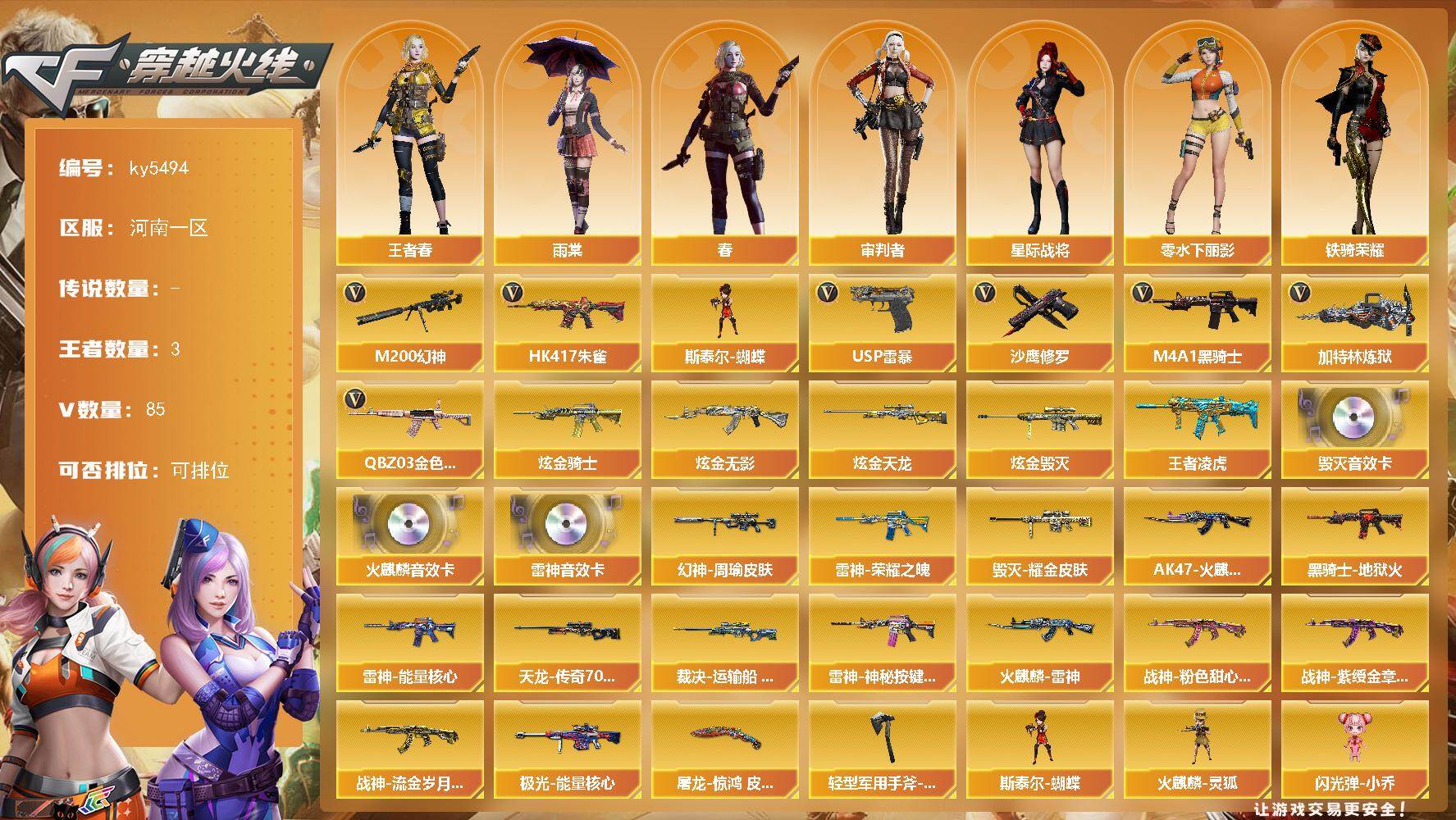 [16496100]河南一区-87V-3王者武器数-5炫金武器数 【热门武器】:QBZ03-金色蔷薇,HK417-朱雀,M200-幻神,M4A1-黑骑士,加特林-炼狱,斯泰尔-蝴蝶,USP-雷暴*2,沙鹰-修罗*3 【王者炫金武器】:王者凌虎,炫金骑士,炫金无影,炫金毁灭,炫金天龙*2 【音效卡】:AK47-火麒麟音效卡,M4A1-雷神音效卡,Barrett-毁灭音效卡 【皮肤】:幻神-周瑜皮肤,裁决-运输船 皮肤,雷神-能量核心,雷神-荣耀之魄,雷神-神秘按键 皮肤,火麒麟-雷神,AK47-火麒麟-传奇EVEN,毁灭耀金皮肤,黑骑士-地狱火,战神-粉色甜心皮肤,战神-紫绶金章皮肤*3,战神-流金岁月皮肤*2,AWM-天龙-传奇70KG,极光-能量核心,屠龙-惊鸿 皮肤,轻型军用手斧-再燃火线 【角色】:春,雨棠,星际战将,审判者,王者春,乔伊教练,修道士,暗夜-X,虎妞,兰-海滩派对,兰妹妹,零-水下丽影,潘多拉-X,潘多拉-甜心教官,铁骑荣耀,影武者-X 【人偶武器】:火麒麟-灵狐,斯泰尔-蝴蝶,闪光弹-小乔 【英雄级武器】:M4A1-千变*2,AK47-火麒麟,M4A1-雷神*2,M4A1-黑骑士,AK47-黑武士*2,AK12-天启,M4A1-龙血,AK47-雷暴,HK417-朱雀,SCAR Light-玄豹,M4A1-玫瑰精灵*2,QBZ03-金色蔷薇,王者之心-觉醒版,王者之魄-觉醒版,AK-47-猩红传说*5,AK47-B-战神,Barrett-毁灭*2,Barrett-极光,AWM-裁决,M200-幻神,加特林-炼狱,沙鹰-修罗*3,沙鹰-天神,USP-雷暴*2,屠龙*2,龙啸*4,擎天*2,麒麟刺,斩神刀-雷暴*2,高爆手雷-雷霆,高爆手雷-雷暴*8,高爆手雷-玄豹,闪光弹-雷霆,闪光弹-雷暴*8,闪光弹-竞技荣光,烟雾弹-雷霆,烟雾弹-雷暴*8,烟雾弹-玄豹*3 【道具】:BS战队炫彩背包,XROCK炫彩背包,炫彩背包,百战金芒炫彩背包,超级背包,绿色巨人,灵魂忍者,迷雾幽灵,夺命之镰,防化服*3,萌萌小葵表情,防弹头盔*4,防弹衣*4,C4工具钳*3,手雷包*3 【特殊枪械】:蝴蝶斯泰尔+0烈龙,1黑骑士,1炼狱,1蝴蝶斯泰尔
