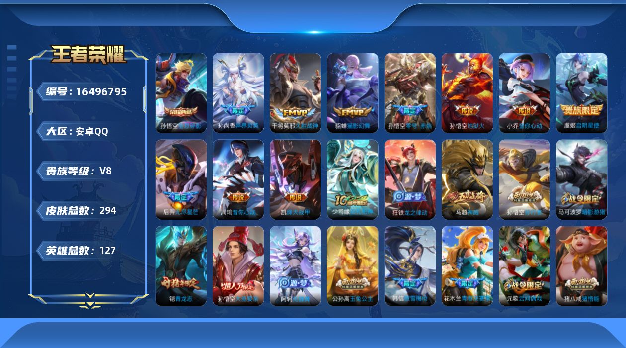 [16496795]账号来源干净 保证账号找回包赔 薄利多销 冲销量 平台保证金向商家 安卓Q-V8-至尊星耀IV段位-127英雄-294皮肤-1典藏皮肤-11传说-92史诗【英雄全皮】:狂铁全皮,猪八戒全皮,影全皮【荣耀典藏】:孙悟空全息碎影【传说皮肤】:后羿神树通天,后羿无尽星芒,孙尚香异界灵契,周瑜音你心动,小乔音你心动,铠绛天战甲,虞姬启明星使,孙悟空零号赤焰,貂蝉猫影幻舞,干将莫邪久胜战神,孙悟空地狱火【限定皮肤】:狄仁杰阴阳师,廉颇寅虎御盾,赵云皇家上将,赵云百木心枪,墨子神迹守卫,嬴政优雅恋人,嬴政白昼王子,孙尚香蔷薇恋人,孙尚香异界灵契,鲁班七号狮舞东方,鲁班七号乒乒小将,庄周高山流水,白起夜都怪侠,芈月幻夜卜梦,吕布猎兽之王,周瑜赤莲之焰,元歌云间偶戏,元歌无心,夏侯惇朔风刀,甄姬女儿国国王,马可波罗暗影游猎,狄仁杰魔术师,狄仁杰万华元夜,达摩星际陆战队,达摩沙漠行僧,项羽海滩派对,老夫子醍醐杖,老夫子航海奇遇记,程咬金演武夺筹,韩信逐梦之影,韩信飞衡,韩信傲雪梅枪,王昭君午后时光,兰陵王驯魔猎人,兰陵王金庭之子,花木兰青春决赛季,亚瑟潮玩骑士王,孙悟空美猴王,孙悟空大圣娶亲,孙悟空零号赤焰,孙悟空孙行者,牛魔御旌,后羿圣弓游侠,后羿无尽星芒,李元芳银河之约,李元芳云中旅人,虞姬启明星使,钟馗神迹守卫,钟馗驱傩正仪,杨玉环遇见飞天,女娲朔望之晖,干将莫邪真爱魔法,雅典娜单词大作战,鬼谷子原初探秘者,鬼谷子五谷丰年,黄忠火炮绅士,铠青龙志,苏烈千军破阵,百里玄策原初追逐者,弈星混沌棋,公孙离玉兔公主,沈梦溪星空之诺,沈梦溪大漠名商,明世隐疑决卦,明世隐吟游魔法,裴擒虎李小龙,裴擒虎擒涛扼浪,狂铁御狮,狂铁电玩高手,米莱狄御霄,米莱狄胡桃异想国,伽罗天狼溯光者,盾山御銮,猪八戒西部大镖客,猪八戒猪悟能,上官婉儿梁祝,嫦娥拒霜思,蒙犽狂想玩偶喵,鲁班大师探海日志,镜匿光追影者,桑启海盐诗旅,艾琳女武神,阿古朵江河有灵,张良古海寻踪,蒙犽百解令,高渐离燃音魔法,妲己灵卜魔法,鬼谷子天穹祈灯,沈梦溪龙舞盛年,鲁班七号蔬乡物语,李元芳蔬乡物语,刘邦剑破天穹