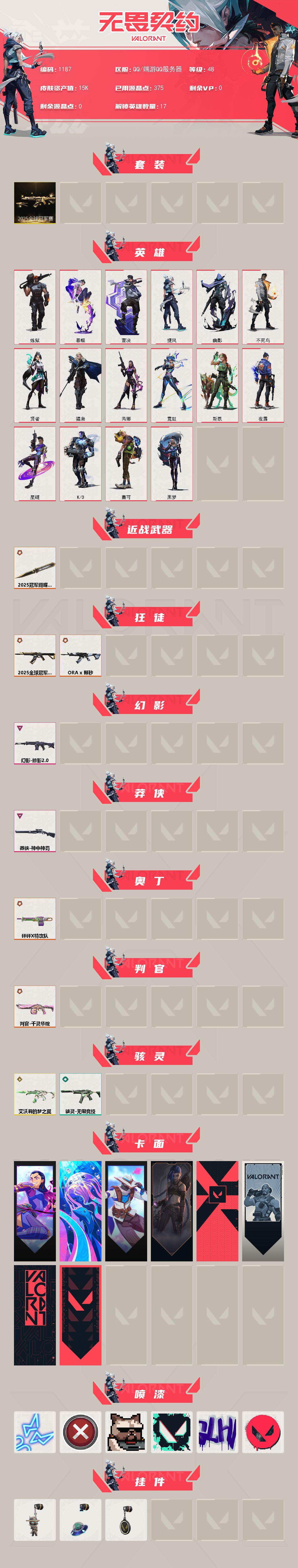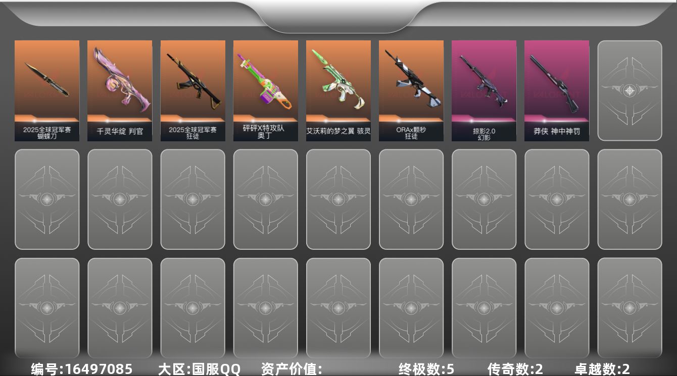 [16497085]【套装】:2025全球冠军赛套装 【英雄】:炼狱,暮蝶,壹决,捷风,幽影,不死鸟,贤者,猎枭,芮娜,霓虹,斯凯,夜露,星礈,K/O,盖可,黑梦 【近战武器】:近战武器-2025全球冠军赛 蝴蝶刀 【狂徒】:狂徒-2025全球冠军赛,狂徒-ORA x 颗秒 【幻影】:幻影-掠影//2.0 【莽侠】:莽侠-神中神罚 【奥丁】:奥丁-砰砰X特攻队 【判官】:判官-千灵华绽 【骇灵】:骇灵-艾沃莉的梦之翼,骇灵-无限竞技 【卡面】:无畏契约GO!第一卷:芮娜 卡面,深海水族 卡面,无畏契约GO!第一卷:零 卡面,《双城之战》金克丝 卡面,代号红色 卡面,新兵报到 卡面,V契约 卡面,无畏契约 卡面 【喷漆】:霓光四射 喷漆,买装还是存钱 喷漆,关门放狗 喷漆,胜利属于无畏契约 喷漆,GLHF 喷漆,无畏契约 喷漆 【挂饰】:无畏契约GO!第一卷 零 挂饰,天外飞客 挂饰,无畏契约 纪念币 挂饰