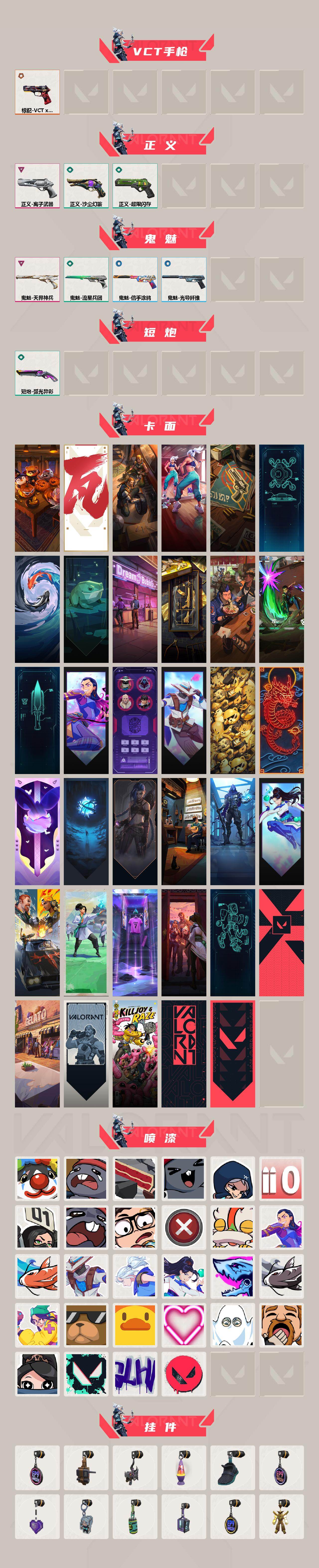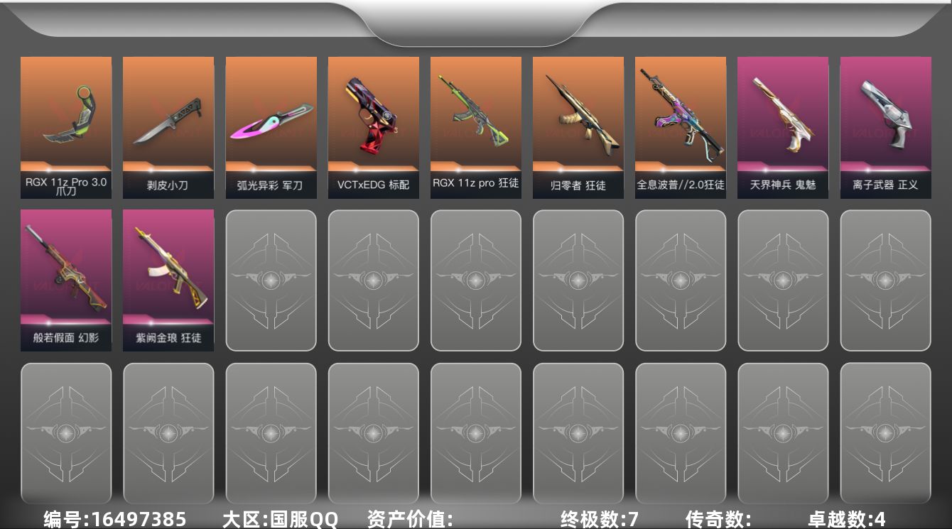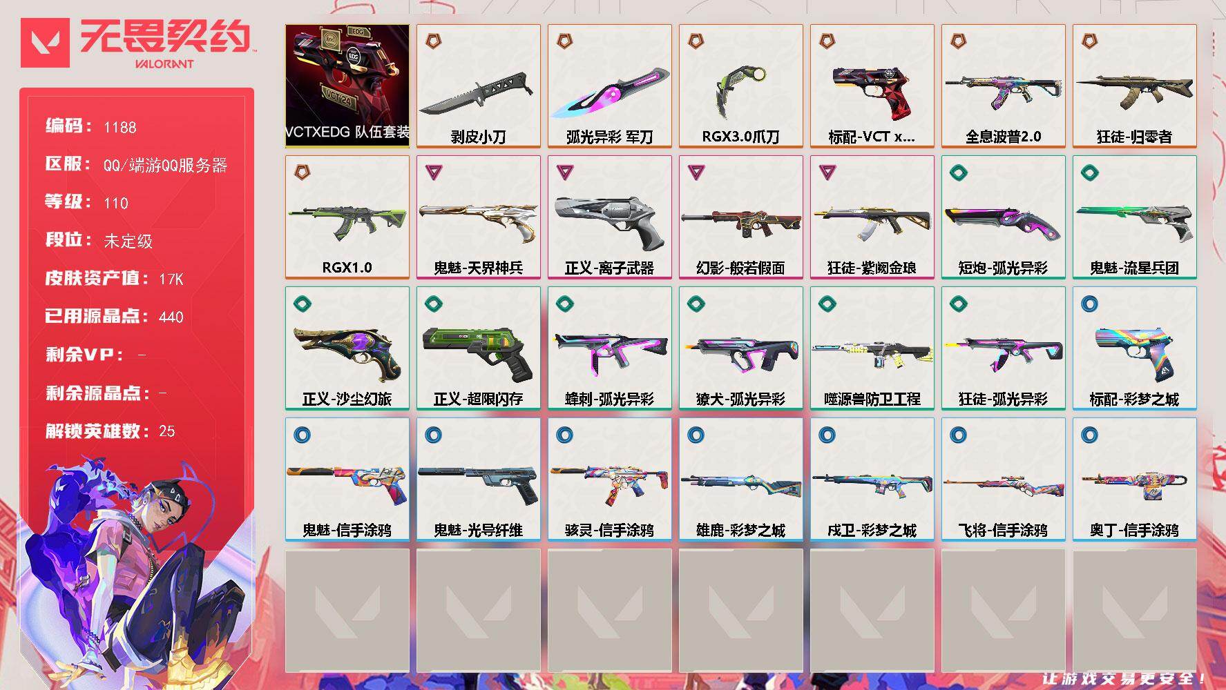 [16497385]【套装】:VCTxEDG 队伍套装 【英雄】:炼狱,维斯,暮蝶,钛狐,壹决,铁臂,捷风,雷兹,幽影,不死鸟,贤者,猎枭,蝰蛇,零,芮娜,奇乐,尚勃勒,霓虹,斯凯,夜露,星礈,K/O,盖可,黑梦,钢锁 【近战武器】:近战武器-剥皮小刀,近战武器-RGX 11z Pro//3.0 爪刀,近战武器-弧光异彩 军刀 【狂徒】:狂徒-归零者,狂徒-全息波普//2.0,狂徒-RGX 11z Pro,狂徒-紫阙金琅,狂徒-弧光异彩 【幻影】:幻影-般若假面,幻影-噬源兽防卫工程 【戍卫】:戍卫-彩梦之城 【獠犬】:獠犬-弧光异彩 【飞将】:飞将-信手涂鸦 【奥丁】:奥丁-信手涂鸦 【雄鹿】:雄鹿-彩梦之城 【骇灵】:骇灵-信手涂鸦 【蜂刺】:蜂刺-弧光异彩 【标配】:标配-彩梦之城 【VCT手枪】:标配-VCT x EDG 【正义】:正义-离子武器,正义-超限闪存,正义-沙尘幻旅 【鬼魅】:鬼魅-天界神兵,鬼魅-流星兵团,鬼魅-光导纤维,鬼魅-信手涂鸦 【短炮】:短炮-弧光异彩 【卡面】:南瓜盛典 卡面,VCT CN首冠 卡面,修车达人 卡面,热舞环节 卡面,正义的化身 卡面,声感陷阱设计图 卡面,红鳞松叶 卡面,霓帧牛蛙 卡面,梦幻奶茶 卡面,终章:打造专属狂徒 卡面,趁热吃 卡面,源能反应 卡面,零点嗅探设计图 卡面,无畏契约GO!第一卷:芮娜 卡面,清除名单 卡面,无畏契约GO!第一卷:零 卡面,终章:同步耍酷 卡面,龍记 卡面,化茧成蝶 卡面,无垠星环 卡面,《双城之战》金克丝 卡面,完美调谐 卡面 ,暗枪 卡面,无畏契约GO!第一卷:贤者 卡面,铁臂vs雷兹 卡面,夯实根基 卡面,"Luie" 卡面,热烈欢迎 卡面,铁臂设计图 卡面,代号红色 卡面,冰淇淋店 卡面,新兵报到 卡面,友军火力 卡面,V契约 卡面,无畏契约 卡面 【喷漆】:小丑猫 喷漆,熊抱 喷漆,蛋糕还是爆能器? 喷漆,超级粉丝 喷漆,捷风差距 喷漆,拼一枪 喷漆,我觉得不行 喷漆,我的刀呢? 喷漆,新潮流 喷漆,买装还是存钱 喷漆,醒狮贺春 喷漆,无畏契约GO!第一卷:芮娜 喷漆,红鳞 喷漆,无畏契约GO!第一卷:零 喷漆,无畏契约GO!第一卷:捷风 喷漆,无畏契约GO!第一卷:贤者 喷漆,暴走萝莉 喷漆,松叶 喷漆,无畏契约GO!第一卷:奇乐 喷漆,旅行小熊 喷漆,战术小伙伴 喷漆,蕊形灯 喷漆,凌
