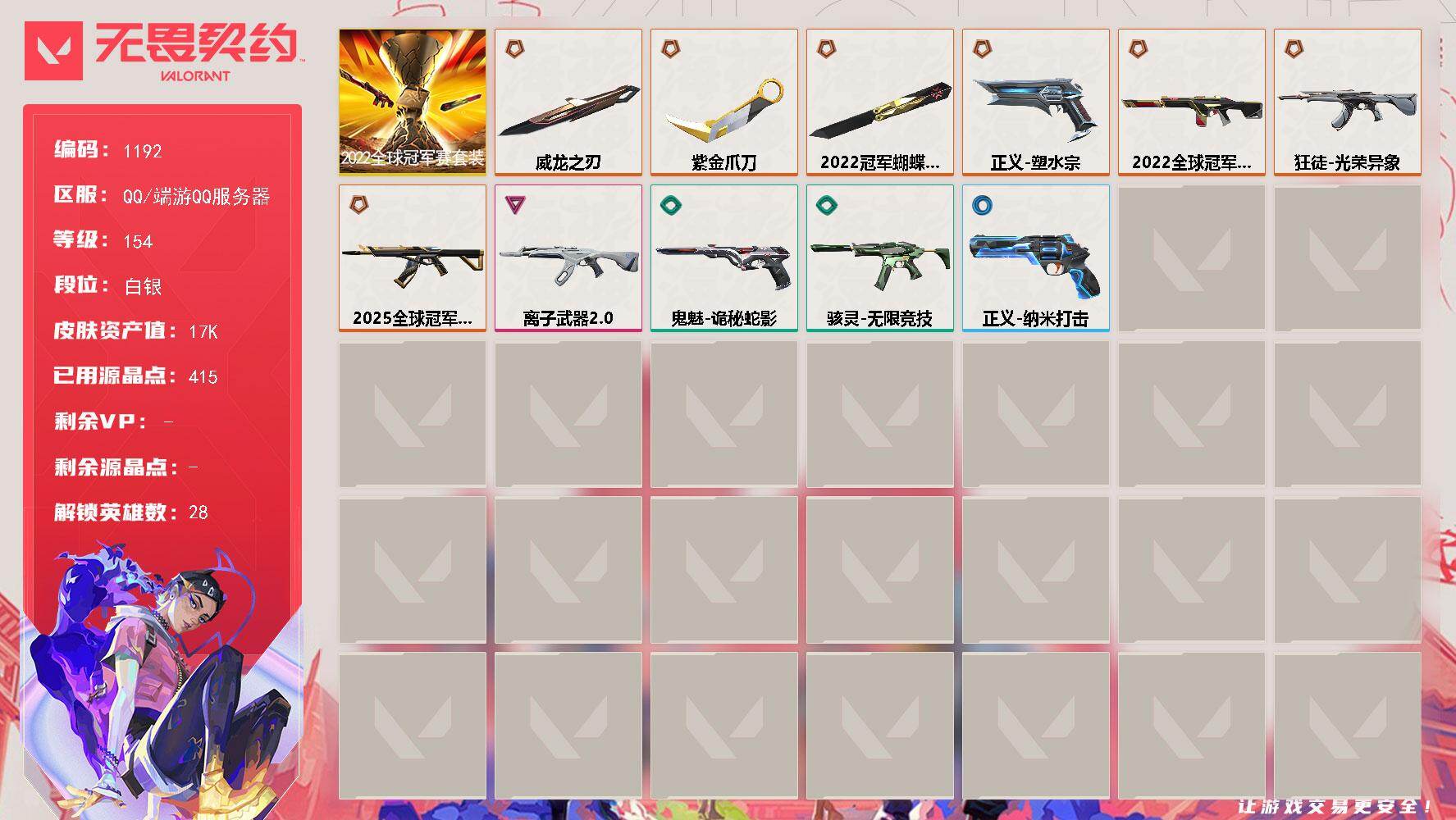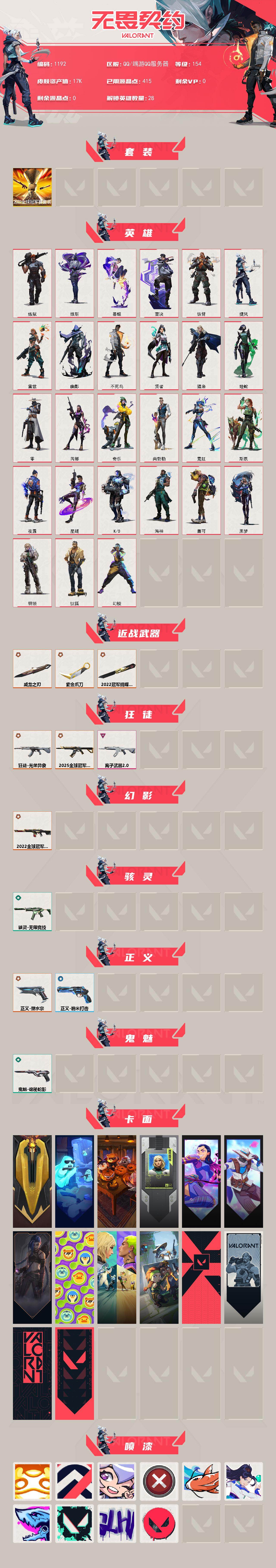 [16497627]【套装】:2022全球冠军赛套装 【英雄】:幻棱,炼狱,维斯,暮蝶,钛狐,壹决,铁臂,捷风,雷兹,幽影,不死鸟,贤者,猎枭,蝰蛇,零,芮娜,奇乐,尚勃勒,霓虹,斯凯,夜露,星礈,K/O,海神,盖可,黑梦,钢锁 【近战武器】:近战武器-2022全球冠军赛 蝴蝶刀,近战武器-紫金爪刀,近战武器-威龙之刃 【狂徒】:狂徒-2025全球冠军赛,狂徒-光荣异象,狂徒-离子武器//2.0 【幻影】:幻影-2022全球冠军赛 【骇灵】:骇灵-无限竞技 【正义】:正义-塑水宗,正义-纳米打击 【鬼魅】:鬼魅-诡秘蛇影 【卡面】:进入射程 卡面,精灵大战 卡面,南瓜盛典 卡面,钢锁工牌 卡面,无畏契约GO!第一卷:芮娜 卡面,无畏契约GO!第一卷:零 卡面,《双城之战》金克丝 卡面,战术小伙伴 卡面,钢锁vs盖可 卡面,别冒尖 卡面,代号红色 卡面,新兵报到 卡面,V契约 卡面,无畏契约 卡面 【喷漆】:嗨宝南瓜灯 喷漆,控场勿近 喷漆,超能偶像 喷漆,买装还是存钱 喷漆,红鳞 喷漆,无畏契约GO!第一卷:贤者 喷漆,暴走萝莉 喷漆,胜利属于无畏契约 喷漆,GLHF 喷漆,无畏契约 喷漆 【挂饰】:终章:猫猫木乃伊 挂饰,悠闲鸡块 挂饰,伞绳 挂饰,第九季//第三幕 纪念币 挂饰,鱼骨头 挂饰,薰衣草之心 挂饰,冲上云霄 挂饰,迷你机甲 挂饰,深海水母 挂饰,天外飞客 挂饰,红鳞松叶 挂饰,冬日絮语 挂饰,无畏契约 纪念币 挂饰