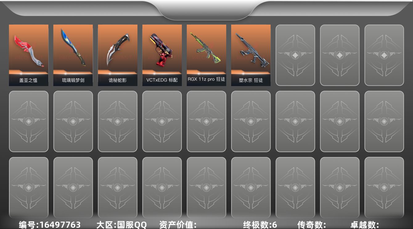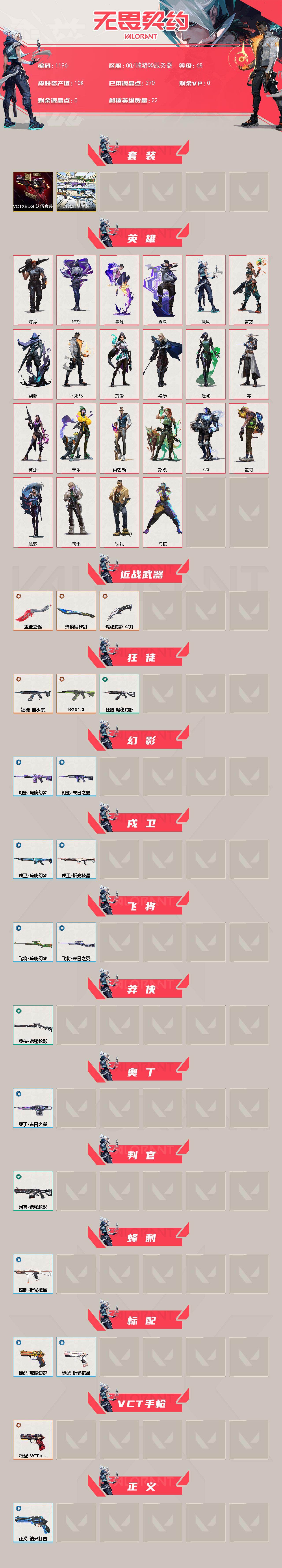 [16497763]【套装】:VCTxEDG 队伍套装,琉璃幻梦套装 【英雄】:幻棱,炼狱,维斯,暮蝶,钛狐,壹决,捷风,雷兹,幽影,不死鸟,贤者,猎枭,蝰蛇,零,芮娜,奇乐,尚勃勒,斯凯,K/O,盖可,黑梦,钢锁 【近战武器】:近战武器-盖亚之愠,近战武器-琉璃锻梦剑,近战武器-诡秘蛇影 军刀 【狂徒】:狂徒-塑水宗,狂徒-RGX 11z Pro,狂徒-诡秘蛇影 【幻影】:幻影-琉璃幻梦,幻影-末日之翼 【戍卫】:戍卫-琉璃幻梦,戍卫-折光棱晶 【飞将】:飞将-琉璃幻梦,飞将-末日之翼 【莽侠】:莽侠-诡秘蛇影 【奥丁】:奥丁-末日之翼 【判官】:判官-诡秘蛇影 【蜂刺】:蜂刺-折光棱晶 【标配】:标配-琉璃幻梦,标配-折光棱晶 【VCT手枪】:标配-VCT x EDG 【正义】:正义-纳米打击 【鬼魅】:鬼魅-诡秘蛇影,鬼魅-星云暗涌 【短炮】:短炮-末日之翼 【卡面】:终章:激斗汉堡 卡面,进入射程 卡面,《双城之战》拥抱 卡面,精灵大战 卡面,欢迎来到底城 卡面,南瓜盛典 卡面,修车达人 卡面,正义的化身 卡面,Clutch 卡面,无畏契约GO!第一卷:芮娜 卡面,无畏契约GO!第一卷:零 卡面,《双城之战》金克丝 卡面,无畏契约GO!第一卷:贤者 卡面,别冒尖 卡面,代号红色 卡面,新兵报到 卡面,V契约 卡面,无畏契约 卡面 【喷漆】:嗨宝南瓜灯 喷漆,嘭! 喷漆,都算到了 喷漆,控场勿近 喷漆,熊抱 喷漆,捷风差距 喷漆,买装还是存钱 喷漆,无畏契约GO!第一卷:芮娜 喷漆,红鳞 喷漆,胜利属于无畏契约 喷漆,GLHF 喷漆,无畏契约 喷漆 【挂饰】:终章:猫猫木乃伊 挂饰,悠闲鸡块 挂饰,伞绳 挂饰,《双城之战》小蛋糕 挂饰,第九季//第三幕 纪念币 挂饰,无畏契约GO!第一卷 芮娜 挂饰,无畏契约GO!第一卷 零 挂饰,熔岩灯 挂饰,第九季//第二幕 纪念币 挂饰,薰衣草之心 挂饰,Z世代特饮 挂饰,VCT x EDG 挂饰,天外飞客 挂饰,《双城之战》魄罗 挂饰,无畏契约 纪念币 挂饰