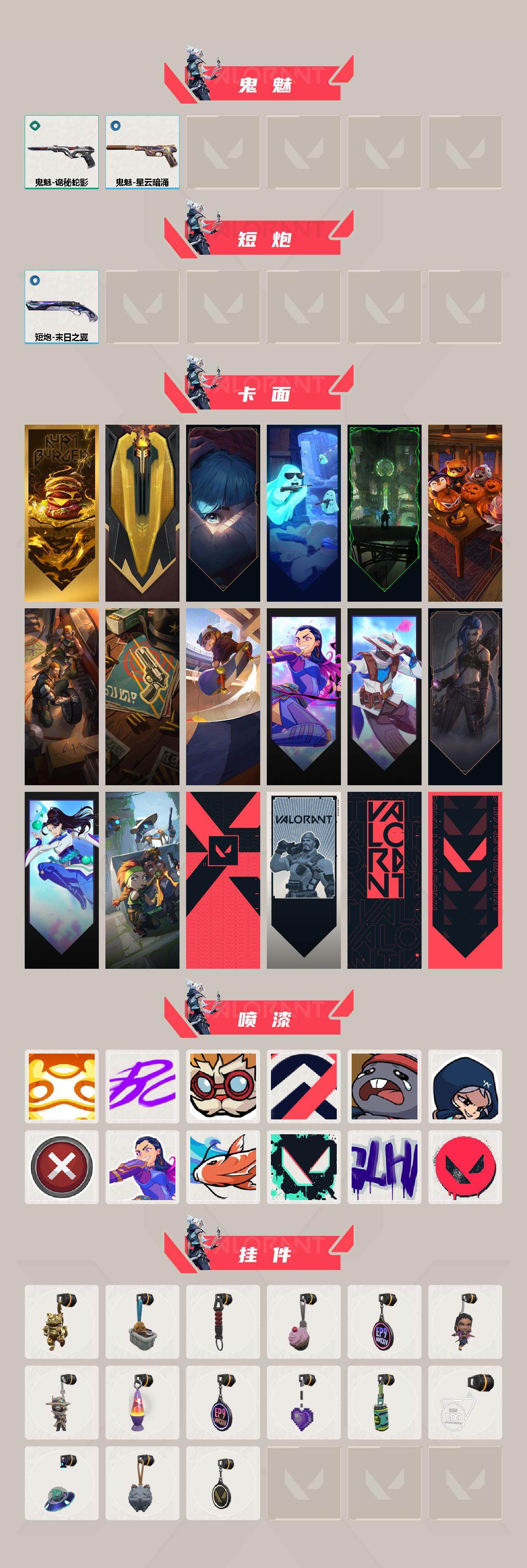 【喷漆】:嗨宝南瓜灯 喷漆,嘭! 喷漆,都算到了 喷漆,控场勿近 喷漆,熊抱 喷漆,捷风差距 喷漆,买装还是存钱 喷漆,无畏契约GO!第一卷:芮娜 喷漆,红鳞 喷漆,胜利属于无畏契约 喷漆,GLHF 喷漆,无畏契约 喷漆