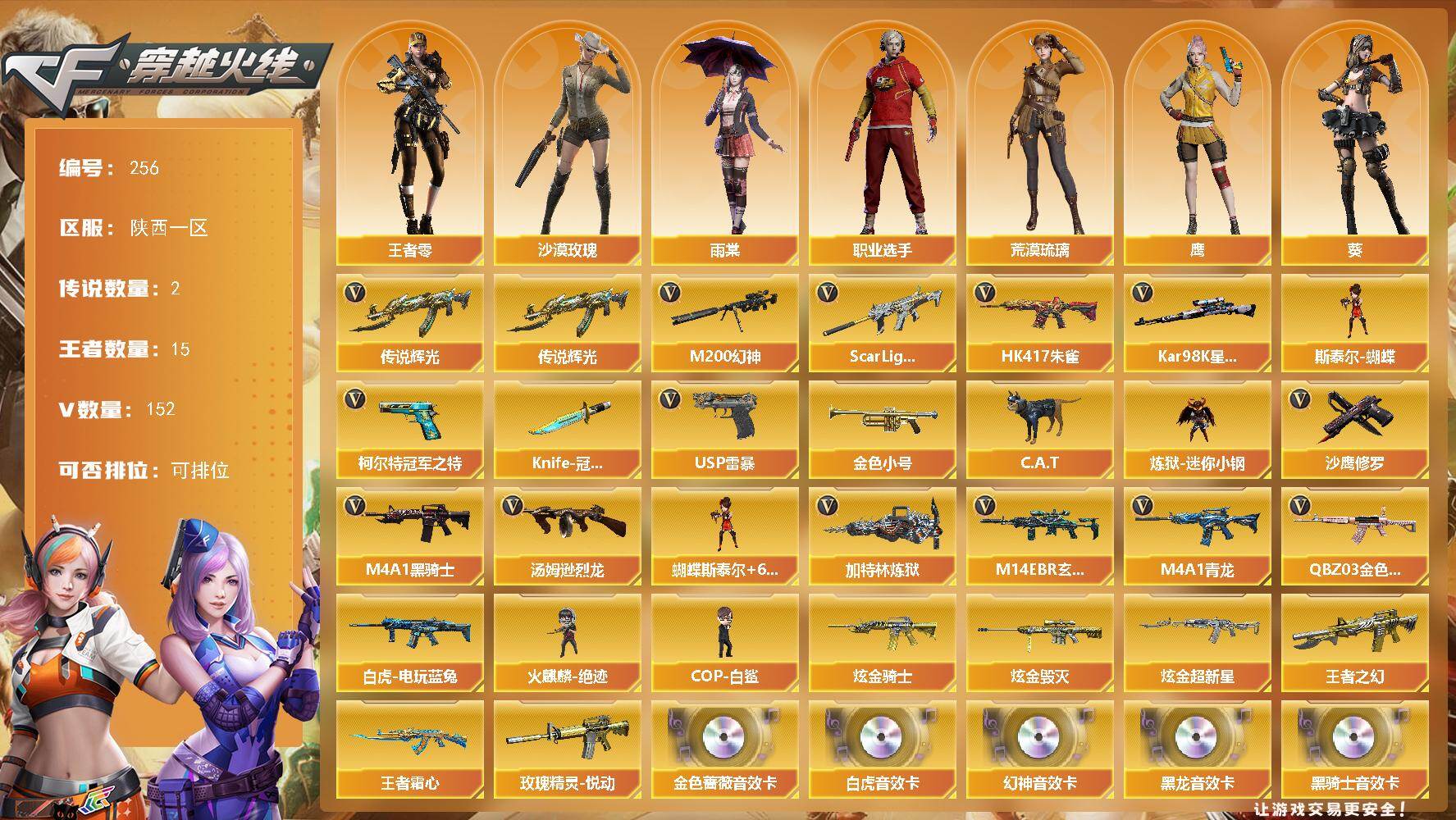[16497792]陕西一区-152V-15王者-3炫金 【传说武器】:传说辉光 【传说角色】:传说女帝 【热门武器】:传说辉光,QBZ03-金色蔷薇*2,M14EBR-玄武,Scar Light-白虎,HK417-朱雀,M4A1-青龙,M200-幻神,白虎-电玩蓝兔,柯尔特-冠军之特,Kar98K-星神,金色小号,C.A.T,炼狱-迷你小钢,M4A1-黑骑士,汤姆逊-烈龙*8,加特林-炼狱*6,斯泰尔-蝴蝶,火麒麟-绝迹*2,COP-白鲨*3,USP-雷暴*2,沙鹰-修罗*7,Knife-冠军之刃 【王者炫金武器】:炫金骑士,炫金毁灭,炫金超新星,王者之幻,玫瑰精灵-悦动,王者霜心 【音效卡】:M200-幻神音效卡,AK47-火麒麟音效卡*2,M4A1-雷神音效卡,M4A1-黑龙音效卡,M4A1-黑骑士音效卡,Barrett-毁灭音效卡,QBZ03-金色蔷薇音效卡,Scar Light-白虎音效卡,70KG语音包 【稀有皮肤】:幻神-巅峰荣耀,白虎-电玩粉兔皮肤,QBZ03-AG-CFPLS19冠军,雷神-能量核心,雷神-星空,雷神-冠军之魄,黑骑士-暗月,黑骑士-冠军之势,M4A1-黑龙-361,毁灭-暗月*2,毁灭-星空,毁灭-冠军之怒,天龙-秘银,AWM-天龙-传奇白鲨,AK47-黑武士-361,修罗-冠军之魂,屠龙-荣耀之锋 【角色】:传说女帝,王者-零,王者沙漠玫瑰,葵,沙漠玫瑰,雨棠,鹰,荒漠琉璃,铁骑荣耀,职业选手 【人偶武器】:火麒麟-绝迹*2,COP-白鲨*3,斯泰尔-蝴蝶,Barrett-夜玫瑰,AWM-灵狐-15周年嘉年华,M4A1-雷神-精英刀锋,COP-旗袍,C.A.T,炼狱-迷你小钢,迷你深渊冰龙,迷你超能女侍,迷你巨石泰坦-魔花研究所,迷你裂空之翼,迷你波特博士,夺魂,迷你生化手雷*2,深渊终结者手雷 【暴走生化】:斯泰尔-蝴蝶,炼狱-迷你小钢,超级对讲机 【挑战大师】:神圣爆裂者-末日III,阐释者III 【英雄级武器】:Barrett-电竞装甲,柯尔特-电竞装甲,尼泊尔-电竞装甲*2,AK47-雷暴,USP-雷暴*2,斩神刀-雷暴,M4A1-武圣,Glock18-武圣,QBZ03-金色蔷薇*2,M14EBR-玄武,Scar Light-白虎,HK417-朱雀,M4A1-青龙,白虎-电玩蓝兔,无影-神兵利器,M4A1-雷神*2,M4A1-黑龙*5,M