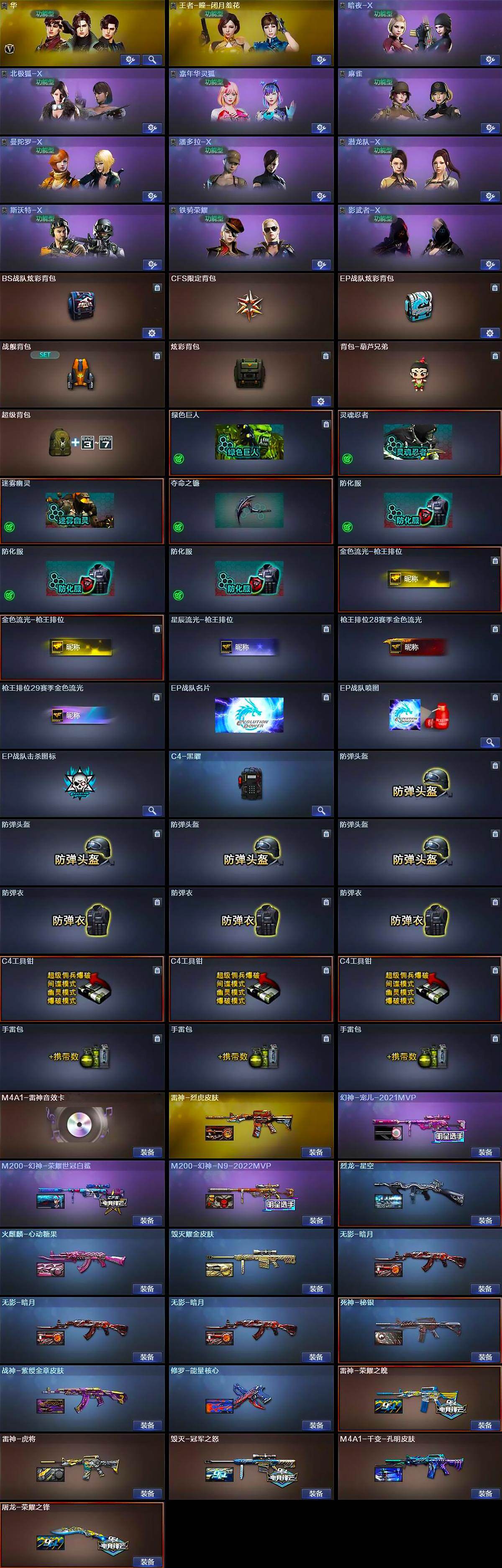 【道具】:BS战队炫彩背包,CFS限定背包,EP战队炫彩背包,战舰背包,炫彩背包,背包-葫芦兄弟,超级背包,绿色巨人,灵魂忍者,迷雾幽灵,夺命之镰,防化服*3,金色流光-枪王排位*2,星辰流光-枪王排位,枪王排位28赛季金色流光,枪王排位29赛季金色流光,EP战队名片,EP战队喷图,EP战队击杀图标,C4-黑曜,防弹头盔*4,防弹衣*3,C4工具钳*3,手雷包*3