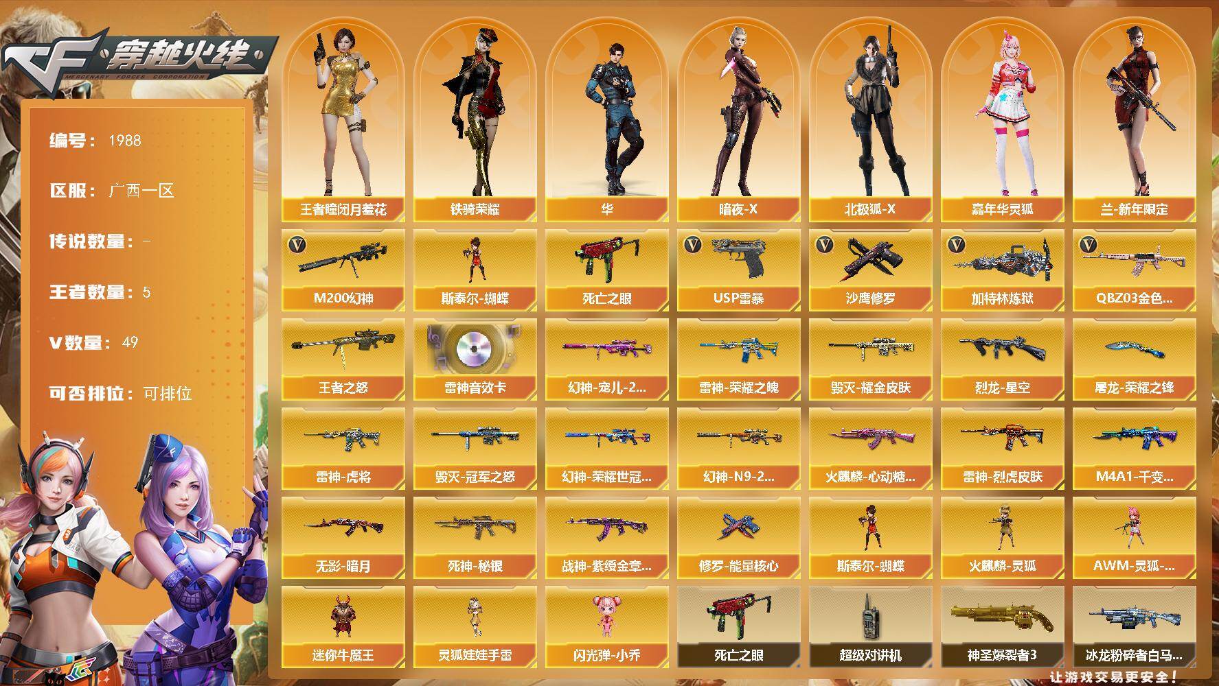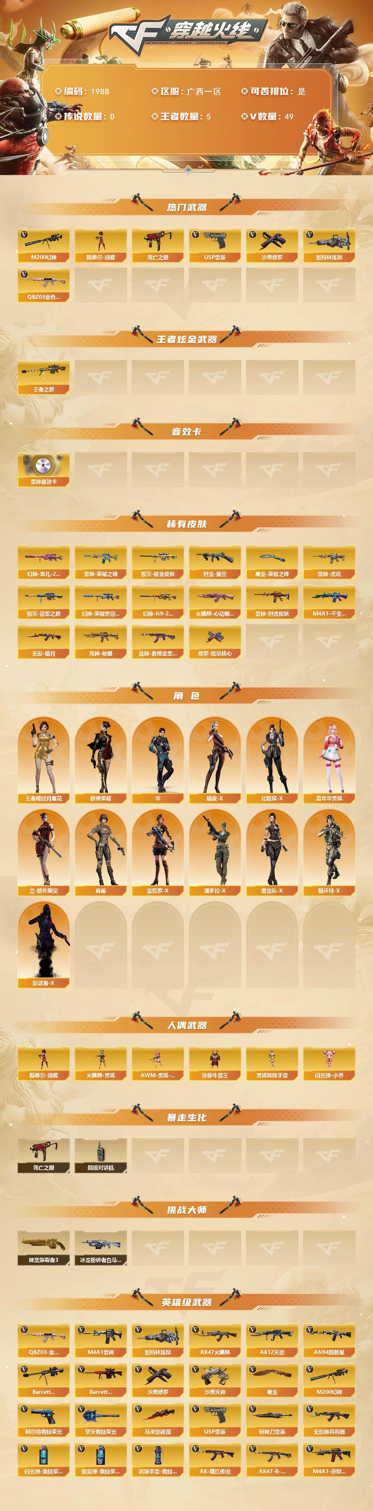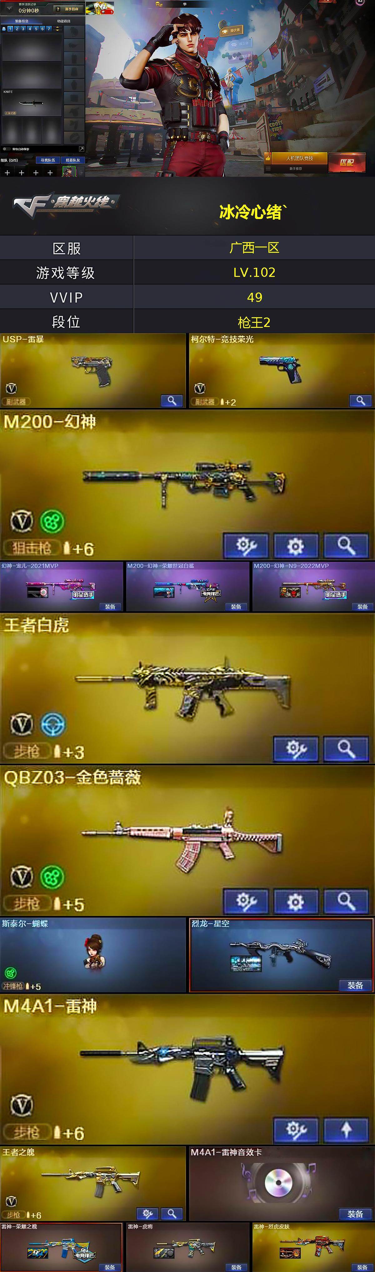 [16499144]广西一区-53V-5王者武器数-0炫金武器数 【热门武器】:QBZ03-金色蔷薇,M200-幻神,死亡之眼,加特林-炼狱,斯泰尔-蝴蝶,USP-雷暴,沙鹰-修罗 【王者炫金武器】:王者之怒 【音效卡】:M4A1-雷神音效卡 【皮肤】:幻神-宠儿-2021MVP,M200-幻神-荣耀世冠白鲨,M200-幻神-N9-2022MVP,烈龙-星空,雷神-荣耀之魄,雷神-虎将,雷神-烈虎皮肤,火麒麟-心动糖果,毁灭耀金皮肤,毁灭-冠军之怒,M4A1-千变-孔明皮肤,无影-暗月*3,死神-秘银,战神-紫绶金章皮肤,修罗-能量核心,屠龙-荣耀之锋 【角色】:华,王者-瞳-闭月羞花,暗夜-X,北极狐-X,嘉年华灵狐,兰-新年限定,麻雀,曼陀罗-X,潘多拉-X,潜龙队-X,斯沃特-X,铁骑荣耀,影武者-X 【人偶武器】:火麒麟-灵狐,斯泰尔-蝴蝶,AWM-灵狐-15周年嘉年华,迷你牛魔王,闪光弹-小乔,灵狐娃娃手雷 【暴走生化】:死亡之眼,超级对讲机 【挑战大师】:神圣爆裂者III*2,冰龙粉碎者-白马银枪 【英雄级武器】:AK47-火麒麟,M4A1-雷神,AK12-天启,AN94-超新星,无影-神兵利器,QBZ03-金色蔷薇,王者之魄-觉醒版,AK-47-猩红传说,AK47-B-战神,王者之烈-觉醒版,王者白虎-觉醒版,Barrett-毁灭,Barrett-极光,M200-幻神,加特林-炼狱,沙鹰-修罗,沙鹰-天神,USP-雷暴,柯尔特-竞技荣光,屠龙*2,马来剑-夜魔,擎天-竞技荣光,斩神刀-雷暴,高爆手雷-雷暴*4,高爆手雷-夜魔,高爆手雷-竞技荣光*2,闪光弹-雷暴*4,闪光弹-夜魔,闪光弹-幻灵,闪光弹-竞技荣光*2,烟雾弹-雷暴*4,烟雾弹-夜魔,烟雾弹-幻灵,烟雾弹-竞技荣光*2,M4A1-赤狱骑士 【道具】:BS战队炫彩背包,CFS限定背包,EP战队炫彩背包,战舰背包,炫彩背包,背包-葫芦兄弟,超级背包,绿色巨人,灵魂忍者,迷雾幽灵,夺命之镰,防化服*3,金色流光-枪王排位*2,星辰流光-枪王排位,枪王排位28赛季金色流光,枪王排位29赛季金色流光,EP战队名片,EP战队喷图,EP战队击杀图标,C4-黑曜,防弹头盔*4,防弹衣*3,C4工具钳*3,手雷包*3 【特殊枪械】:蝴蝶斯泰尔+0烈龙,1炼狱,1蝴蝶斯泰尔