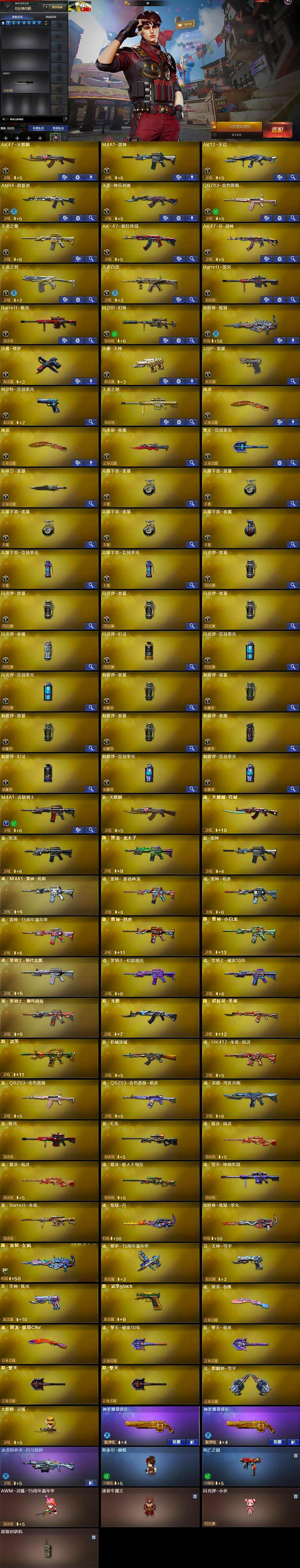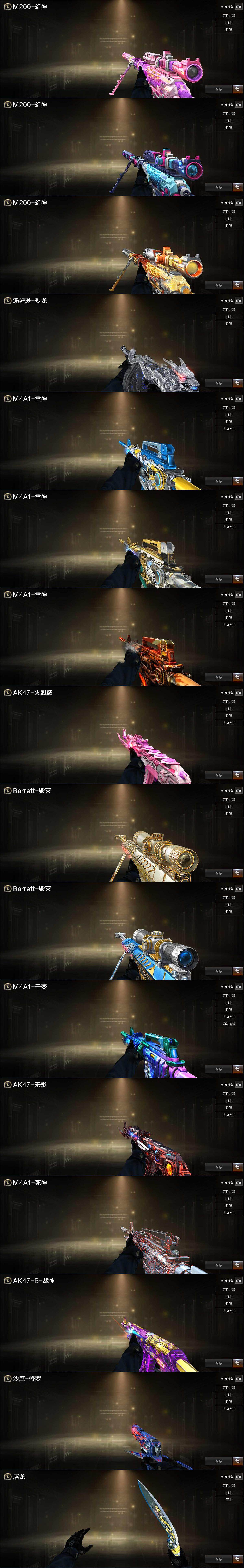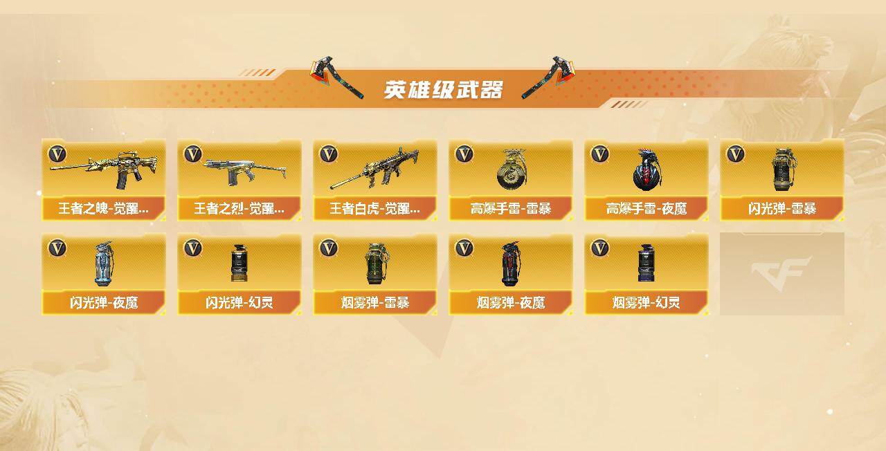 【英雄级武器】:AK47-火麒麟,M4A1-雷神,AK12-天启,AN94-超新星,无影-神兵利器,QBZ03-金色蔷薇,王者之魄-觉醒版,AK-47-猩红传说,AK47-B-战神,王者之烈-觉醒版,王者白虎-觉醒版,Barrett-毁灭,Barrett-极光,M200-幻神,加特林-炼狱,沙鹰-修罗,沙鹰-天神,USP-雷暴,柯尔特-竞技荣光,屠龙*2,马来剑-夜魔,擎天-竞技荣光,斩神刀-雷暴,高爆手雷-雷暴*4,高爆手雷-夜魔,高爆手雷-竞技荣光*2,闪光弹-雷暴*4,闪光弹-夜魔,闪光弹-幻灵,闪光弹-竞技荣光*2,烟雾弹-雷暴*4,烟雾弹-夜魔,烟雾弹-幻灵,烟雾弹-竞技荣光*2,M4A1-赤狱骑士