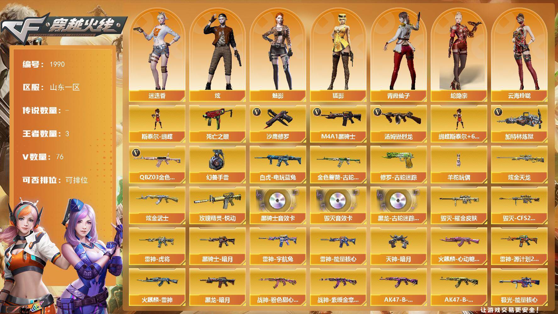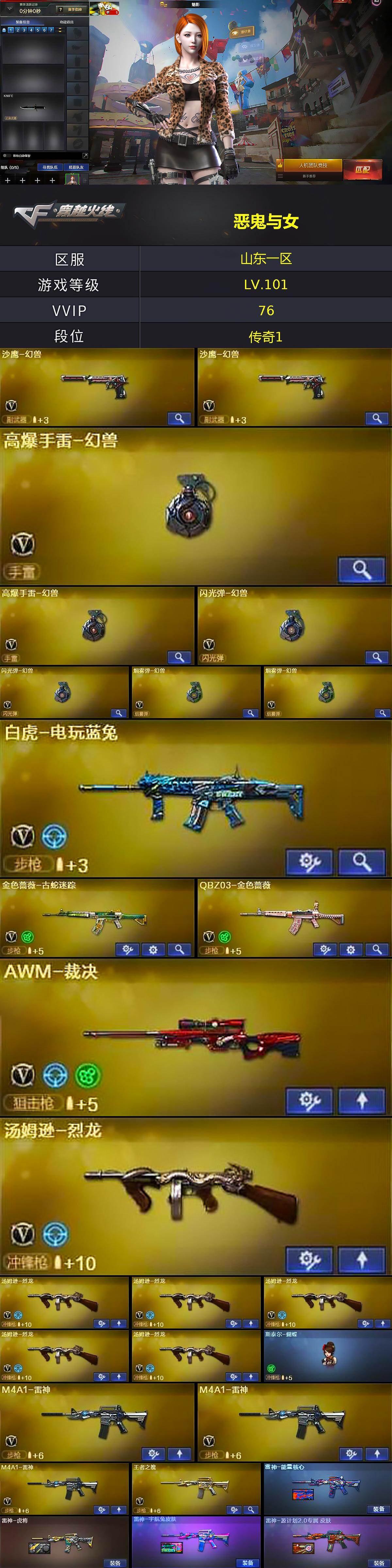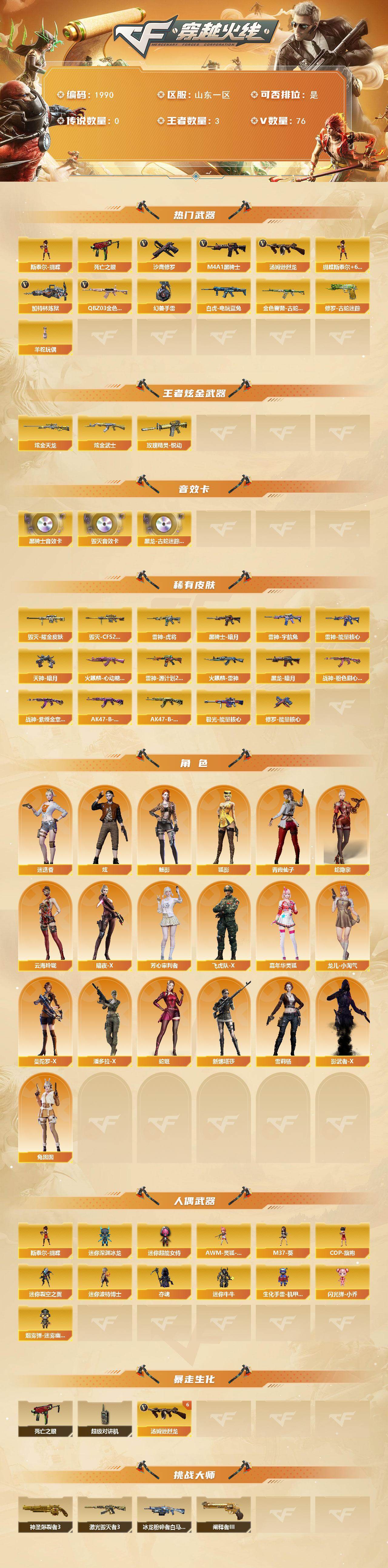[16499325]山东一区-79V-3王者武器数-2炫金武器数 【热门武器】:QBZ03-金色蔷薇,金色蔷薇-古蛇迷踪,修罗-古蛇迷踪,死亡之眼,白虎-电玩蓝兔,M4A1-黑骑士,汤姆逊-烈龙*6,加特林-炼狱,斯泰尔-蝴蝶,羊驼玩偶,沙鹰-修罗*3,高爆手雷-幻兽*2 【王者炫金武器】:玫瑰精灵-悦动,炫金武士,炫金天龙 【音效卡】:黑龙-古蛇迷踪音效卡,M4A1-黑骑士音效卡,Barrett-毁灭音效卡 【皮肤】:雷神-能量核心,雷神-虎将,雷神-宇航兔皮肤,雷神-源计划2.0专属 皮肤,火麒麟-雷神,火麒麟-心动糖果,毁灭耀金皮肤,毁灭-CFS2020,黑龙-暗月,黑骑士-暗月,战神-粉色甜心皮肤*2,战神-紫绶金章皮肤,AK47-B-常胜将军-曹操*2,AK47-B-常胜将军-孙权,极光-能量核心,修罗-能量核心*3,天神-暗月 【角色】:魅影,炫,迷迭香,狐影,蛇隐宗,云海玲珑,暗夜-X,芳心审判者,飞虎队-X,嘉年华灵狐,龙儿-小淘气,曼陀罗-X,潘多拉-X,青霞仙子,蛇姬,兔囡囡,新娜塔莎,雪莉杨,影武者-X 【人偶武器】:斯泰尔-蝴蝶,AWM-灵狐-15周年嘉年华,M37-葵,COP-旗袍,迷你深渊冰龙,迷你裂空之翼,迷你波特博士,夺魂,迷你牛牛,生化手雷-机甲核心*2,闪光弹-小乔*2,迷你超能女侍,烟雾弹-迷雾幽灵 【暴走生化】:死亡之眼,超级对讲机 【挑战大师】:神圣爆裂者III,冰龙粉碎者-白马银枪,激光毁灭者III,阐释者III 【英雄级武器】:AK47-火麒麟*2,M4A1-黑龙*2,M4A1-雷神*3,M4A1-黑骑士,AN94-超新星,AK47-机械迷城,无影-神兵利器,黑武士-锦绣游龙,金色蔷薇-古蛇迷踪,QBZ03-金色蔷薇,M4A1-猎神,王者之魄-觉醒版,AK47-B-战神,白虎-电玩蓝兔,Barrett-毁灭,Barrett-极光*2,AWM-裁决,Barrett-金色蔷薇,加特林-炼狱,汤姆逊-烈龙*6,沙鹰-修罗*3,沙鹰-天神,沙鹰-幻兽*2,修罗-古蛇迷踪,屠龙*4,擎天*2,斩神刀-雷暴,女皇利刃-幻兽,王者之锋-觉醒版,高爆手雷-雷霆,高爆手雷-幻兽*2,高爆手雷-雷暴*3,高爆手雷-古蛇迷踪,闪光弹-雷霆,闪光弹-幻兽*2,闪光弹-雷暴*3,烟雾弹-雷霆,烟雾弹-幻兽*2,烟雾弹-雷暴*3,烟雾弹-古蛇迷踪,M4A1-赤狱骑士