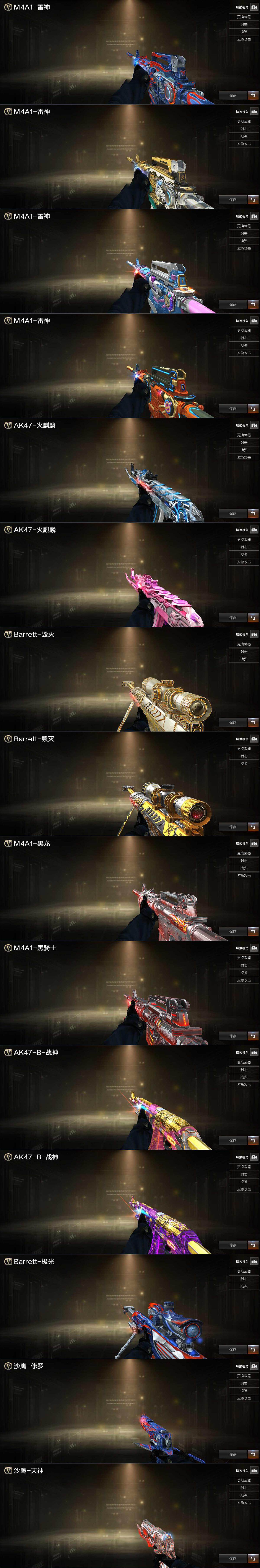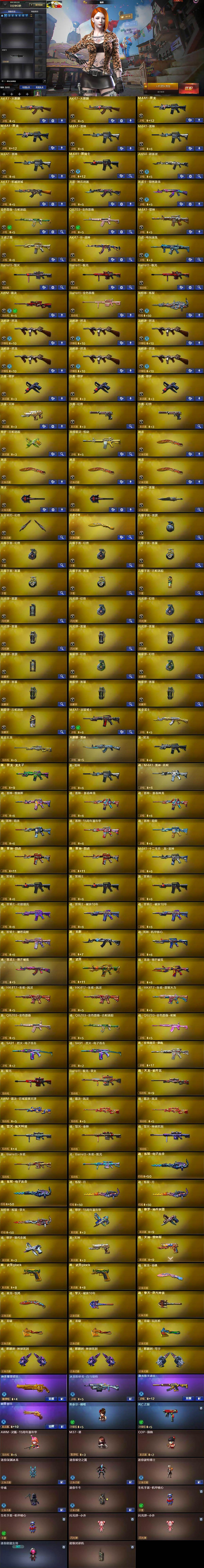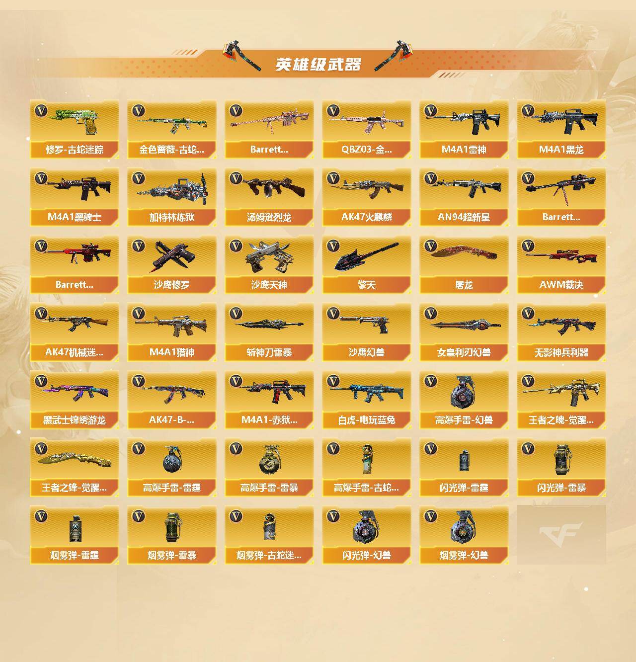【英雄级武器】:AK47-火麒麟*2,M4A1-黑龙*2,M4A1-雷神*3,M4A1-黑骑士,AN94-超新星,AK47-机械迷城,无影-神兵利器,黑武士-锦绣游龙,金色蔷薇-古蛇迷踪,QBZ03-金色蔷薇,M4A1-猎神,王者之魄-觉醒版,AK47-B-战神,白虎-电玩蓝兔,Barrett-毁灭,Barrett-极光*2,AWM-裁决,Barrett-金色蔷薇,加特林-炼狱,汤姆逊-烈龙*6,沙鹰-修罗*3,沙鹰-天神,沙鹰-幻兽*2,修罗-古蛇迷踪,屠龙*4,擎天*2,斩神刀-雷暴,女皇利刃-幻兽,王者之锋-觉醒版,高爆手雷-雷霆,高爆手雷-幻兽*2,高爆手雷-雷暴*3,高爆手雷-古蛇迷踪,闪光弹-雷霆,闪光弹-幻兽*2,闪光弹-雷暴*3,烟雾弹-雷霆,烟雾弹-幻兽*2,烟雾弹-雷暴*3,烟雾弹-古蛇迷踪,M4A1-赤狱骑士
