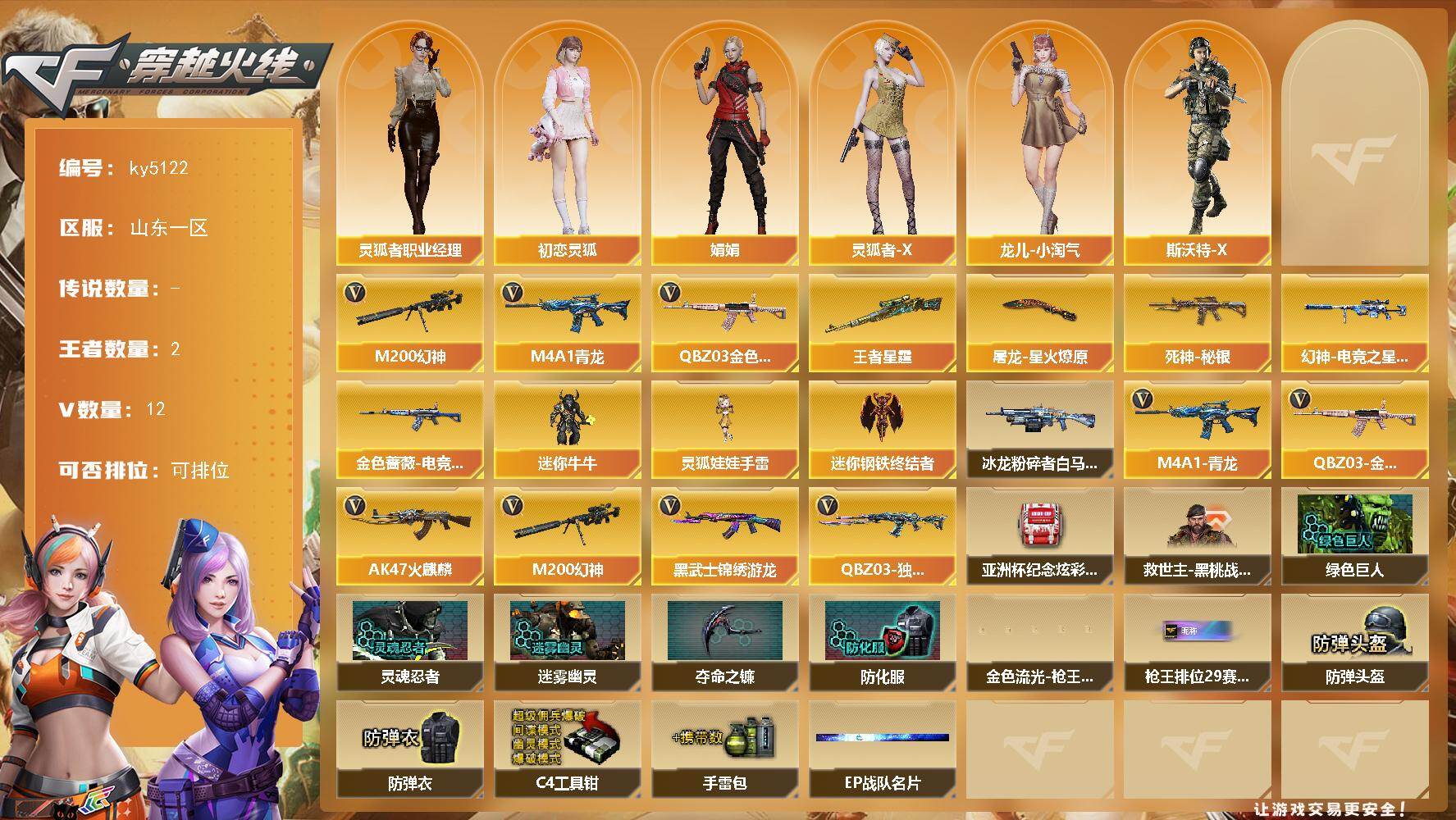 [16500330]山东一区-12V-2王者-0炫金 【热门武器】:QBZ03-金色蔷薇,M4A1-青龙,M200-幻神 【王者炫金武器】:王者星霆 【皮肤】:幻神-电竞之星 皮肤,金色蔷薇-电竞之星 皮肤,死神-秘银,屠龙-星火燎原 【角色】:初恋灵狐,娟娟,灵狐者-X,灵狐者-职业经理,龙儿-小淘气,斯沃特-X 【人偶武器】:迷你钢铁终结者,迷你牛牛,灵狐娃娃手雷*2 【挑战大师】:冰龙粉碎者-白马银枪 【英雄级武器】:AK47-火麒麟,M4A1-青龙,黑武士-锦绣游龙,QBZ03-独角-VI,QBZ03-金色蔷薇,M200-幻神 【道具】:亚洲杯纪念炫彩背包,救世主-黑桃战神,绿色巨人,灵魂忍者*2,迷雾幽灵,夺命之镰,防化服*2,金色流光-枪王排位*2,星辰流光-枪王排位,枪王排位28赛季金色流光,枪王排位29赛季金色流光,EP战队名片,防弹头盔*2,防弹衣*2,C4工具钳*2,手雷包*2 【特殊枪械】: