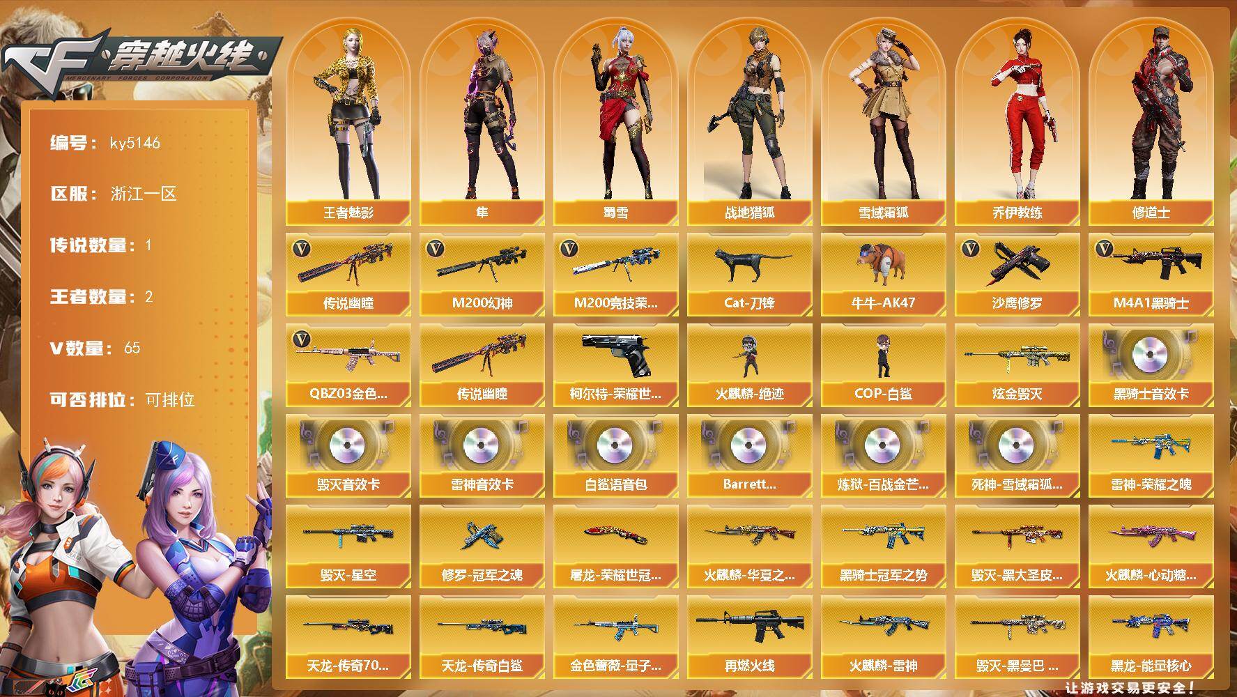 [16502104]浙江一区-68V-2王者武器数-1炫金武器数 【传说武器】:传说幽瞳 【热门武器】:传说幽瞳,QBZ03-金色蔷薇,M200-幻神,柯尔特-荣耀世冠白鲨2023,M200-竞技荣光,Cat-刀锋,牛牛-AK47,M4A1-黑骑士,火麒麟-绝迹,COP-白鲨,沙鹰-修罗 【王者炫金武器】:炫金毁灭 【音效卡】:M4A1-雷神音效卡,M4A1-黑骑士音效卡,Barrett-毁灭音效卡,白鲨语音包,Barrett-碧霄极光音效卡,炼狱-百战金芒-庆典舞曲音效卡,死神-雪域霜狐-怀旧音效卡 【皮肤】:金色蔷薇-量子蔷薇 皮肤,雷神-荣耀之魄,M4A1-再燃火线,火麒麟-雷神*2,火麒麟-华夏之心,火麒麟-心动糖果,毁灭-星空,毁灭-黑大圣皮肤,毁灭-黑曼巴 皮肤,黑龙-能量核心,黑骑士-冠军之势,战神-流金岁月皮肤,AWM-天龙-传奇70KG,AWM-天龙-传奇白鲨,AWM-再燃火线,修罗-冠军之魂,屠龙-荣耀世冠AG,轻型军用手斧-再燃火线 【角色】:隼,战地猎狐,王者-魅影,雪域霜狐,乔伊教练,修道士,暗夜-X,北极狐-X,初恋灵狐,飞虎队-X,风暴女,嘉年华灵狐,兰-新年限定,灵狐-花神,龙儿-小淘气,麻雀,曼陀罗-X,玫瑰花神,潘多拉-X,潘多拉-甜心教官,潜龙队-X,斯沃特-X,蜀雪,新娜塔莎,影武者-X,游珑儿,海豹突击队 【人偶武器】:火麒麟-绝迹,COP-白鲨,巴雷特-零-水下丽影,AWM-灵狐-15周年嘉年华,M37-葵,Cat-刀锋,牛牛-AK47,迷你牛牛 【英雄级武器】:AK47-火麒麟,M4A1-黑龙,M4A1-雷神,M4A1-黑骑士,无影-神兵利器,黑武士-锦绣游龙,FAMAS G2-天戎,死神-雪域霜狐,SCAR Light-玄豹,QBZ03-金色蔷薇,M4A1-猎神,王者之势-觉醒版,AK-47-猩红传说*2,AWM-天龙,Barrett-毁灭,AWM-裁决,M200-幻神,M200-竞技荣光,王者风神-觉醒版,炼狱-百战金芒,沙鹰-修罗,沙鹰-天神,柯尔特-荣耀世冠白鲨2023,柯尔特-竞技荣光,屠龙,麒麟刺-堕天神,幻灵之锋,擎天-竞技荣光,龙啸-堕天神,麒麟刺-百战金芒,丛林匕首-玄豹,高爆手雷-堕天神*3,高爆手雷-幻灵*2,高爆手雷-竞技荣光*2,高爆手雷-玄豹,闪光弹-堕天神*3,闪光弹-幻灵,闪光弹-竞技荣光*2,闪光弹-玄豹