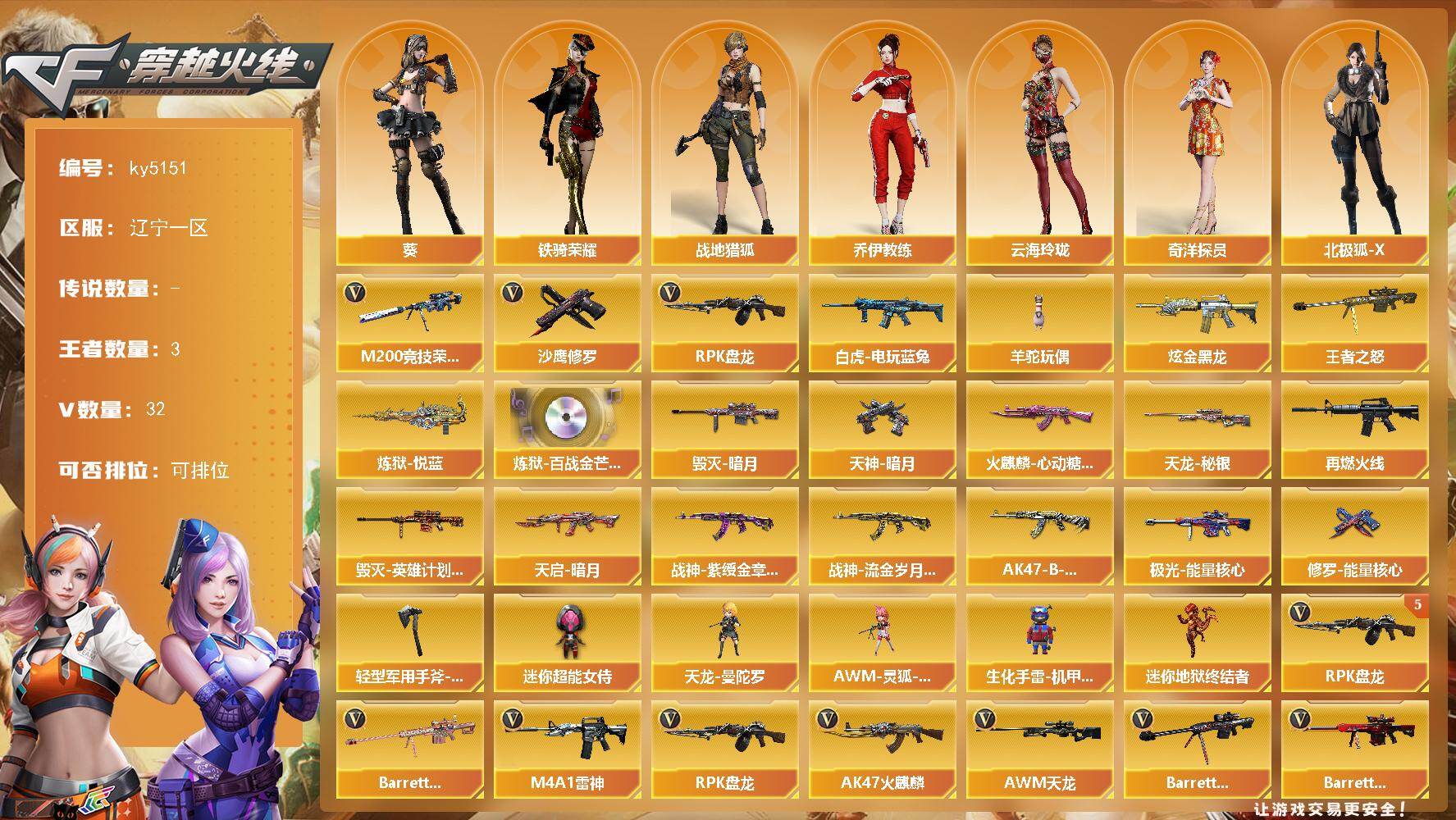 [16502201]辽宁一区-33V-3王者武器数-1炫金武器数 【热门武器】:M200-竞技荣光,白虎-电玩蓝兔,RPK-盘龙*5,羊驼玩偶,沙鹰-修罗 【王者炫金武器】:王者之怒,炼狱-悦蓝,炫金黑龙 【音效卡】:炼狱-百战金芒-庆典舞曲音效卡 【皮肤】:M4A1-再燃火线,火麒麟-心动糖果,毁灭-暗月*3,毁灭-英雄计划 皮肤,天启-暗月*4,战神-紫绶金章皮肤,战神-流金岁月皮肤,AK47-B-常胜将军-刘备,天龙-秘银*2,极光-能量核心,修罗-能量核心,天神-暗月*2,轻型军用手斧-再燃火线 【角色】:葵,战地猎狐,奇洋探员,乔伊教练,云海玲珑,北极狐-X,初恋灵狐,风暴女,嘉年华灵狐,娟娟,潘多拉-X,潘多拉-甜心教官,斯沃特-X,铁骑荣耀,兔囡囡,维纳斯,影武者-X,游珑儿 【人偶武器】:天龙-曼陀罗,迷你地狱终结者,AWM-灵狐-15周年嘉年华,生化手雷-机甲核心,迷你超能女侍 【英雄级武器】:AK47-火麒麟*2,M4A1-雷神,AK47-机械迷城,AK-47-猩红传说,白虎-电玩蓝兔,AWM-天龙*2,Barrett-毁灭,Barrett-极光,M200-竞技荣光,Barrett-金色蔷薇,王者之力-觉醒版,RPK-盘龙*5,炼狱-百战金芒,沙鹰-修罗,屠龙,龙啸,擎天,麒麟刺-百战金芒,高爆手雷-竞技荣光,M4A1-赤狱骑士,AWM-昌龙 【道具】:云海游龙炫彩背包,亚洲杯纪念炫彩背包,女皇终结者-背包,炫彩背包,百战金芒炫彩背包,圣拳猎手-炽雪,女皇终结者-魔龙之吻,救世主-黑桃战神,黄金生化钩,绿色巨人,灵魂忍者*3,变异宝贝,迷雾幽灵,生化弹匣,夺命之镰,防化服*3,金色流光-枪王排位*2,星辰流光-枪王排位,流光-鎏金之域,枪王排位28赛季金色流光,枪王排位29赛季金色流光,语音特效-盛典烟火,萌萌小葵表情,电玩兔兔表情,炽雪表情,防弹头盔*3,防弹衣*3,C4工具钳*3,手雷包*3 【特殊枪械】:5盘龙