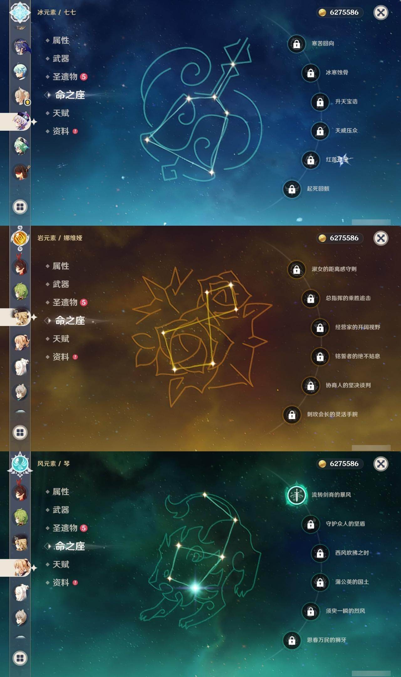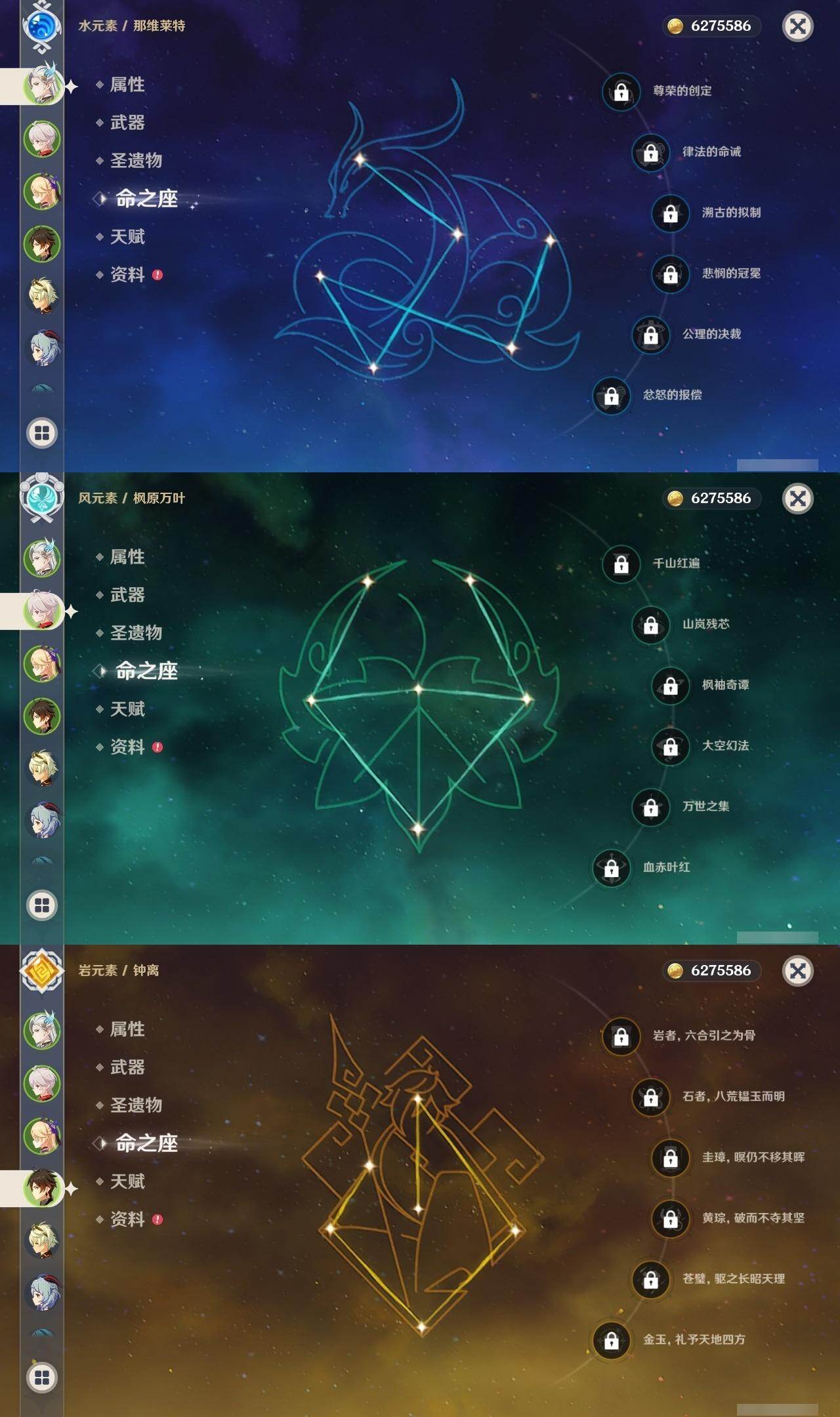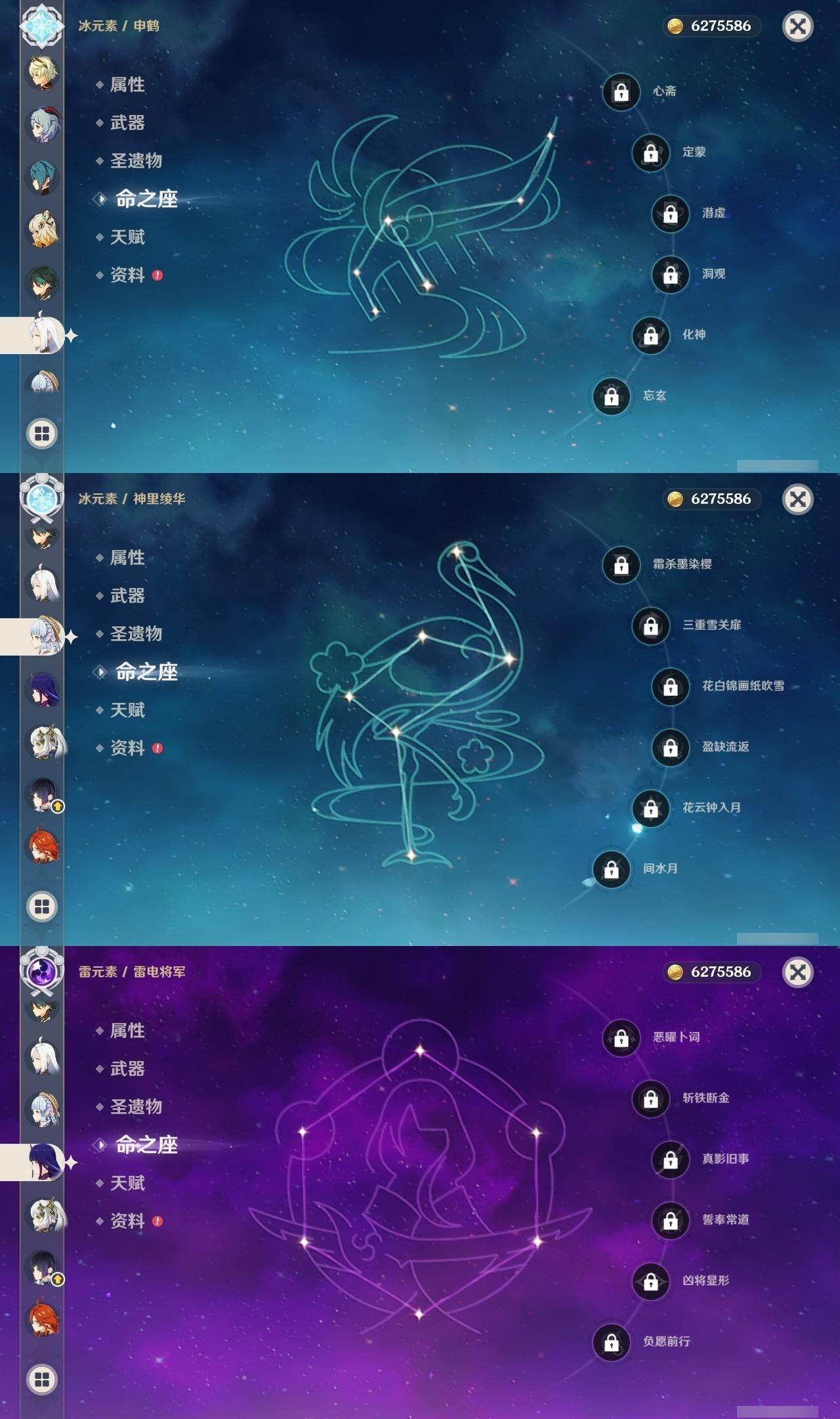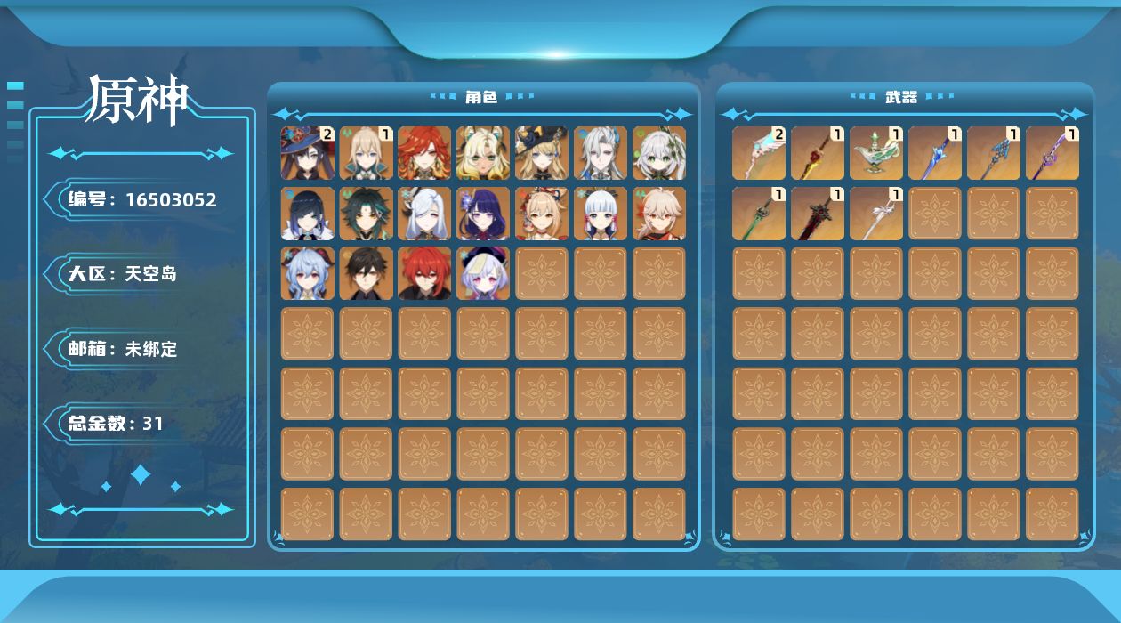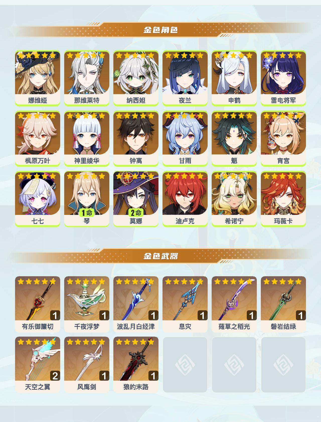 0命娜维娅,0命那维莱特,0命纳西妲,0命夜兰,0命申鹤,0命雷电将军,0命枫原万叶,0命神里绫华,0命钟离,0命甘雨,0命魈,0命宵宫,0命七七,1命琴,2命莫娜,0命迪卢克,0命希诺宁,0命玛薇卡,精1有乐御簾切,精1千夜浮梦,精1波乱月白经津,精1息灾,精1薙草之稻光,精1磐岩结绿,精2天空之翼,精1风鹰剑,精1狼的末路