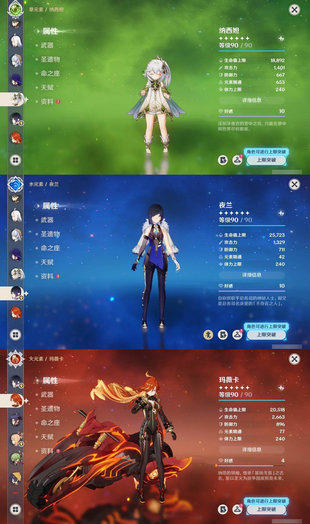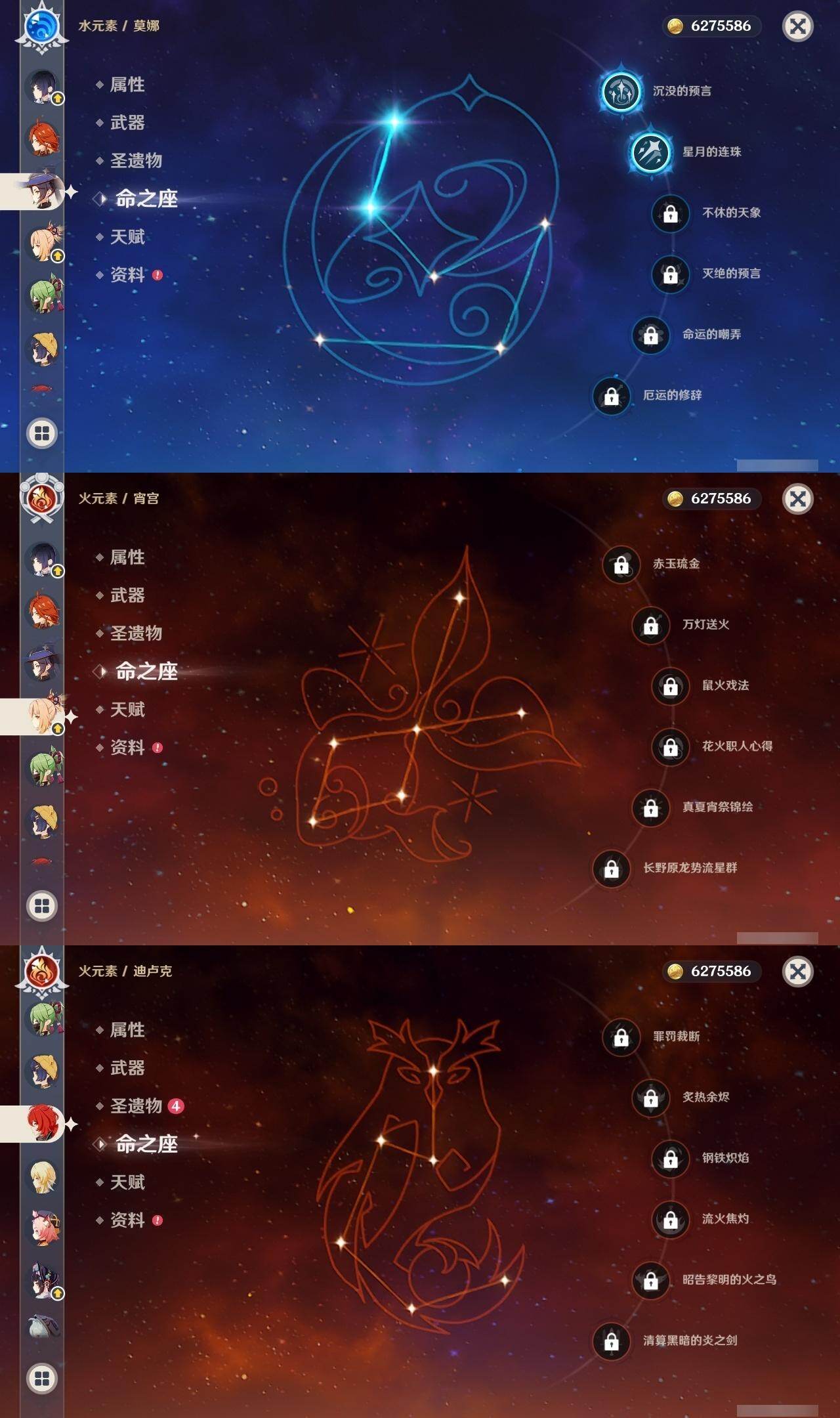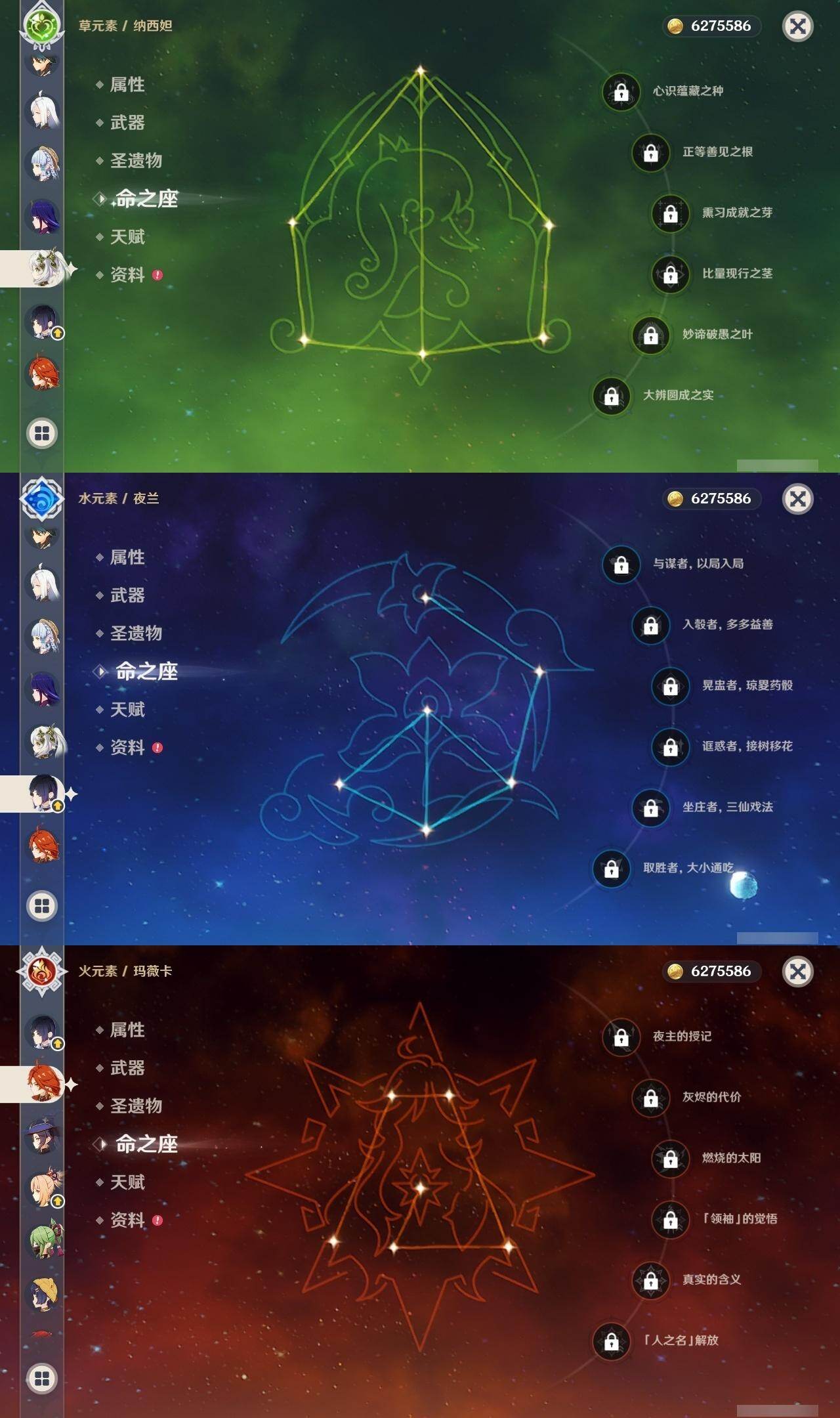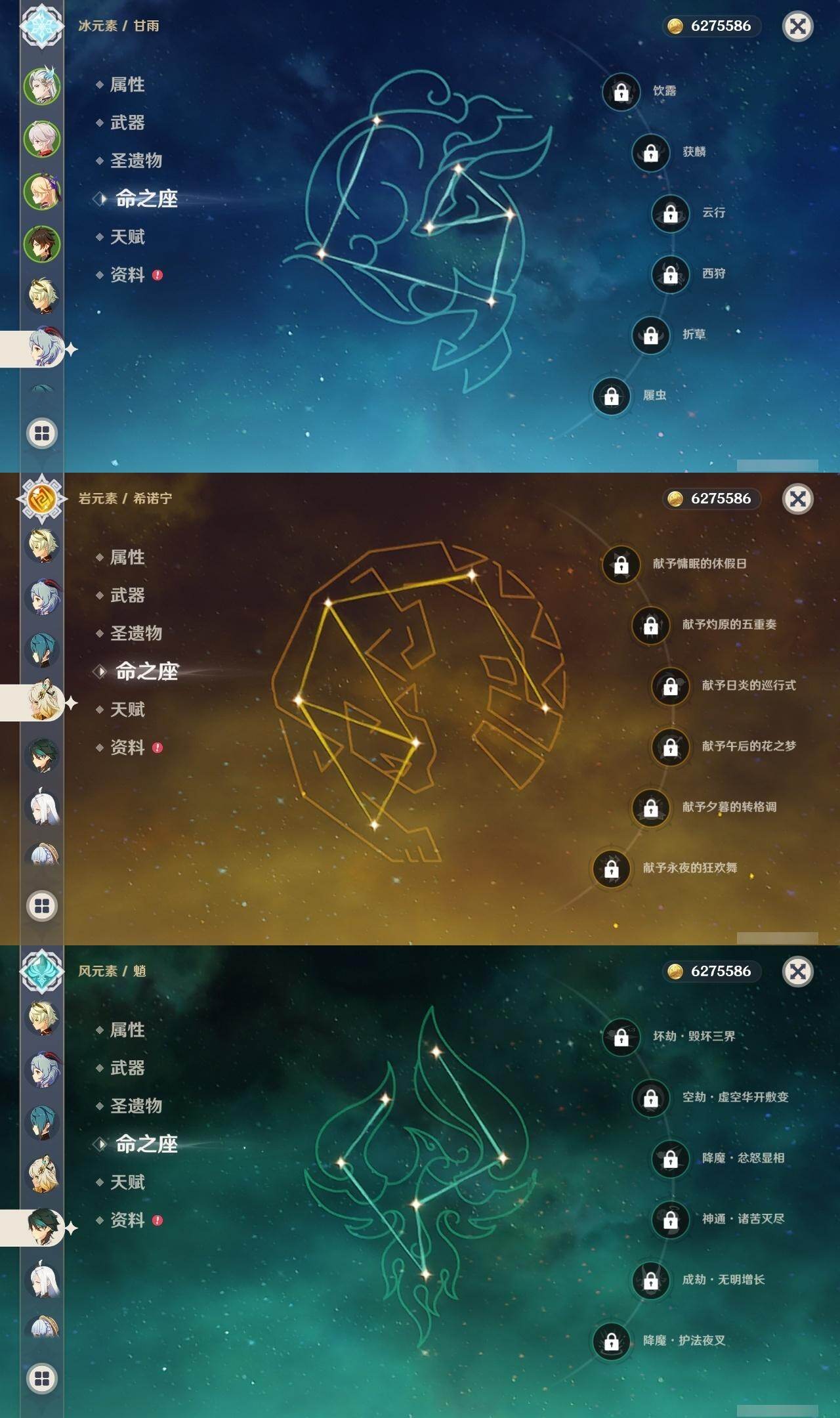 0命娜维娅,0命那维莱特,0命纳西妲,0命夜兰,0命申鹤,0命雷电将军,0命枫原万叶,0命神里绫华,0命钟离,0命甘雨,0命魈,0命宵宫,0命七七,1命琴,2命莫娜,0命迪卢克,0命希诺宁,0命玛薇卡,精1有乐御簾切,精1千夜浮梦,精1波乱月白经津,精1息灾,精1薙草之稻光,精1磐岩结绿,精2天空之翼,精1风鹰剑,精1狼的末路