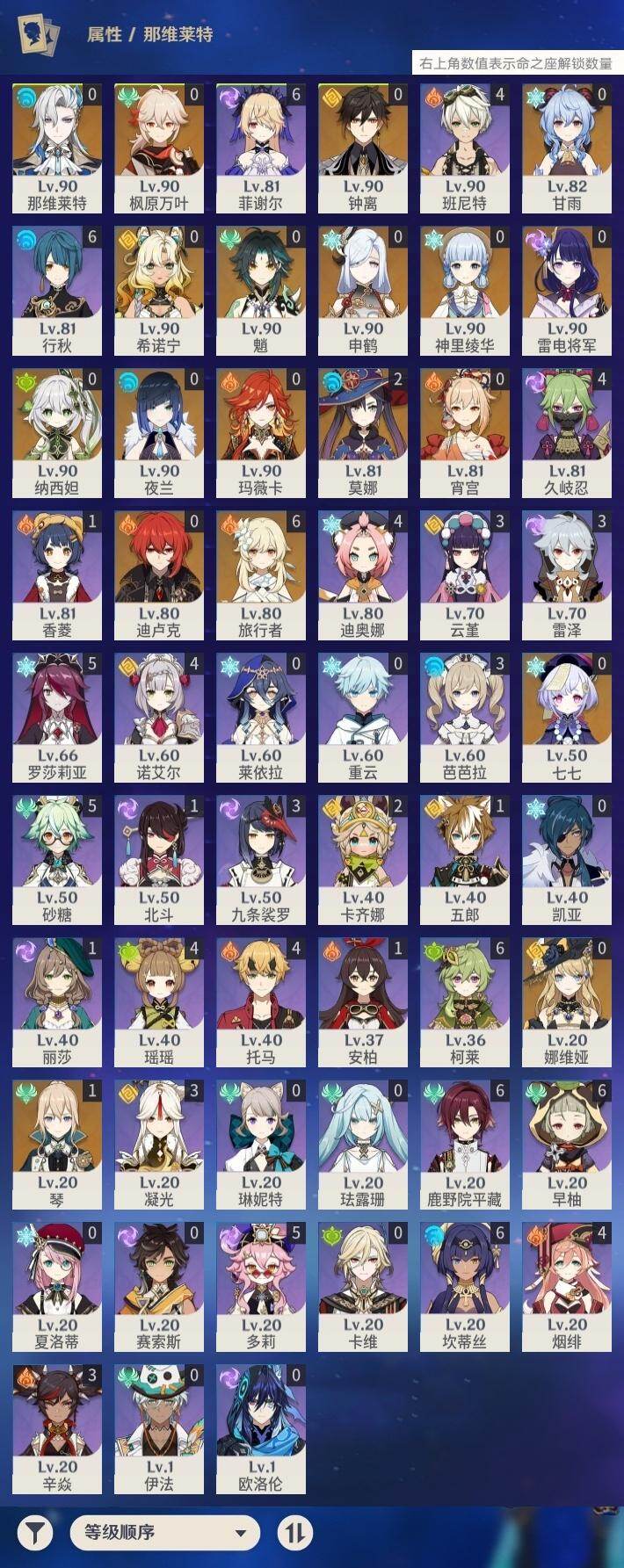 - [15231644]56级/21黄/女主/16个五星角色/1个五星武器 0命闲云,0命艾尔海森,0命流浪者,0命纳西妲,1命提纳里,0命八重神子,0命枫原万叶,0命神里绫华,0命胡桃,0命魈,0命温迪,0命七七,0命琴,0命莫娜,3命迪卢克,0命恰斯卡,精1天空之傲