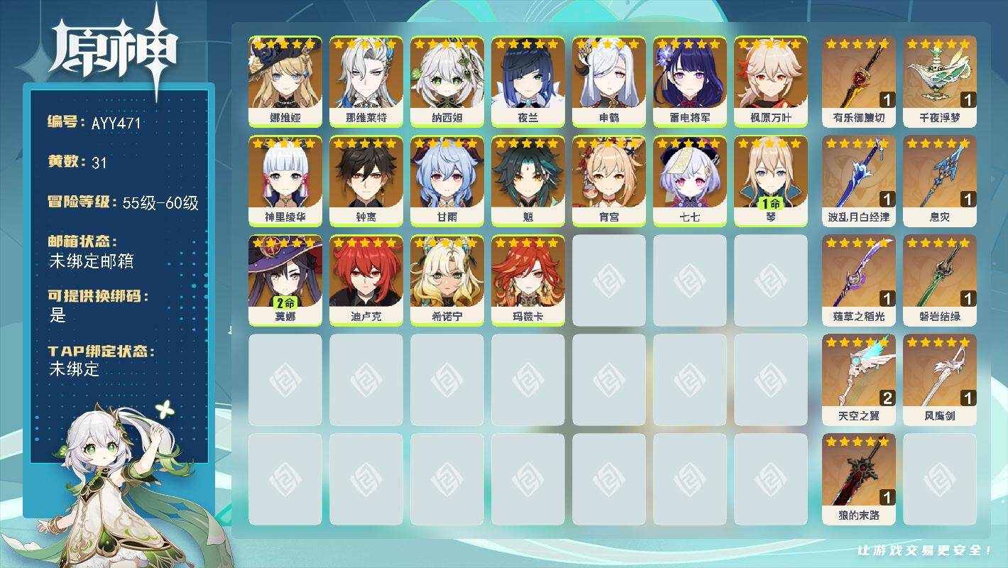 [16503052]【店主推荐捡漏号】59级/31黄/女主/18个五星角色/9个五星武器 0命娜维娅,0命那维莱特,0命纳西妲,0命夜兰,0命申鹤,0命雷电将军,0命枫原万叶,0命神里绫华,0命钟离,0命甘雨,0命魈,0命宵宫,0命七七,1命琴,2命莫娜,0命迪卢克,0命希诺宁,0命玛薇卡,精1有乐御簾切,精1千夜浮梦,精1波乱月白经津,精1息灾,精1薙草之稻光,精1磐岩结绿,精2天空之翼,精1风鹰剑,精1狼的末路