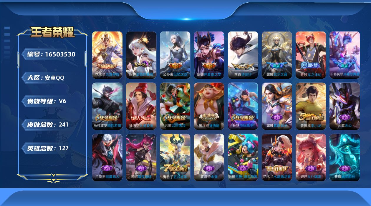 [16503530]【店主推荐捡漏号!可直接换绑】安卓Q-V6-最强王者段位-127英雄-241皮肤-1典藏皮肤-4传说-61史诗-1星元