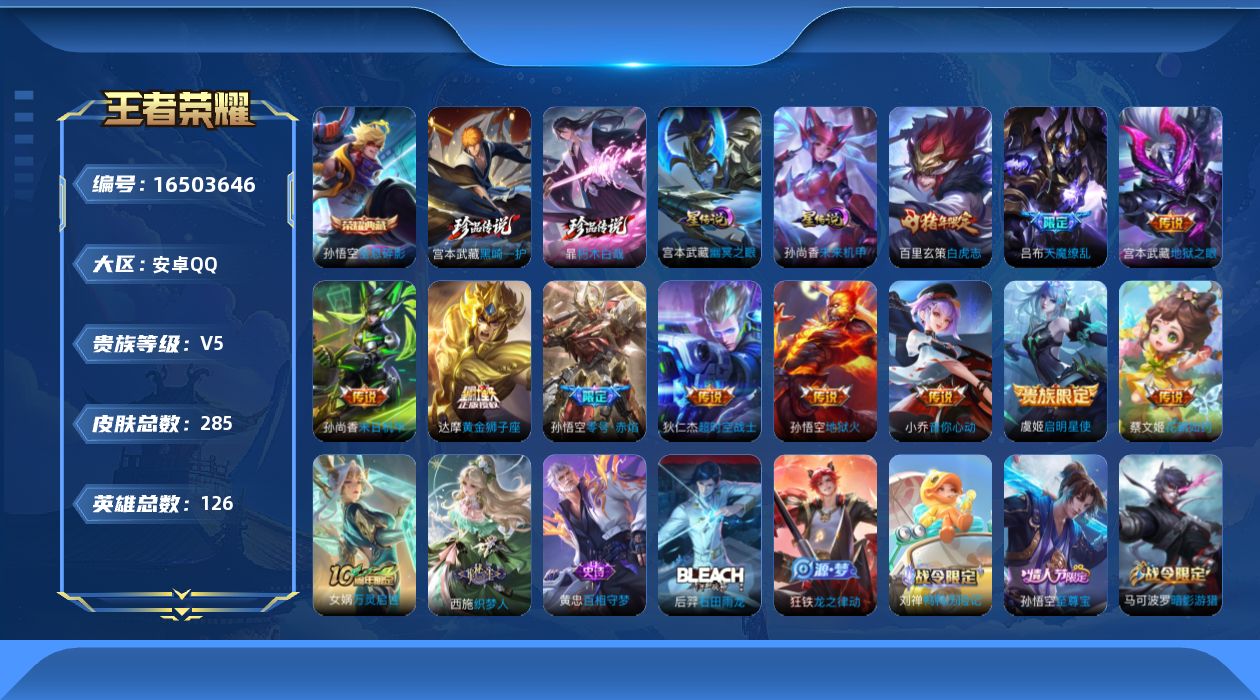 [16503646]【店主推荐捡漏号!可直接换绑】安卓Q-V8-永恒钻石II段位-126英雄-285皮肤-1典藏皮肤-2珍品传说-12传说-71史诗-2星元 【英雄全皮】:空空儿全皮 【荣耀典藏】:孙悟空全息碎影 【珍品传说】:暃朽木白哉,宫本武藏黑崎一护 【传说皮肤】:后羿神树通天,蔡文姬花朝如约,小乔音你心动,虞姬启明星使,孙悟空零号赤焰,达摩黄金狮子座,百里玄策白虎志,孙尚香末日机甲,宫本武藏地狱之眼,孙悟空地狱火,吕布天魔缭乱,狄仁杰超时空战士 【限定皮肤】:白起狰,大乔绒语心约,狄仁杰阴阳师,虞姬凯尔特女王,赵云皇家上将,墨子神迹守卫,鲁班七号狮舞东方,庄周蜃楼王,庄周高山流水,高渐离玩趣恶龙,阿轲迷踪丽影,扁鹊奇幻香踪,芈月重明,吕布天魔缭乱,吕布猎兽之王,吕布御风骁将,周瑜赤莲之焰,元歌云间偶戏,夏侯惇朔风刀,甄姬游园惊梦,曹操烛龙,曹操天狼征服者,典韦穷奇,马可波罗暗影游猎,狄仁杰魔术师,狄仁杰万华元夜,达摩星际陆战队,达摩沙漠行僧,项羽海滩派对,老夫子醍醐杖,老夫子航海奇遇记,关羽冰锋战神,程咬金演武夺筹,刘邦夺宝奇兵,韩信飞衡,兰陵王驯魔猎人,兰陵王金庭之子,亚瑟狮心王,亚瑟潮玩骑士王,孙悟空至尊宝,孙悟空大圣娶亲,孙悟空零号赤焰,牛魔御旌,后羿如梦令,李元芳银河之约,李元芳云中旅人,虞姬启明星使,钟馗神迹守卫,钟馗驱傩正仪,杨玉环遇见飞天,杨戬潮玩骑兵,雅典娜单词大作战,蔡文姬繁星吟游,太乙真人饕餮,鬼谷子原初探秘者,鬼谷子五谷丰年,铠青龙志,苏烈千军破阵,百里玄策白虎志,百里玄策原初追逐者,弈星混沌棋,沈梦溪星空之诺,沈梦溪大漠名商,明世隐疑决卦,裴擒虎李小龙,裴擒虎擒涛扼浪,狂铁御狮,米莱狄御霄,米莱狄胡桃异想国,云中君纤云弄巧,盾山御銮,猪八戒西部大镖客,上官婉儿梁祝,嫦娥拒霜思,蒙犽狂想玩偶喵,鲁班大师探海日志,桑启海盐诗旅,张良古海寻踪,蒙恬荣光圣徽 【年限皮肤】:百里玄策白虎志,铠青龙志,吕布御风骁将,韩信飞衡 【赛季限定】:庄周蜃楼王,白起狰,芈月重明,夏侯惇朔风刀,曹操烛龙,典韦穷奇,狄仁杰万华元夜,达摩沙漠行僧,老夫子醍醐杖,程咬金演武夺筹,兰陵王金庭之子,张良古海寻踪,亚瑟狮心王,牛魔御旌,李元芳云中旅人,虞姬凯尔特女王,钟馗驱傩正仪,太乙真人饕餮,鬼谷子原初探秘者,苏烈千军破阵,百里玄策原初追逐者,弈星混沌棋,沈梦溪大漠名商,明世隐疑决卦,