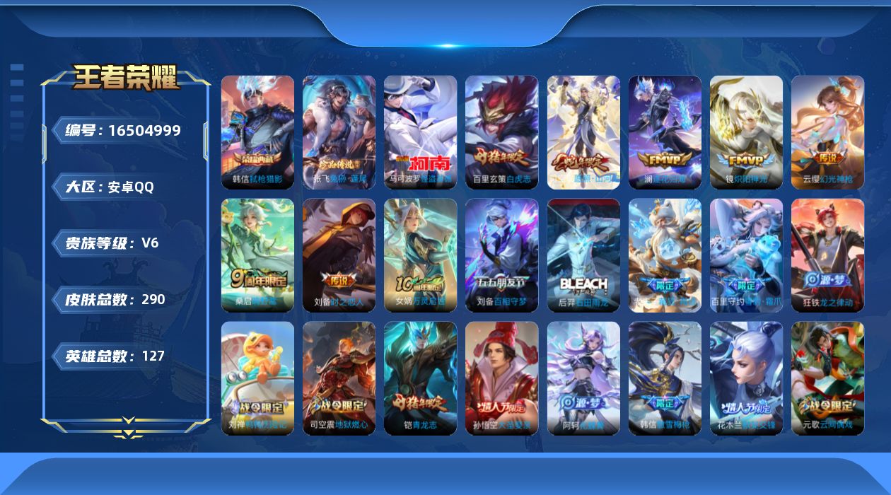 - PX_2095512-实名: 不可修改 性别: 男号 贵族等级: V7 英雄数: 123 皮肤数: 267 荣耀水晶: 最初的交响 无双皮: 器灵·螭龙剑 传说皮: 云鹰飞将,黄金白羊座,炽阳神光,末日机甲-孙尚香,琥珀纪元马超 限定皮: 遇见飞天,李小龙,天狼溯光者,神威,飞衡,梅西,默契交锋-花木兰,高山流水,匿光追影者,傲雪梅枪,寅虎·心曲,五谷丰年,鸣野蒿,陌上桑,映山客,愿照·岁时盈,愿