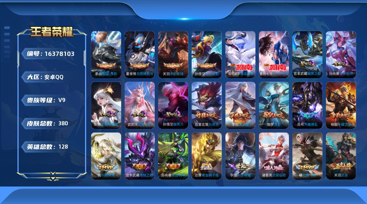 [16378103]【特价急出/详情看图】安卓Q-V9-最强王者段位-128英雄-380皮肤-4典藏皮肤-1典藏英雄-2珍品传说-5星元-30传说-122史诗