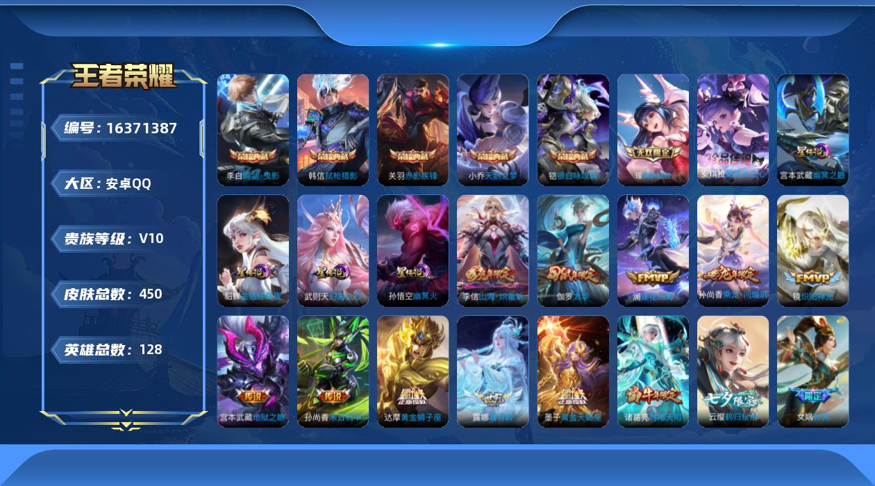 [16371387]【特价出售/店主推荐】安卓Q-V10-最强王者段位-128英雄-450皮肤-5典藏皮肤-1典藏英雄-1无双-1珍品传说-34传说-135史诗