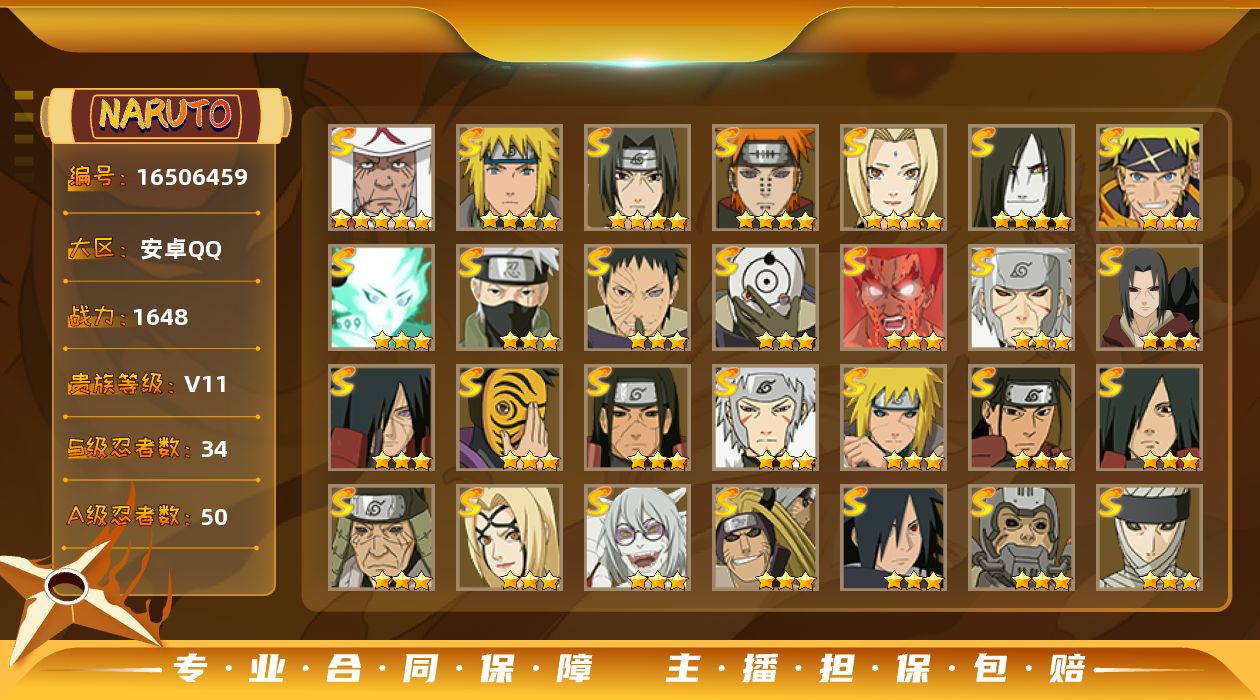 【S级忍者】:长门「秽土转生」(3星),半藏「秽土转生」(3星),金角·银角「秽土转生」(3星),猿飞日斩「秽土转生」(3星),波风水门「秽土转生」(3星),千手扉间「秽土转生」(3星),千手柱间「秽土转生」(3星),宇智波鼬「秽土转生」(3星),宇智波斑「秽土转生」(3星),宇智波带土「忍界大战」(3星),宇智波鼬「须佐能乎」(4星),旗木卡卡西「须佐能乎」(3星),宇智波斑「木叶创立」(3星),无「二代目土影」(3星),艾「四代目雷影」(3星),艾「三代目雷影」(3星),自来也(3星),自来也「仙人模式」(3星),自来也「舞之豪杰」(3星),大蛇丸(4星),纲手(4星),纲手「百豪」(3星),千手柱间(3星),千手扉间(3星),猿飞日斩(5星),宇智波斑(3星),波风水门(4星),药师兜「仙人模式」(3星),神秘面具男(3星),迈特凯「死门」(3星),佩恩「天道」(4星),宇智波斑 「白面具」(3星宇智波斑「白面具」),大筒木舍人「最终章」(3星),漩涡鸣人·宇智波佐助(3星)