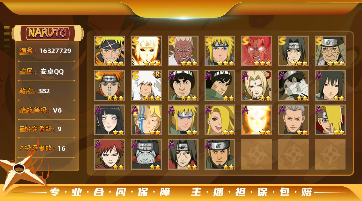 - [17154948]V12,1772万战力,40s,56a,198忍法帖已买,仙自72片,传自74片,带土59片