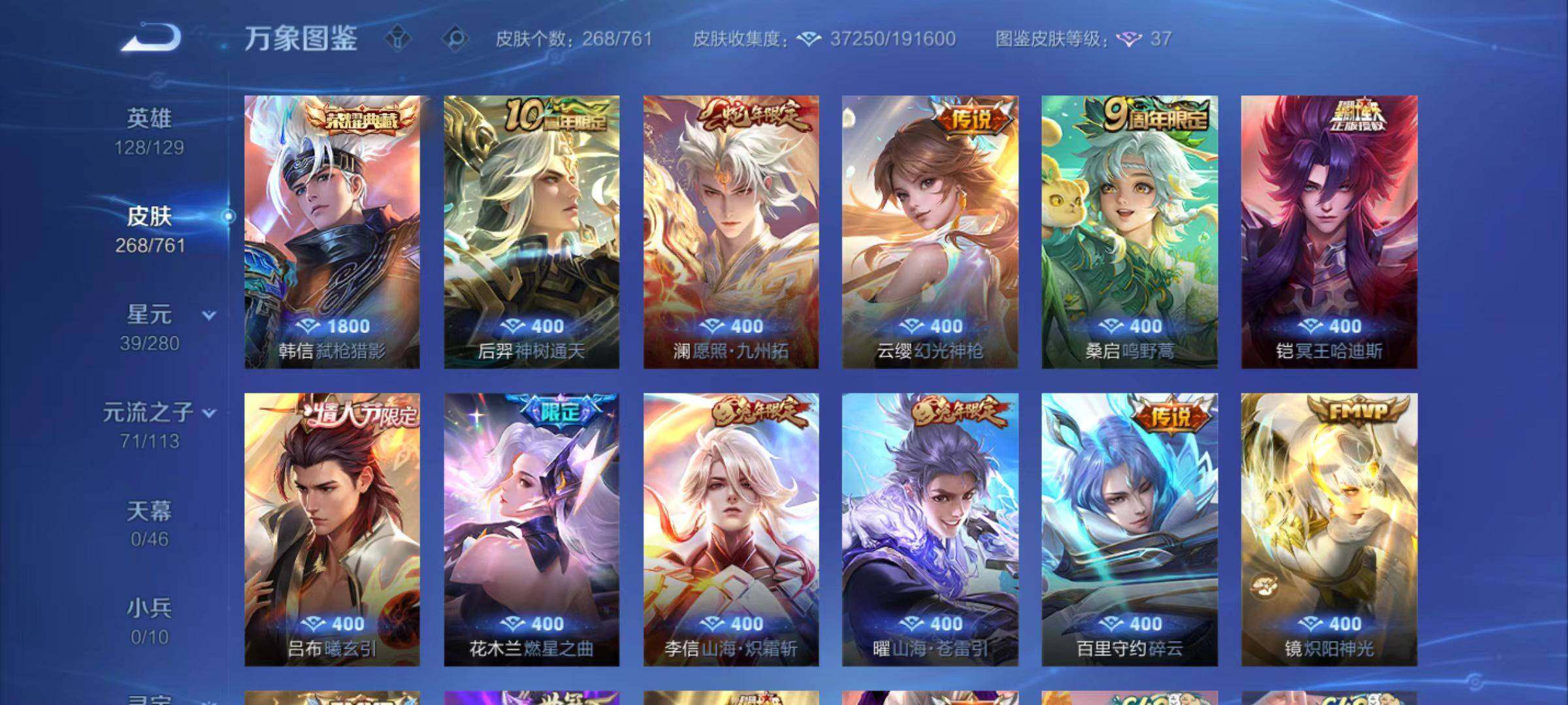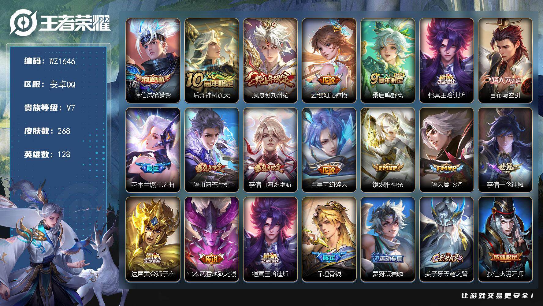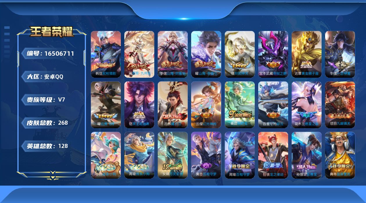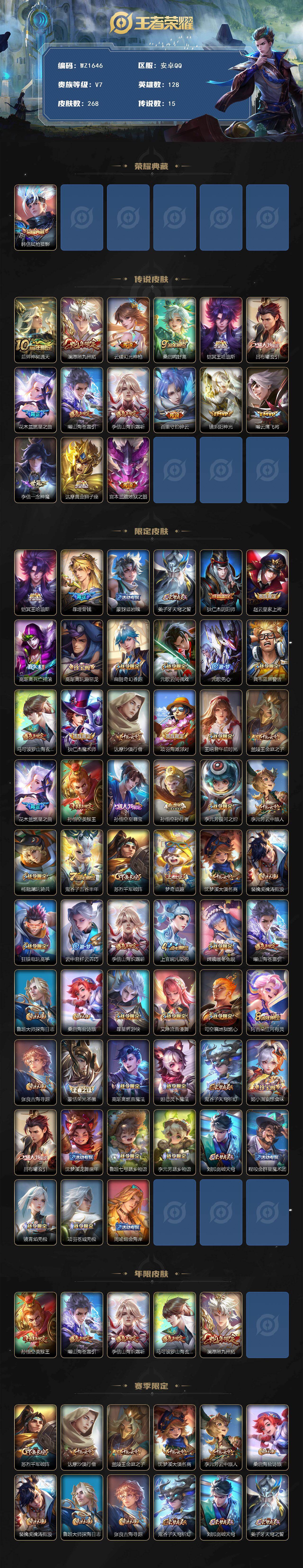 [16506711]安卓Q-V7-至尊星耀I段位-128英雄-268皮肤-1典藏皮肤-15传说-71史诗